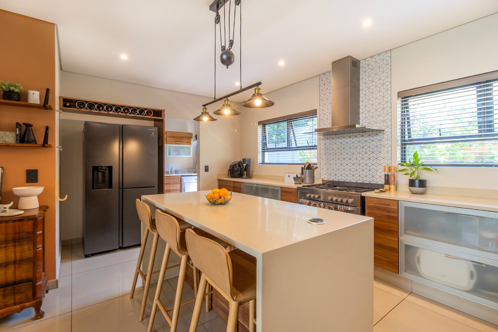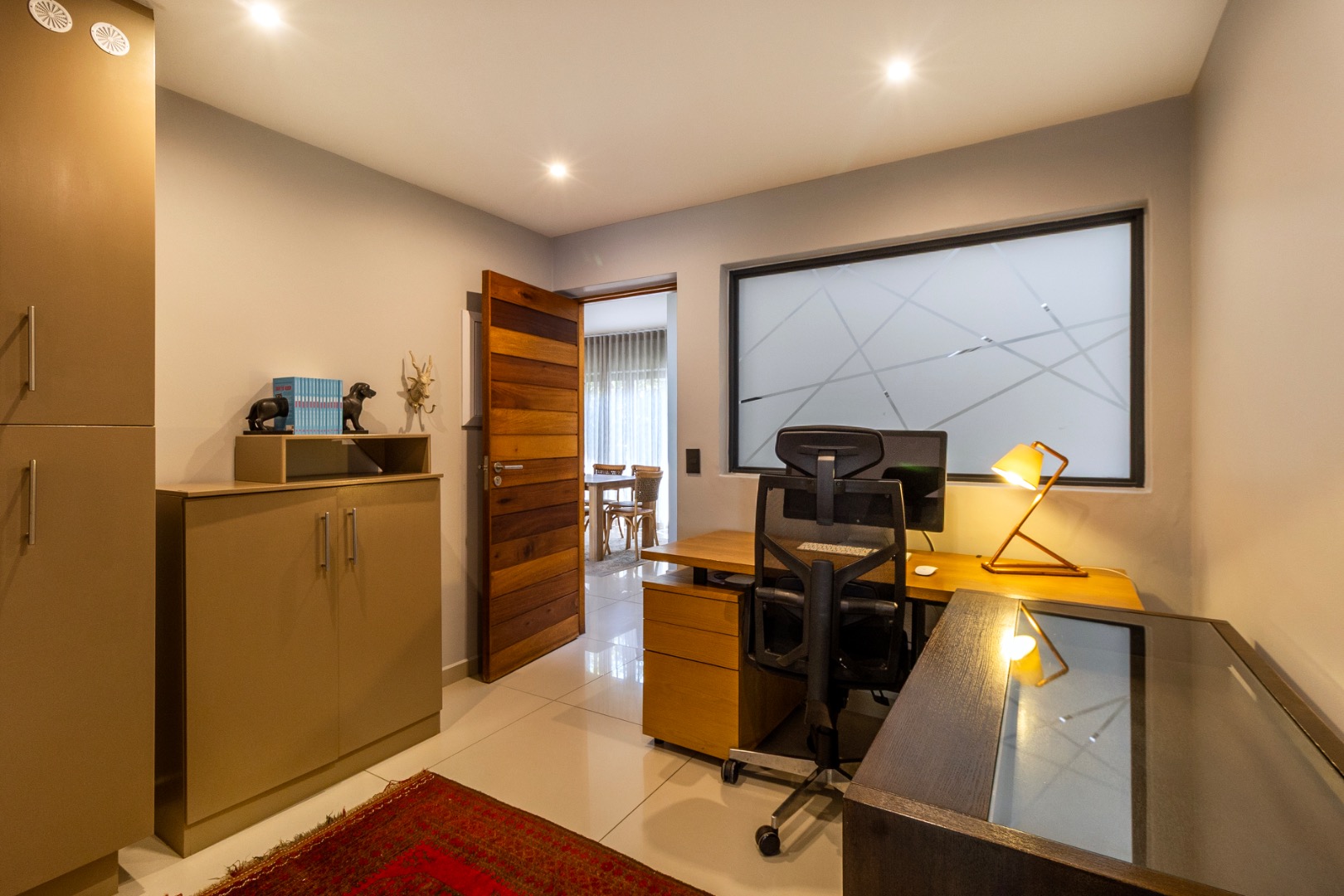 Nestled within the prestigious security estate of Lakeside Village, Modderfontein, this exquisite furnished residence offers an unparalleled blend of modern luxury and sophisticated comfort. Designed for discerning individuals, this expansive home boasts five opulent bedrooms and four meticulously appointed bathrooms, including two lavish en-suites and a convenient guest toilet, ensuring privacy and convenience for all occupants. The architectural design, characterized by its clean lines and expansive glass sections, invites an abundance of natural light, creating an airy and inviting ambiance throughout.