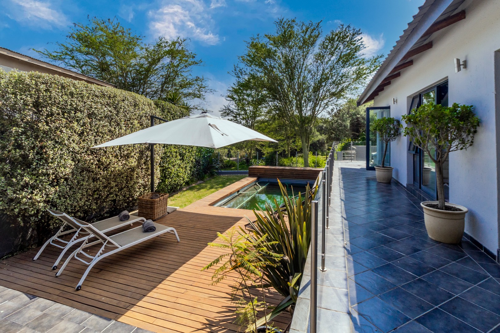 Beyond the main residence, a versatile flatlet offers independent living quarters, ideal for extended family, guests, or as a private retreat. This additional accommodation enhances the property's appeal, providing flexibility and space, It is currently occupied by the families helper and is an option with the rental should one need this help. The outdoor oasis is a true highlight, featuring a private swimming pool with an elegant wooden deck, multiple covered patios, and a luxurious jacuzzi, all set amidst lush, mature greenery. This meticulously landscaped garden, coupled with scenic views, creates a tranquil sanctuary for relaxation and entertainment. The property is also pet-friendly, allowing beloved companions to enjoy this splendid environment.
