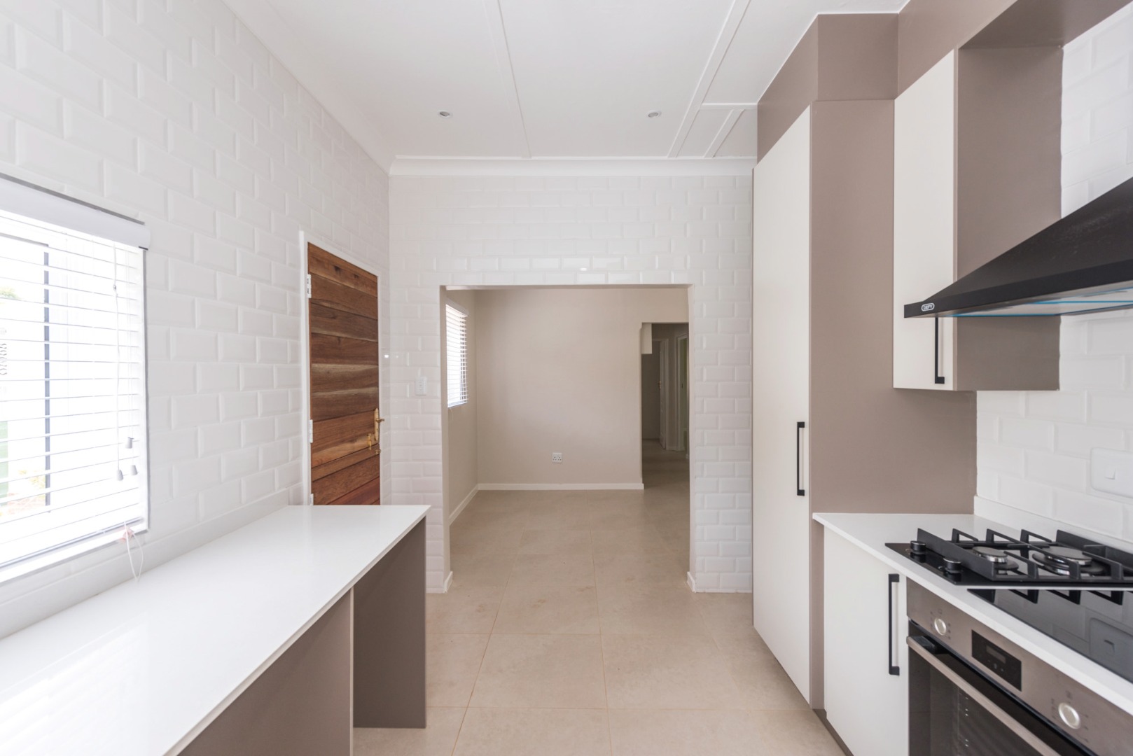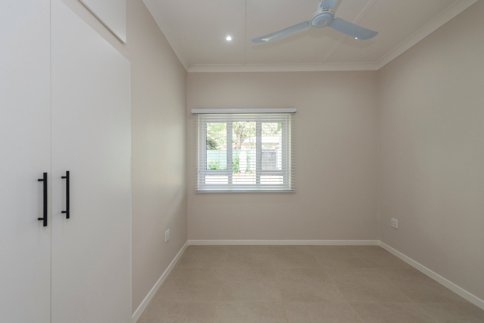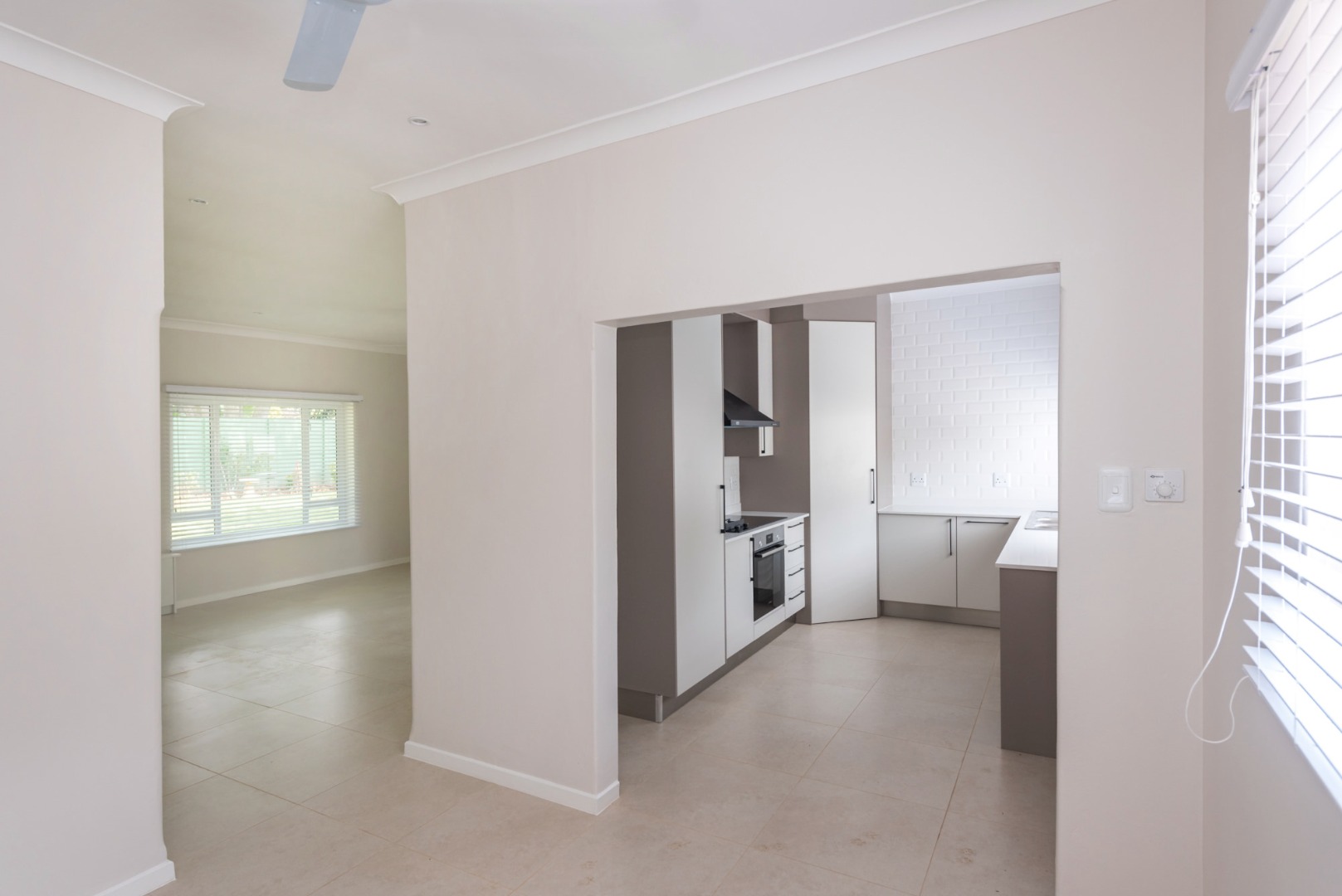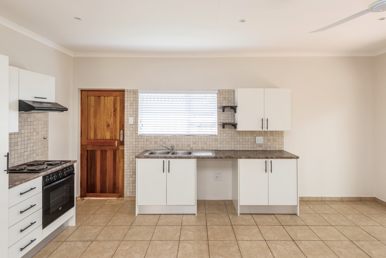 The main house, approximately 137m² in size. The interior is finished with a uniform tile throughout, enhancing the sense of space and flow. The modern kitchen is fitted with sleek Caesarstone countertops and includes both a gas and electric hob, offering practicality and convenience. The home offers three well-sized bedrooms, all fitted with ceiling fans. The bathroom is trendy and includes a shower, vanity and toilet, while a separate guest toilet with a basin adds further convenience.