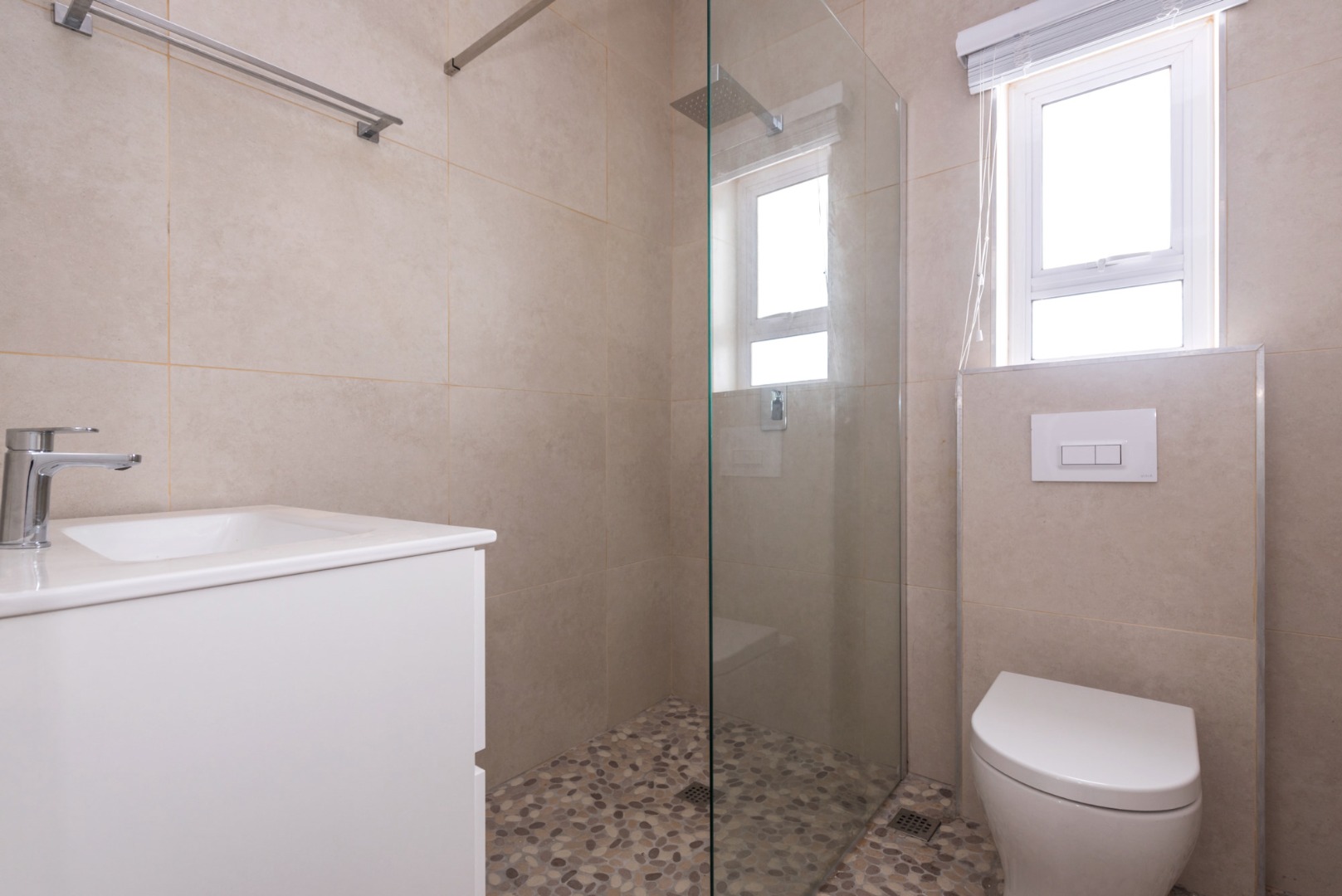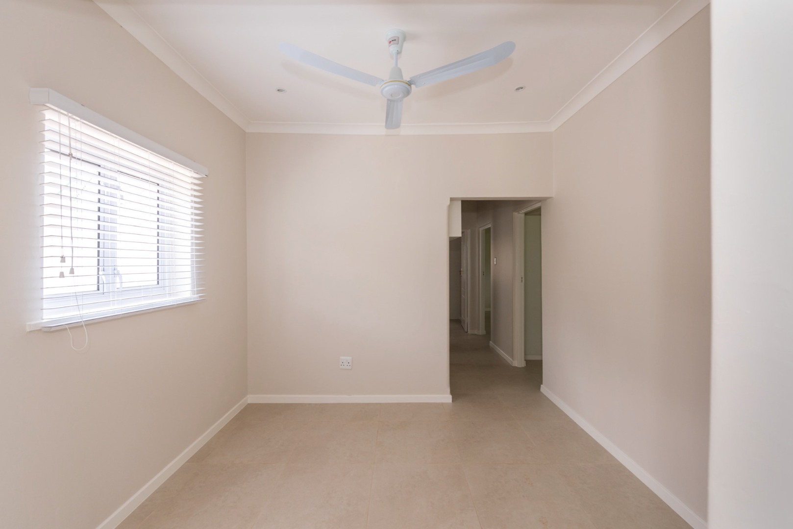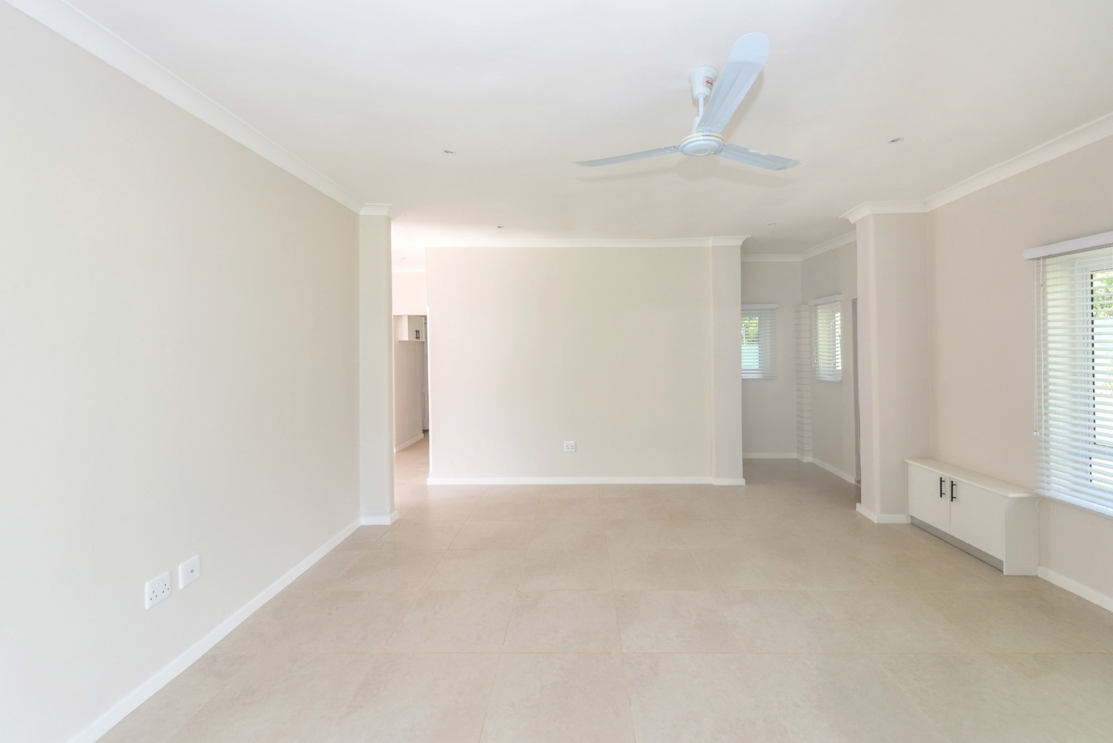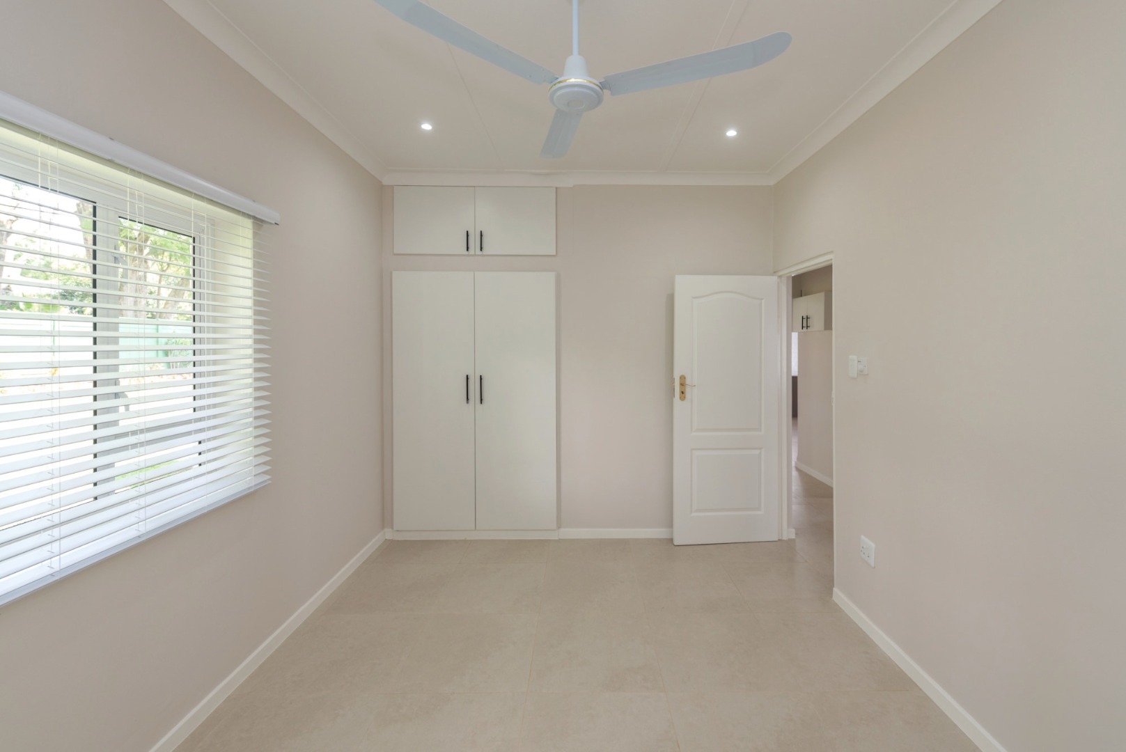 The main house, approximately 137m² in size. The interior is finished with a uniform tile throughout, enhancing the sense of space and flow. The modern kitchen is fitted with sleek Caesarstone countertops and includes both a gas and electric hob, offering practicality and convenience. The home offers three well-sized bedrooms, all fitted with ceiling fans. The bathroom is trendy and includes a shower, vanity and toilet, while a separate guest toilet with a basin adds further convenience.