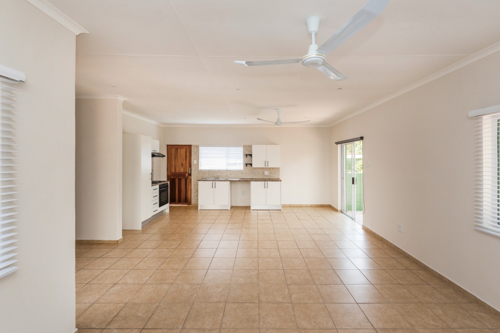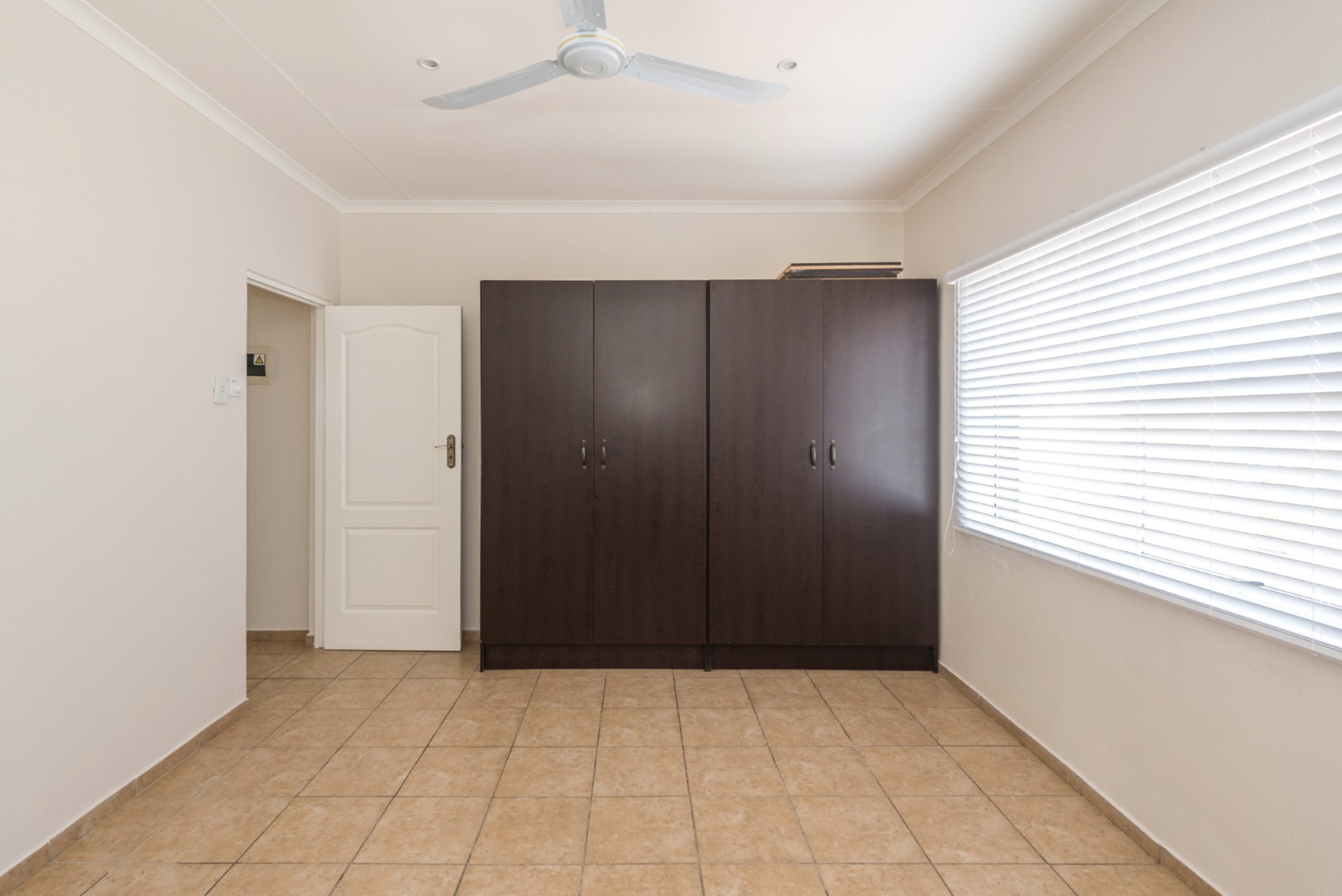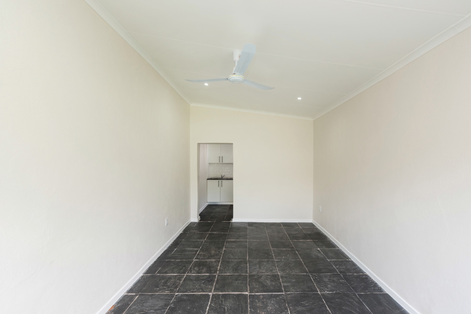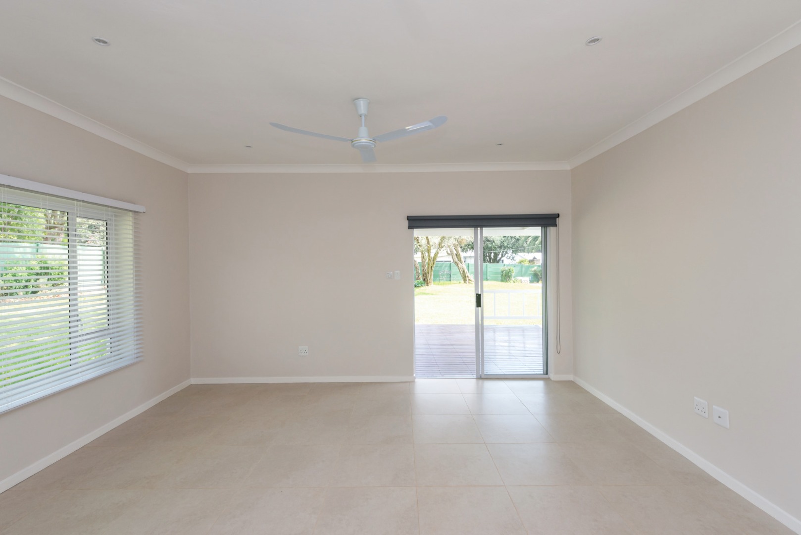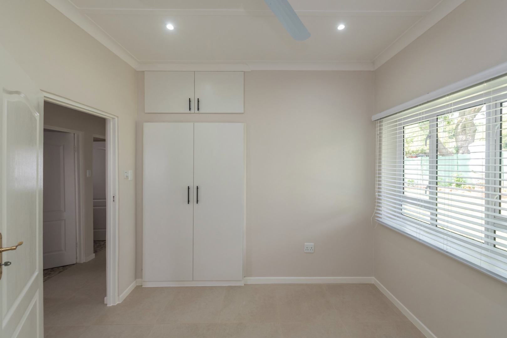The main house, approximately 137m² in size. The interior is finished with a uniform tile throughout, enhancing the sense of space and flow. The modern kitchen is fitted with sleek Caesarstone countertops and includes both a gas and electric hob, offering practicality and convenience. The home offers three well-sized bedrooms, all fitted with ceiling fans. The bathroom is trendy and includes a shower, vanity and toilet, while a separate guest toilet with a basin adds further convenience.