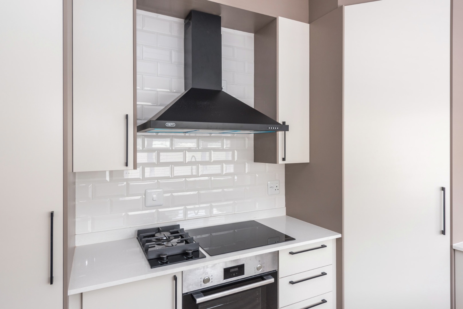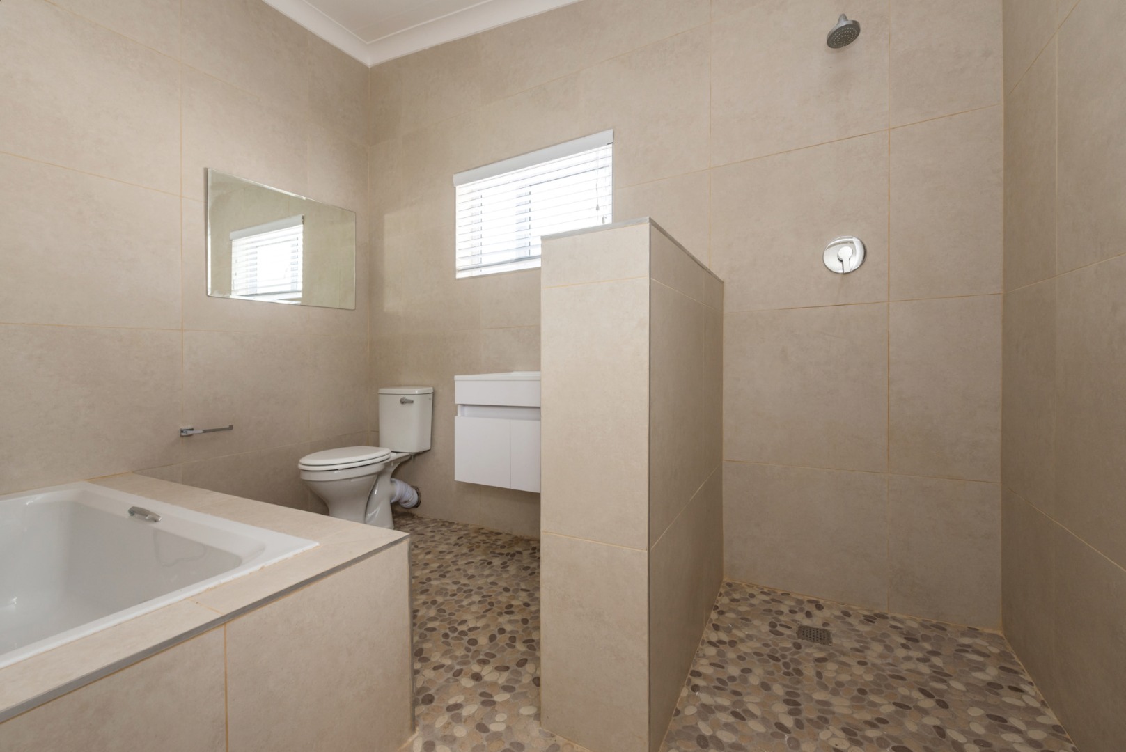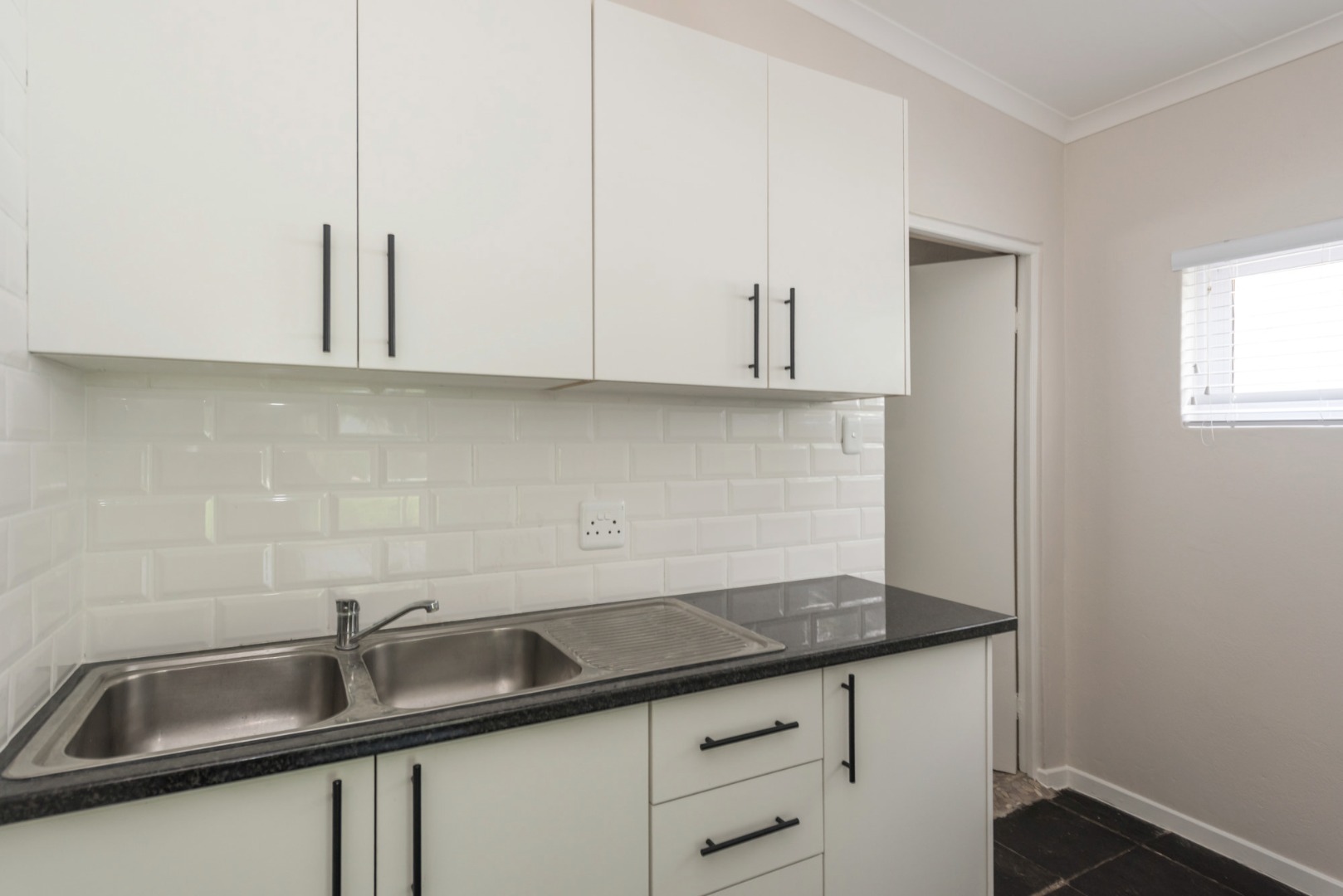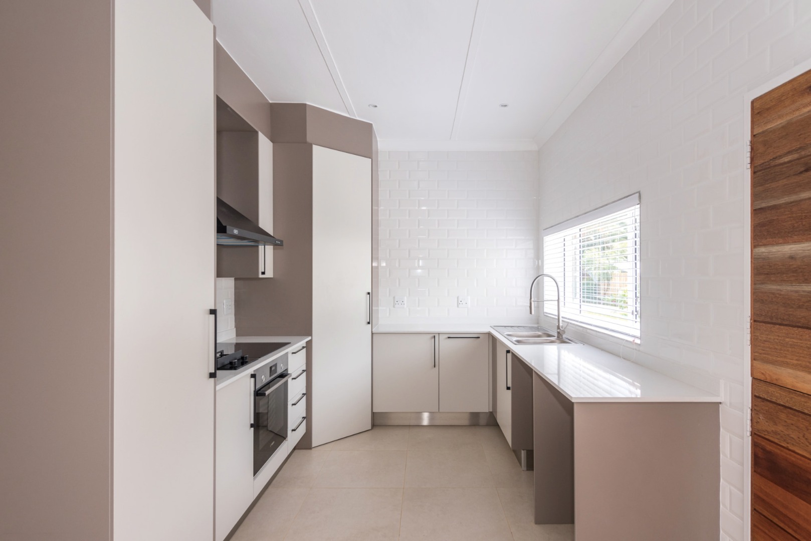 The main house, approximately 137m² in size. The interior is finished with a uniform tile throughout, enhancing the sense of space and flow. The modern kitchen is fitted with sleek Caesarstone countertops and includes both a gas and electric hob, offering practicality and convenience. The home offers three well-sized bedrooms, all fitted with ceiling fans. The bathroom is trendy and includes a shower, vanity and toilet, while a separate guest toilet with a basin adds further convenience.