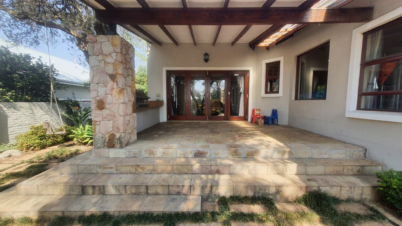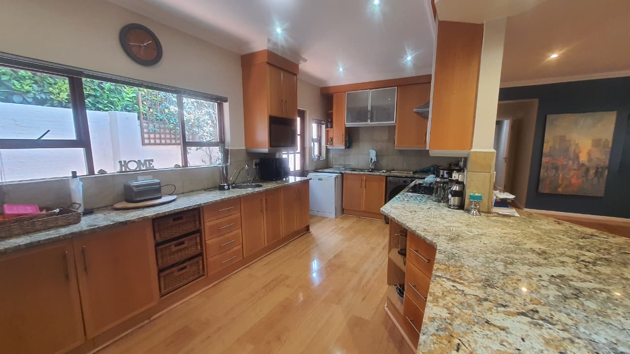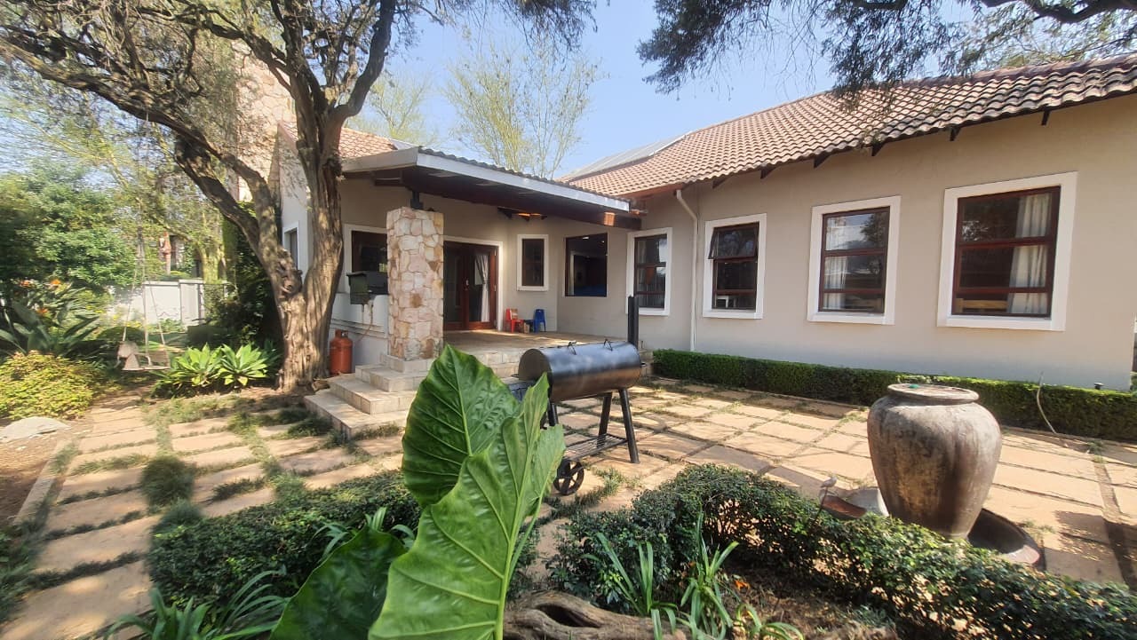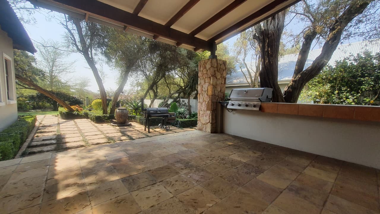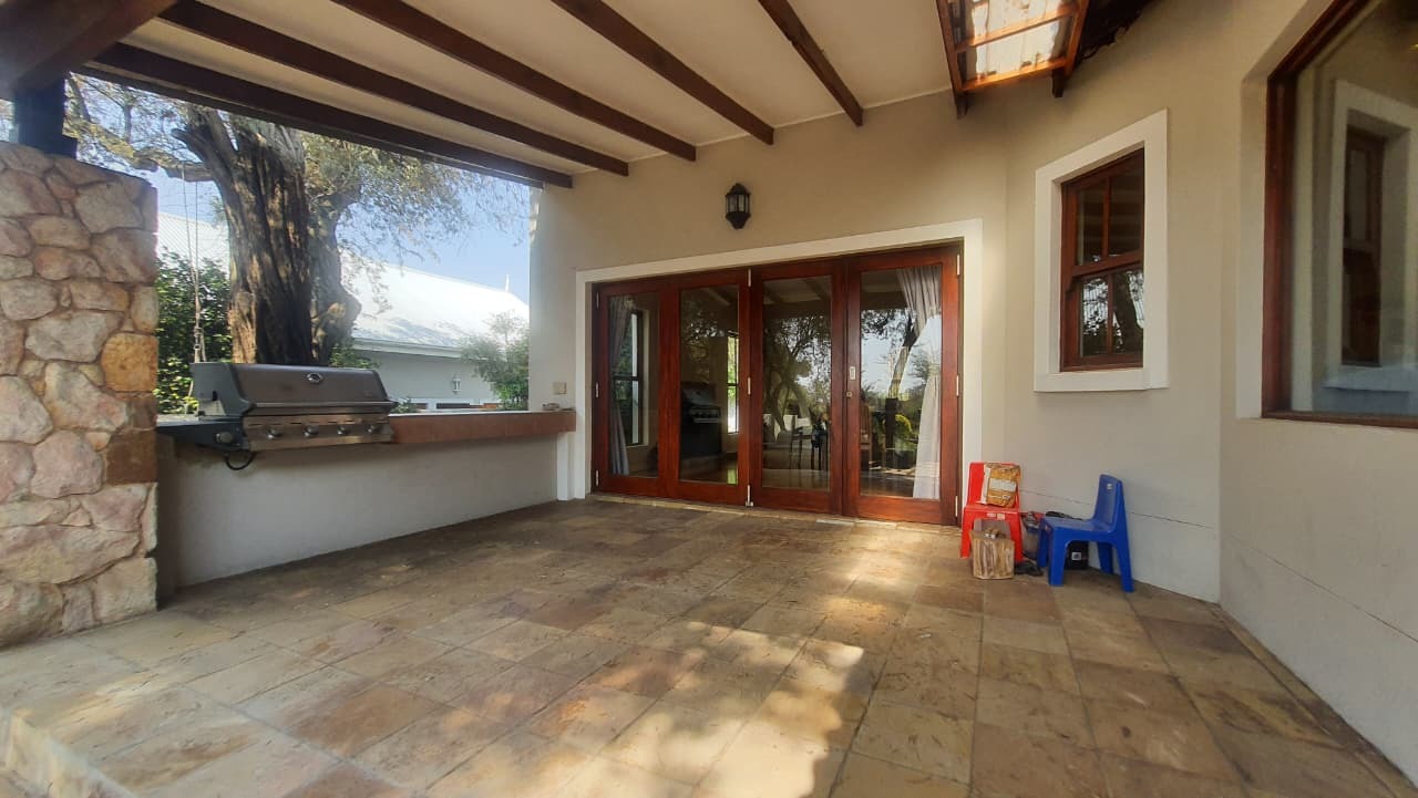 A large covered patio with a built-in braai overlooks a beautifully manicured garden, providing an ideal space for relaxing or entertaining. The property includes a double automated garage and additional driveway parking. There is no pool, making this home easy to maintain, and its position within the estate adds to its overall appeal.