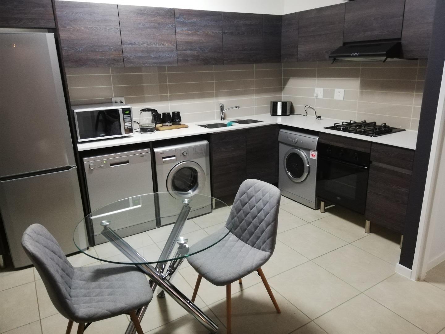 The apartment offers a bright open-plan living area with contemporary finishes, flowing seamlessly onto a private balcony with scenic views — perfect for relaxing after a long day. The modern kitchen is fully equipped with quality appliances, including a gas hob, oven, microwave, dishwasher, refrigerator, and washing machines, plus a convenient integrated dining space.