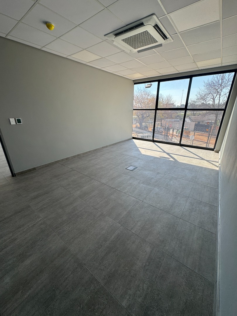 The unit offers a large open-plan showroom area downstairs with ablution facilities, a modern kitchenette, a reception area and ample secure parking spaces.