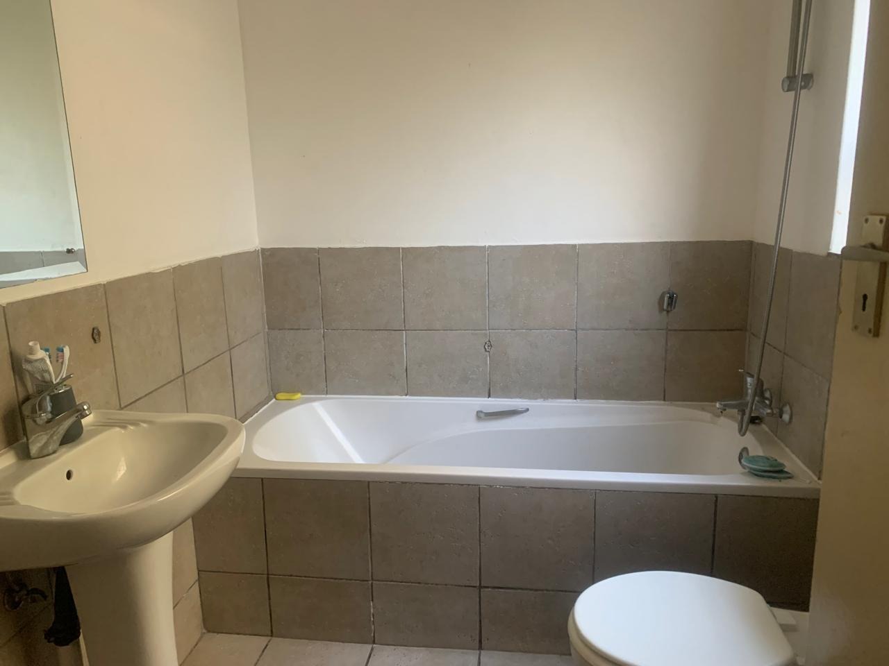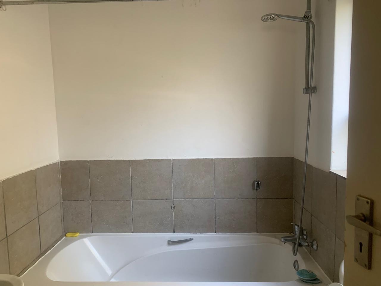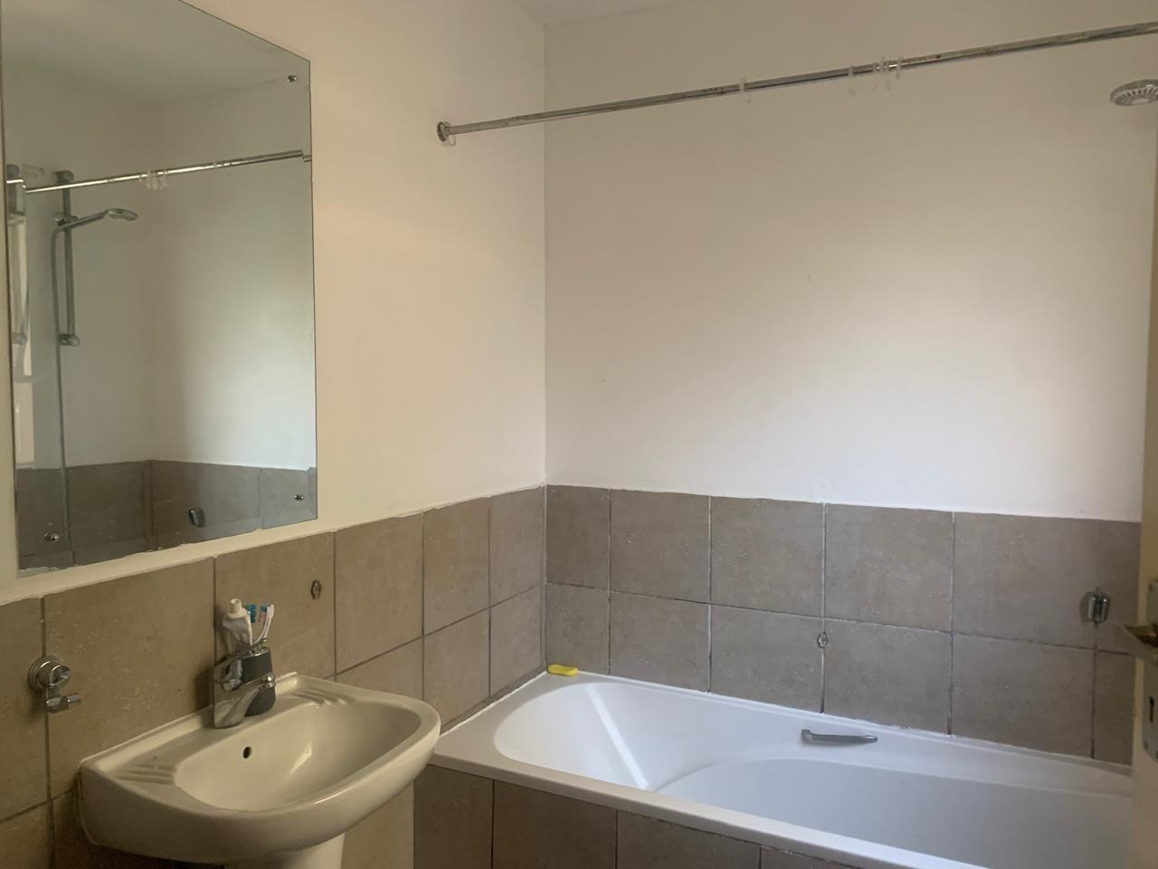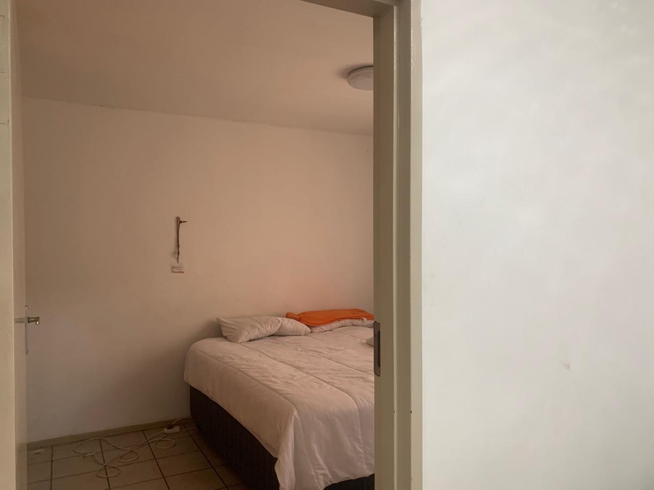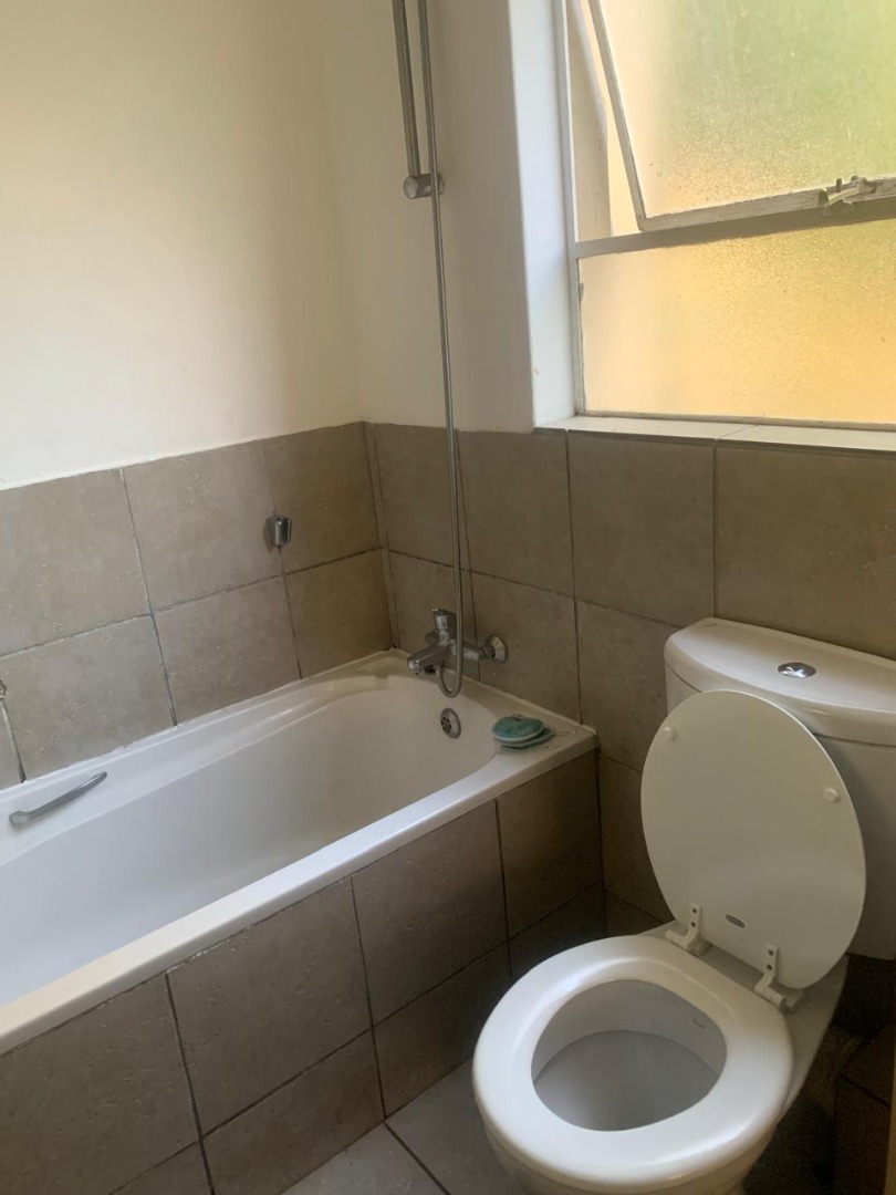 The living space includes a comfortable lounge area, providing a versatile zone for relaxation or study. The single bedroom boasts neutral white walls and benefits from natural light, creating a bright and inviting atmosphere. A unique aspect of this property is its extensive bathroom facilities, with eleven bathrooms available, ensuring convenience and privacy for residents within the complex setting. The bathroom is functional, featuring a bathtub with a shower attachment and tiled surfaces.