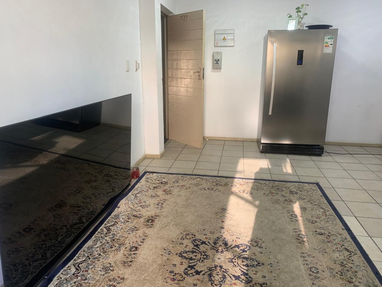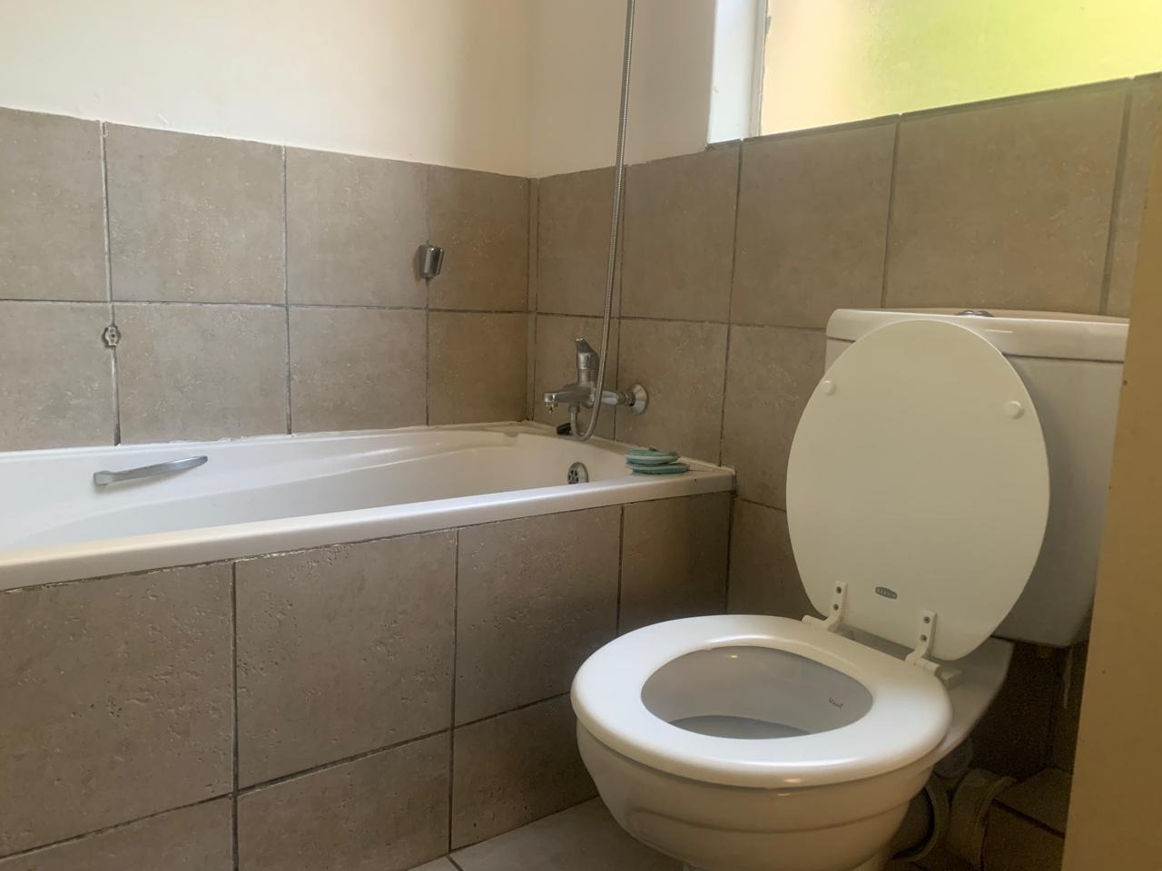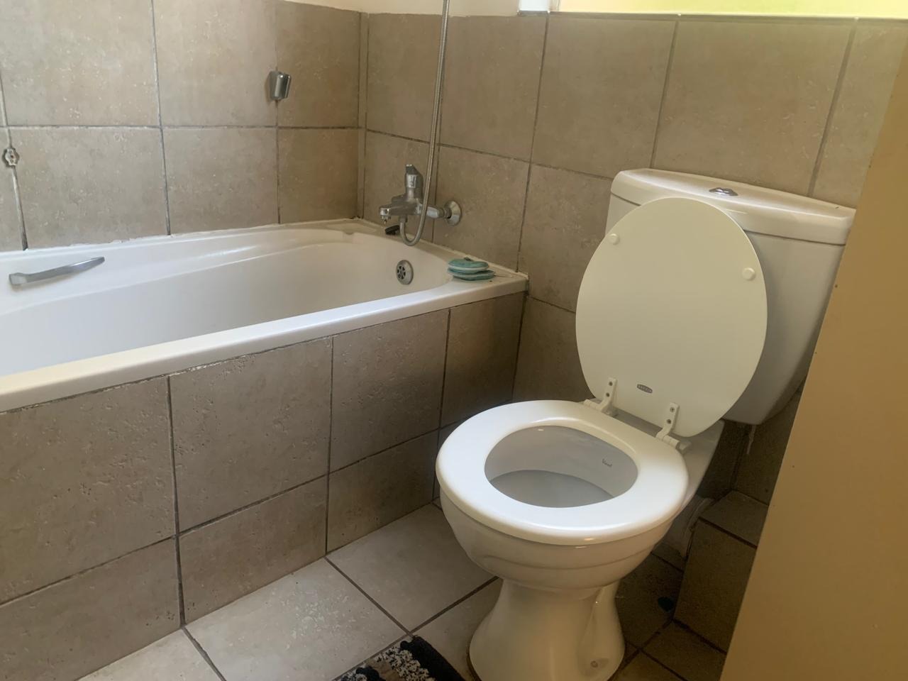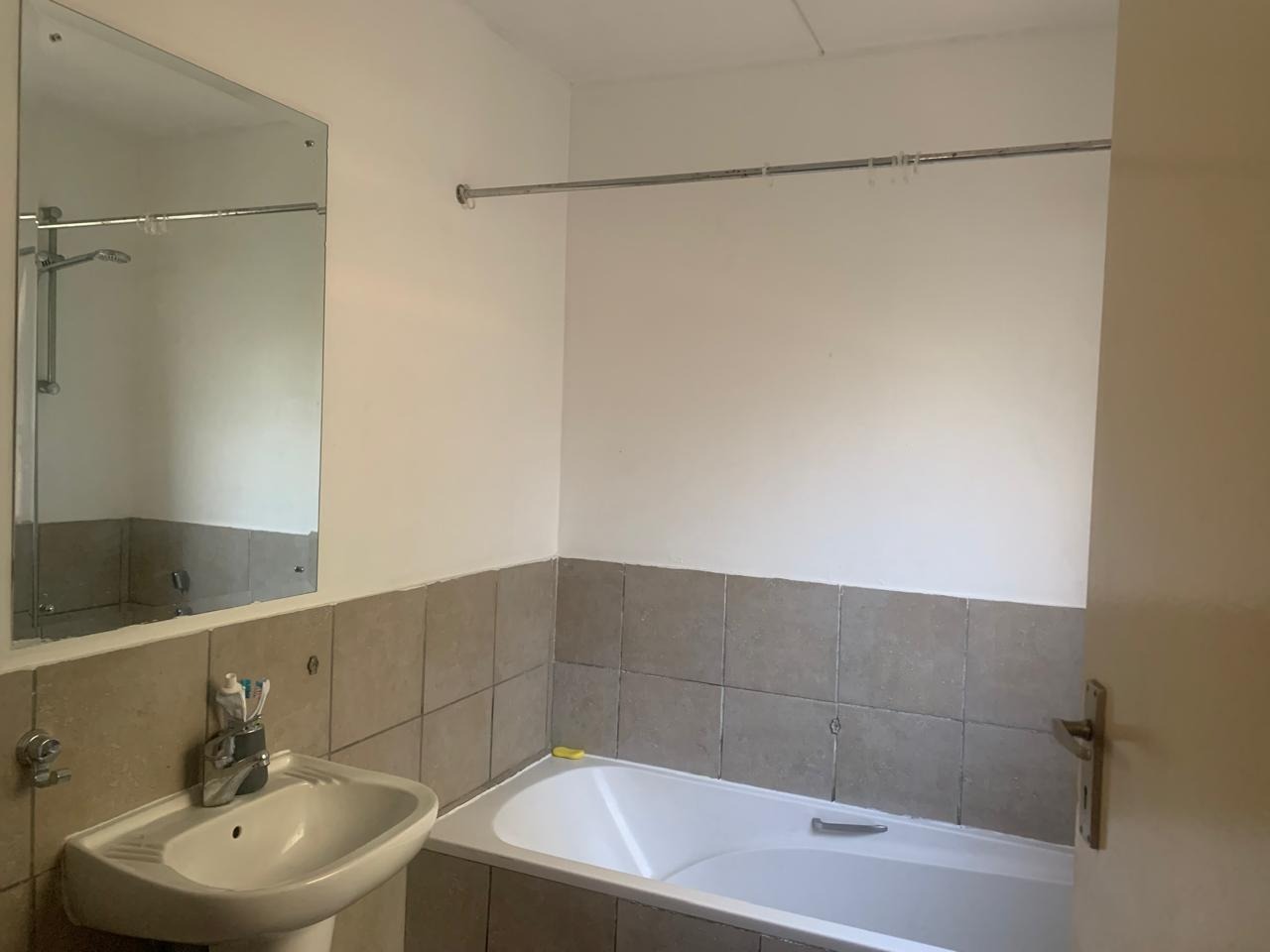 The living space includes a comfortable lounge area, providing a versatile zone for relaxation or study. The single bedroom boasts neutral white walls and benefits from natural light, creating a bright and inviting atmosphere. A unique aspect of this property is its extensive bathroom facilities, with eleven bathrooms available, ensuring convenience and privacy for residents within the complex setting. The bathroom is functional, featuring a bathtub with a shower attachment and tiled surfaces.