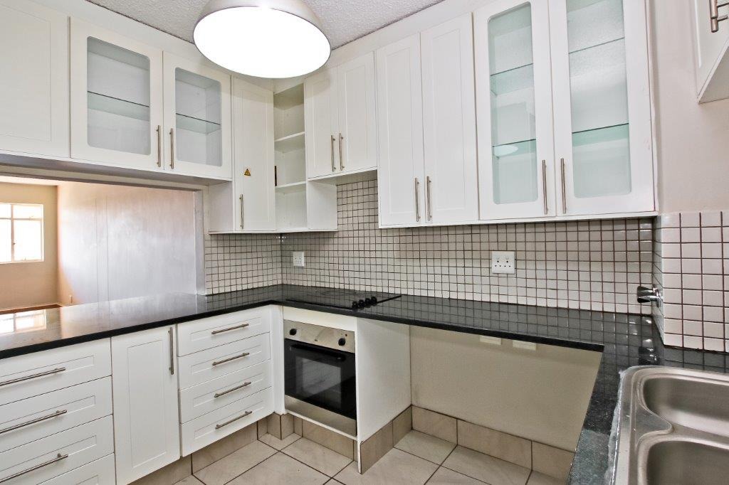 This sophisticated two-bedroom, one-bathroom apartment offers refined living within a secure complex in Craighall Park, Johannesburg. The contemporary kitchen boasts white shaker-style cabinetry, dark granite-look countertops, an integrated oven and hob, and a double stainless steel sink.