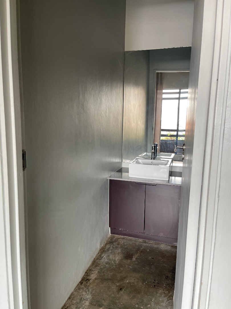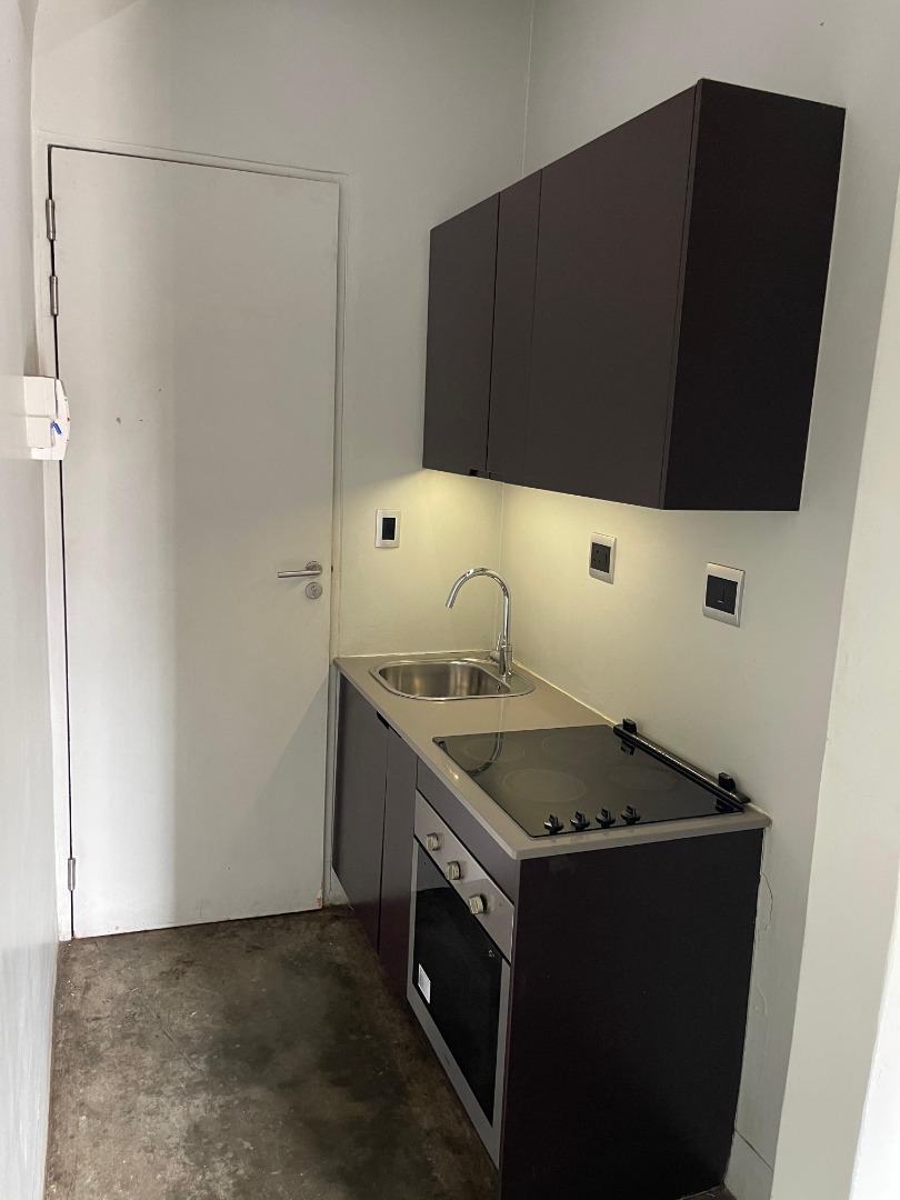 This modern rental unit in Maboneng offers a unique industrial-chic aesthetic, perfect for urban living in Johannesburg. The open-plan living space features an exposed concrete ceiling, track lighting, and distinctive dark herringbone flooring, creating a contemporary urban feel. Large windows provide abundant natural light, enhancing the industrial design and sense of space. A compact, modern kitchenette is efficiently designed with sleek dark cabinetry, an integrated induction hob, and an oven, complemented by under-cabinet lighting. The unit includes a stylish bathroom equipped with a walk-in shower, subway tiles, a concealed cistern toilet, and a contemporary vanity featuring a square vessel sink and ample countertop space.
