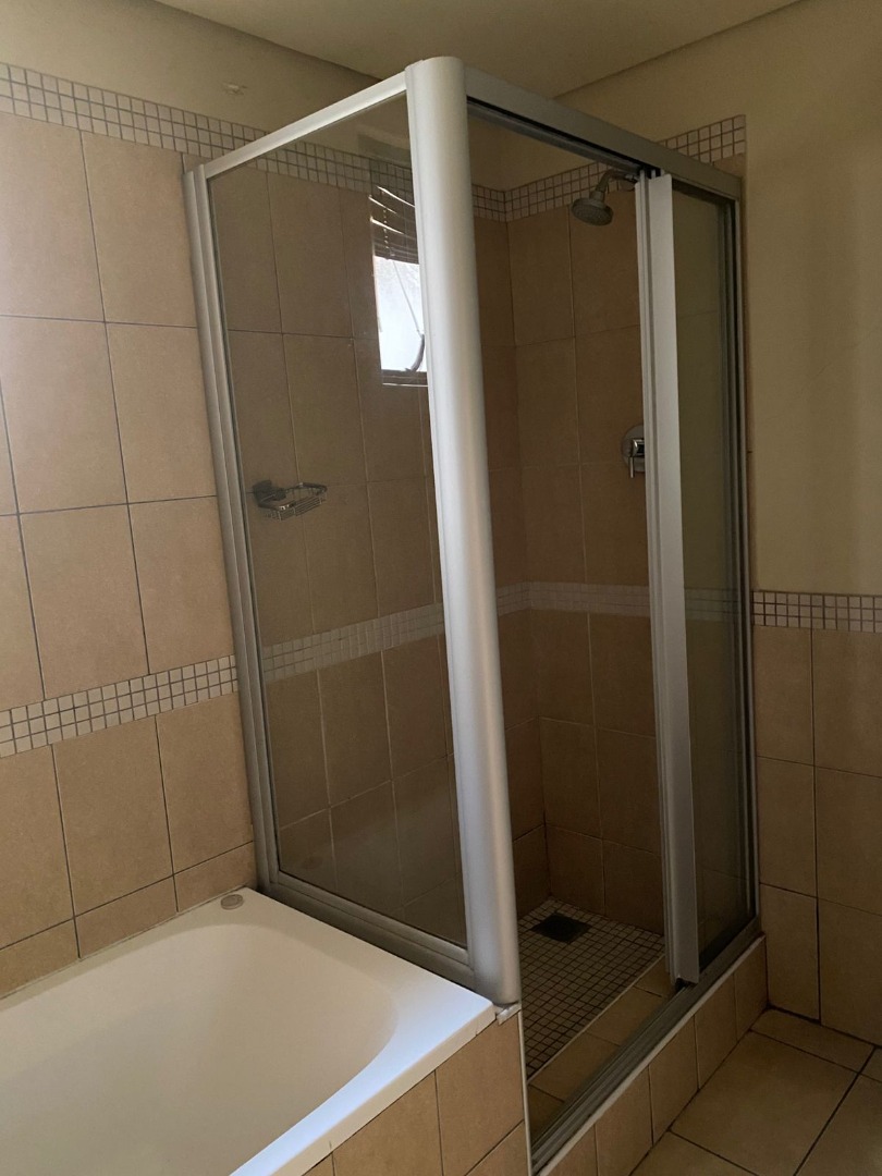 The unit features an open-plan layout with a modern kitchen, fitted with sleek finishes and ample storage space. The living area is bright and airy, leading to a well-sized bedroom with built-in cupboards. The bathroom is neatly tiled with a shower and a bathtub.