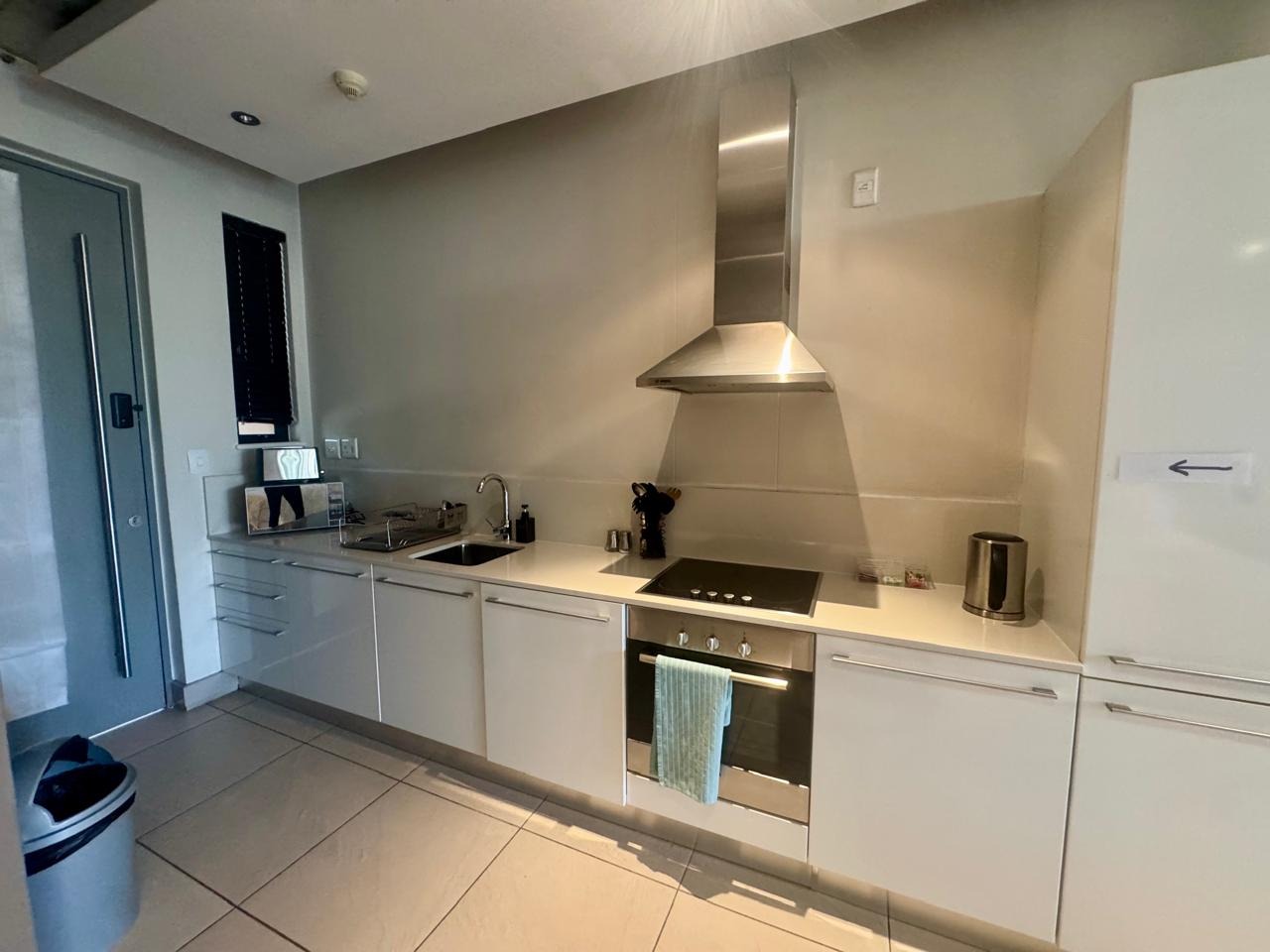 Featuring industrial-modern touches such as exposed concrete ceilings and a feature brick-look accent wall, the apartment is bathed in natural light through expansive dark-framed windows. The sleek, functional kitchen is outfitted with high-gloss white cabinetry, light stone countertops, and quality stainless steel appliances including a built-in hob, oven, and extractor.