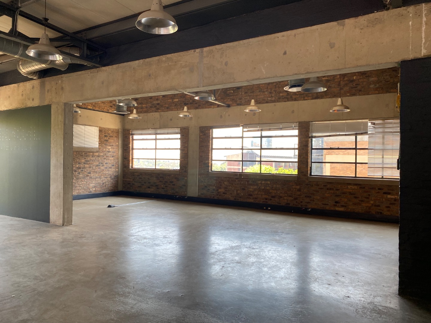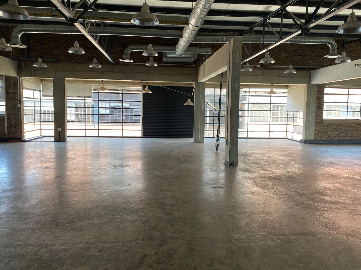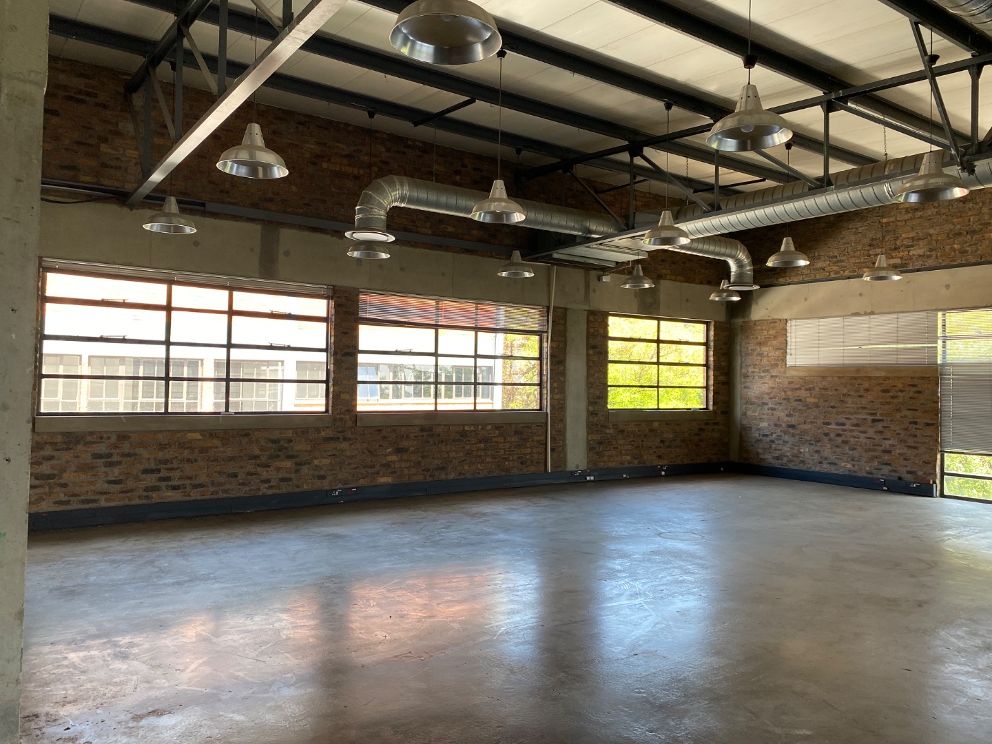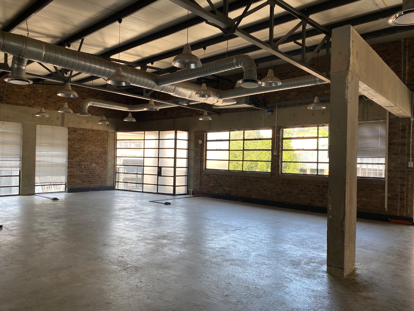 This expansive 245 sqm commercial rental space in Milpark, Johannesburg, offers a versatile open-plan layout ideal for various business operations. Featuring a modern industrial aesthetic, the unit boasts high ceilings, exposed ductwork, and durable concrete flooring. Abundant natural light streams through large windows, creating a bright and inviting environment.