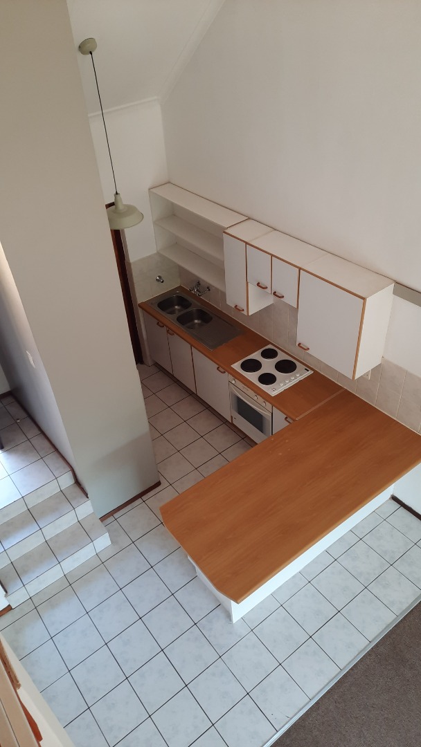 The modern kitchen with electrical stove, oven, and space for appliances and double fridge. There is a private wet area adjacent to the kitchen. The kitchen has a large breakfast counter.