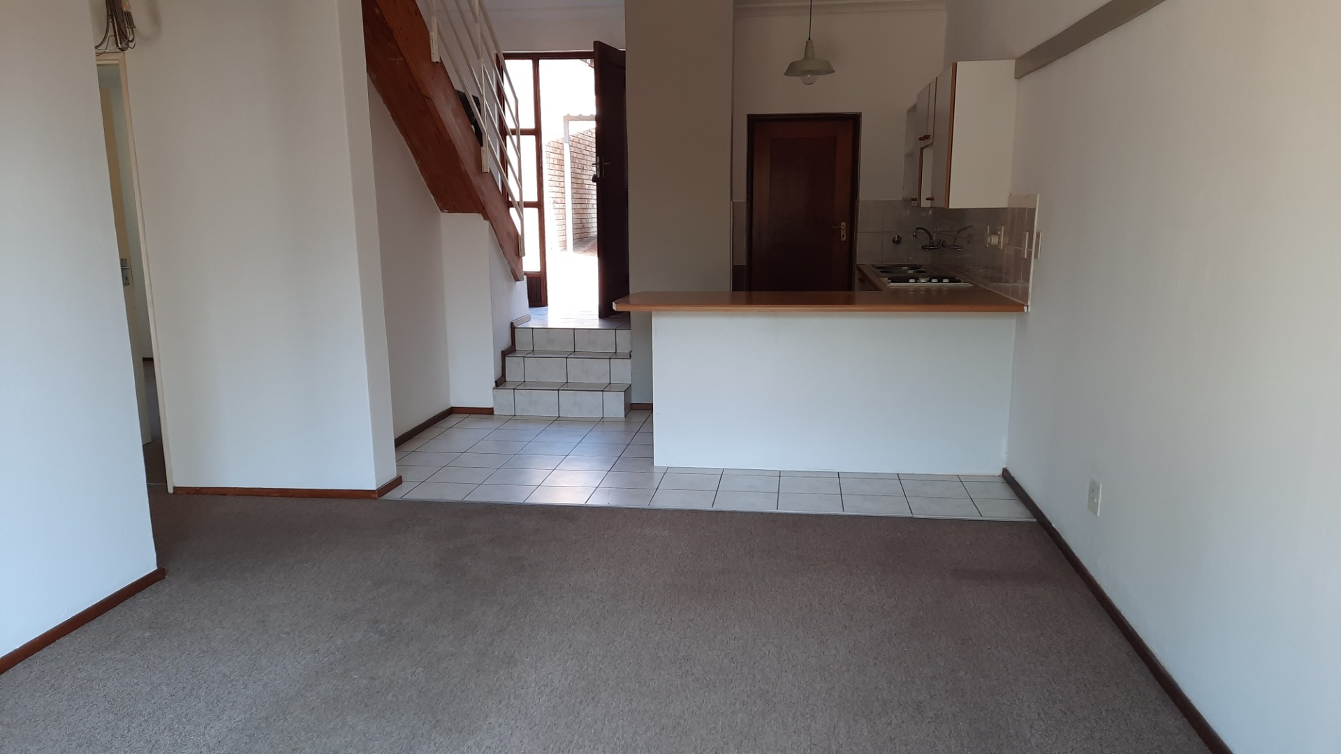 Downstairs adjacent to the kitchen is a carpeted lounge or dining room with a big sliding door that lead to the patio.