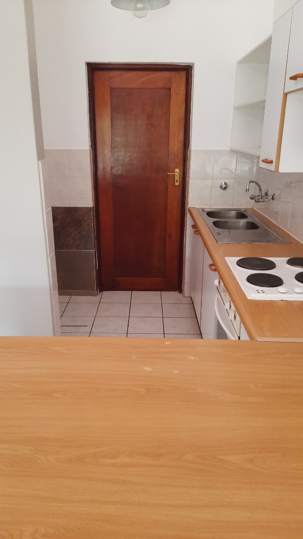 The modern kitchen with electrical stove, oven, and space for appliances and double fridge. There is a private wet area adjacent to the kitchen. The kitchen has a large breakfast counter.