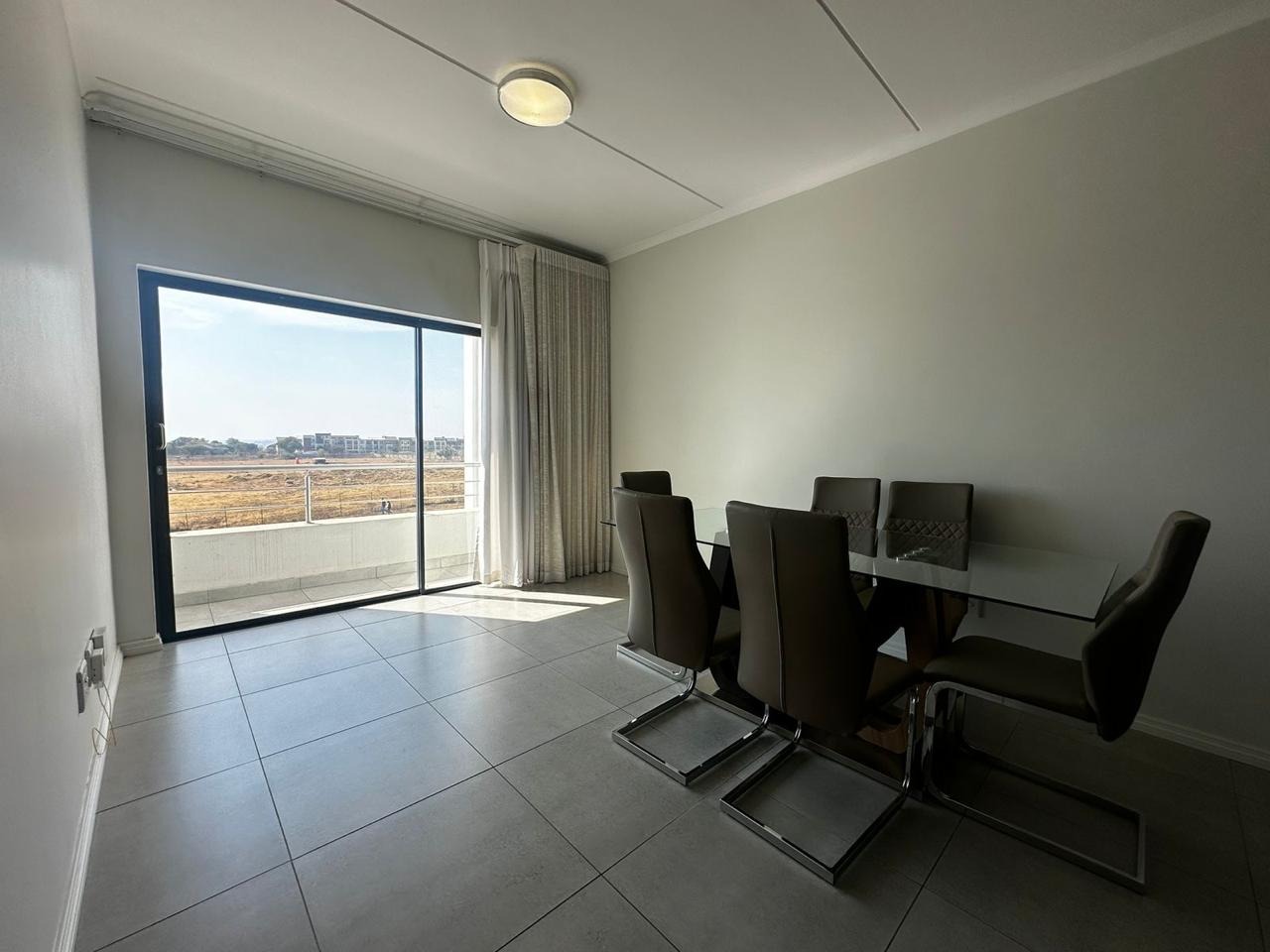 The heart of this home is its magnificent open-plan living and dining area, bathed in natural light streaming through expansive sliding glass doors that lead to a private balcony. This outdoor sanctuary provides a serene space for relaxation or entertaining, offering views that extend across the vibrant Midrand landscape. The adjacent kitchen is a culinary masterpiece, boasting sleek two-tone cabinetry, dark grey countertops, and integrated appliances including a oven, and extractor fan. A thoughtful wine rack and ample storage solutions ensure both style and practicality.