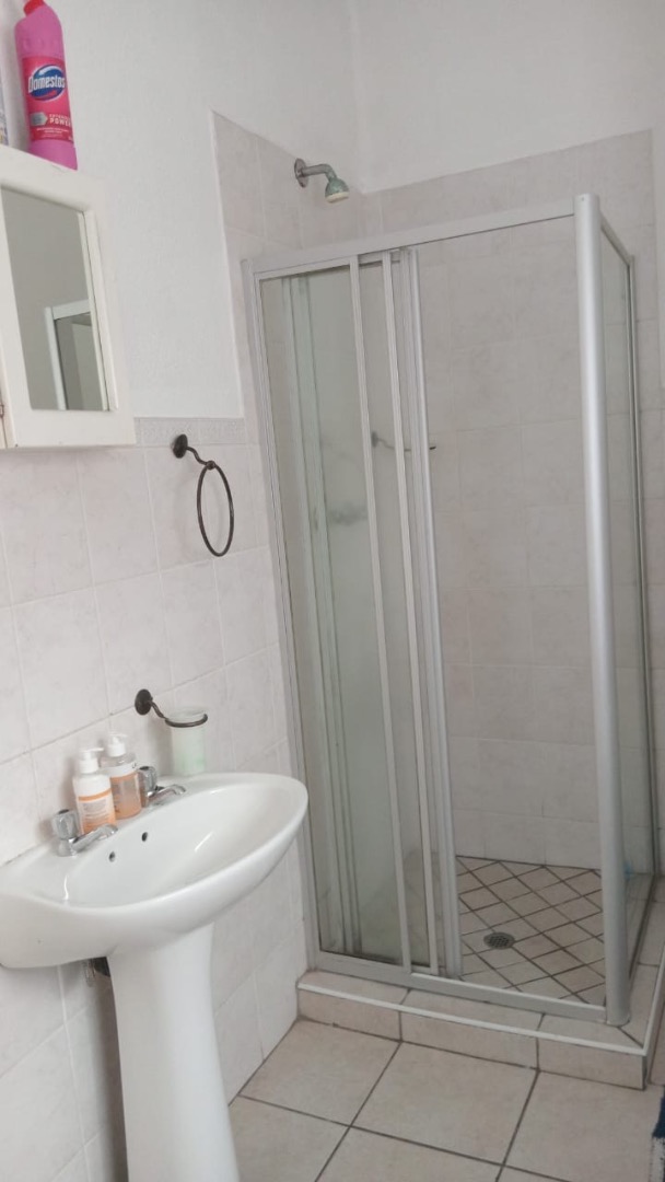 This apartment offers two cozy bedrooms, both featuring tiled floors and plenty of natural light to brighten your mornings. One of the bedrooms even boasts spacious built-in wardrobes, providing ample storage for all your belongings. The bathroom is practical and well-maintained, featuring a bathtub with a shower, tiled walls, and a pedestal sink, ensuring you have everything you need for your daily routine.