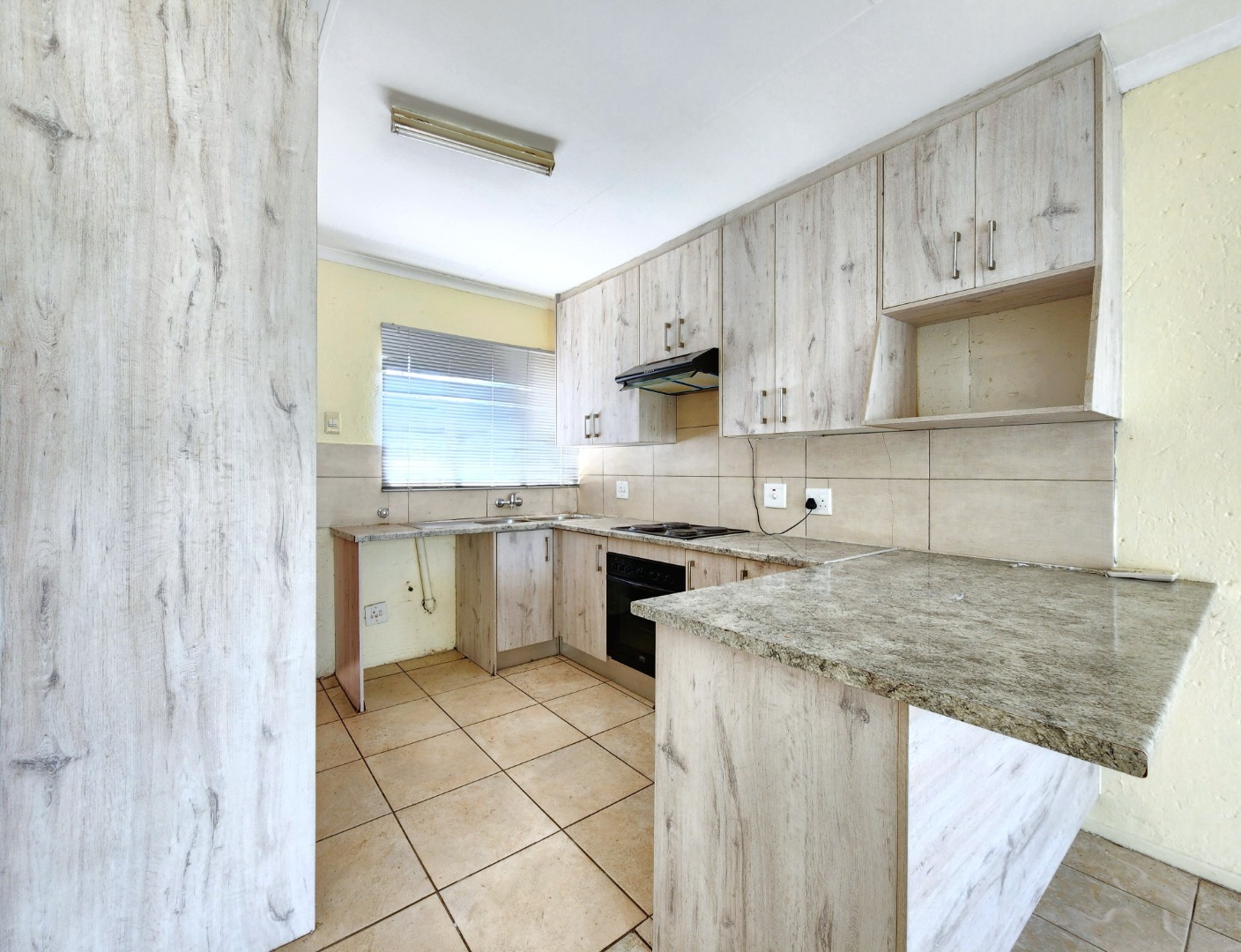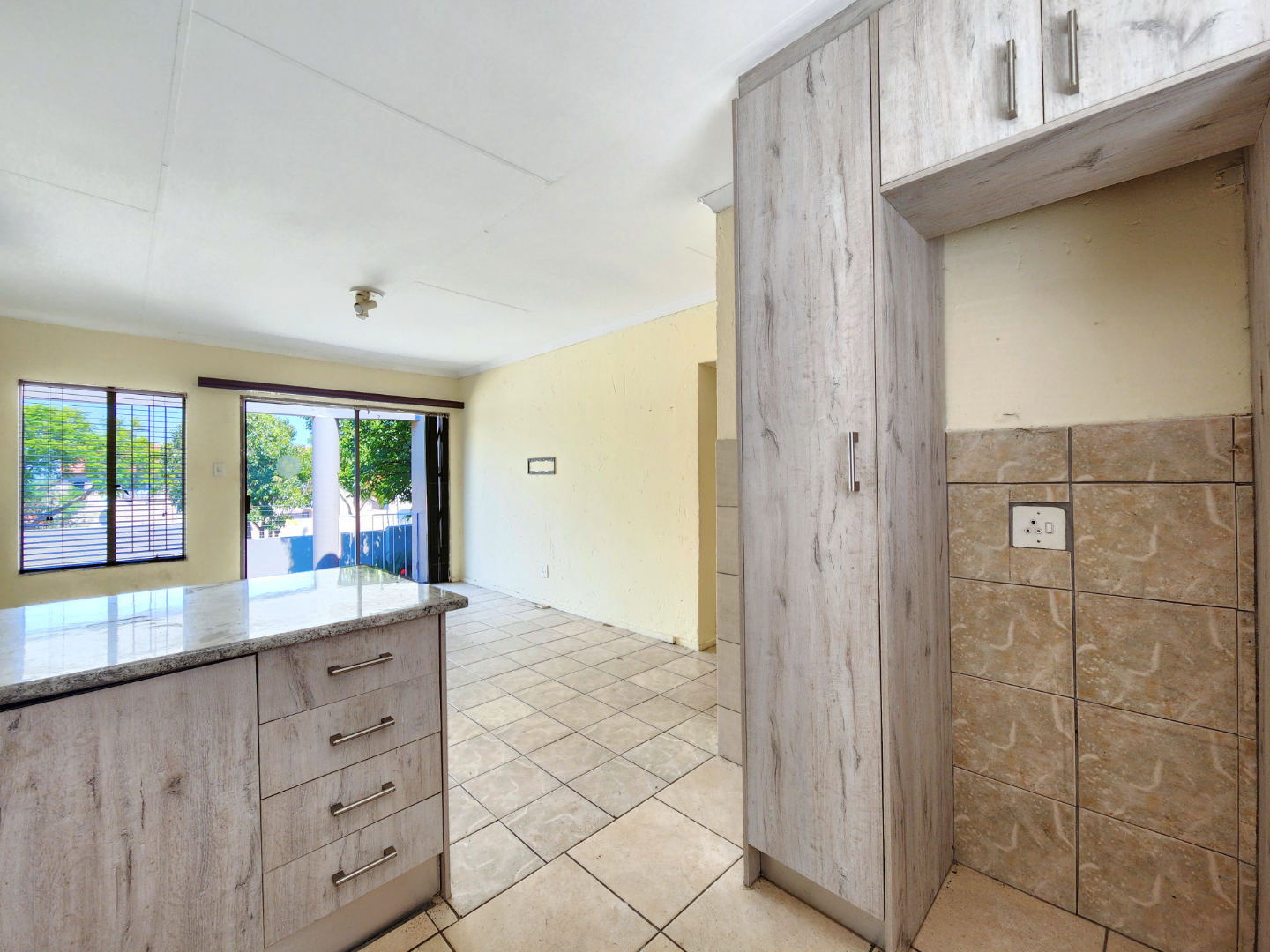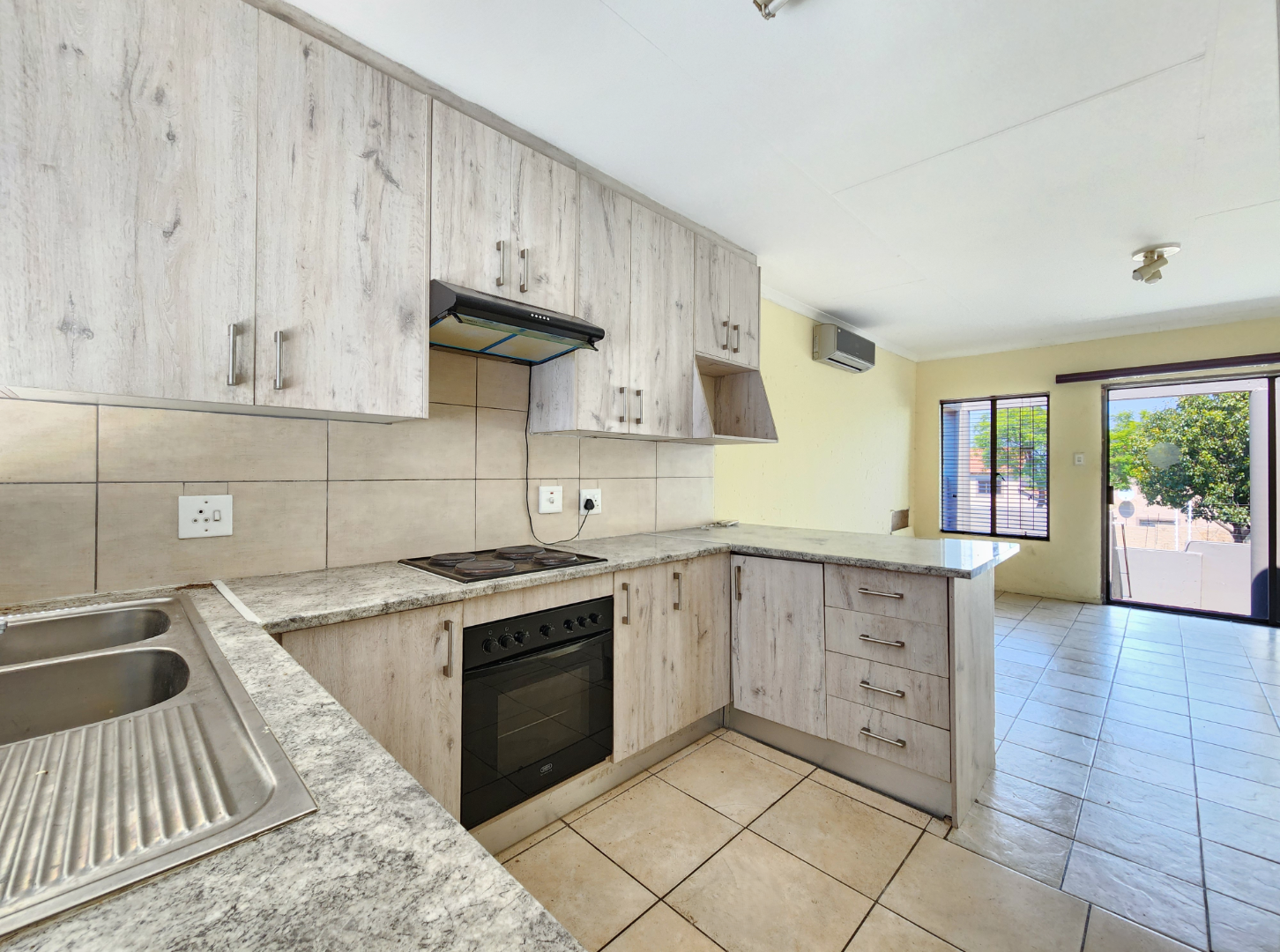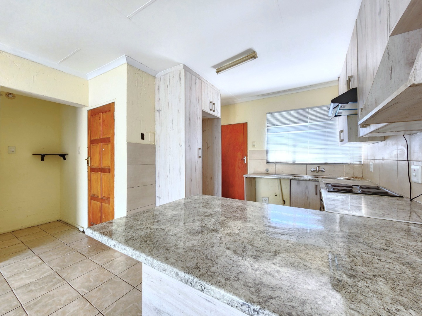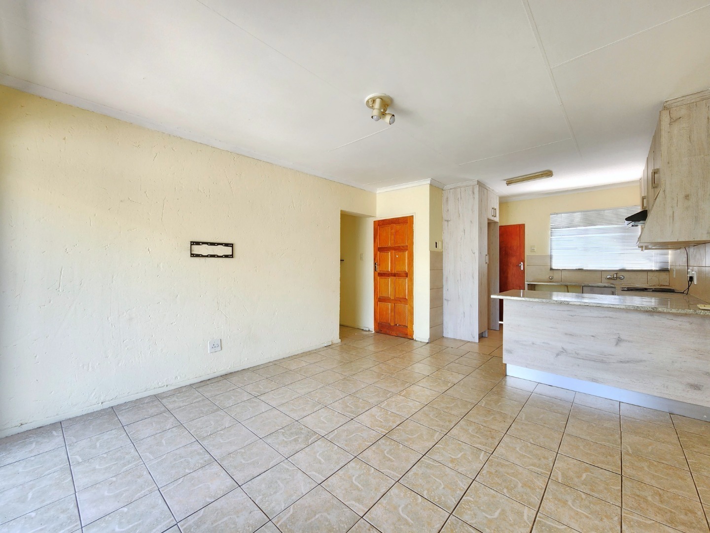 The home offers a comfortable open-plan layout that seamlessly connects the kitchen, dining, and family TV area, creating a warm and inviting living space. The kitchen is fitted with granite countertops, ample cupboard space, a stove, and an extractor fan, making it both practical and stylish.