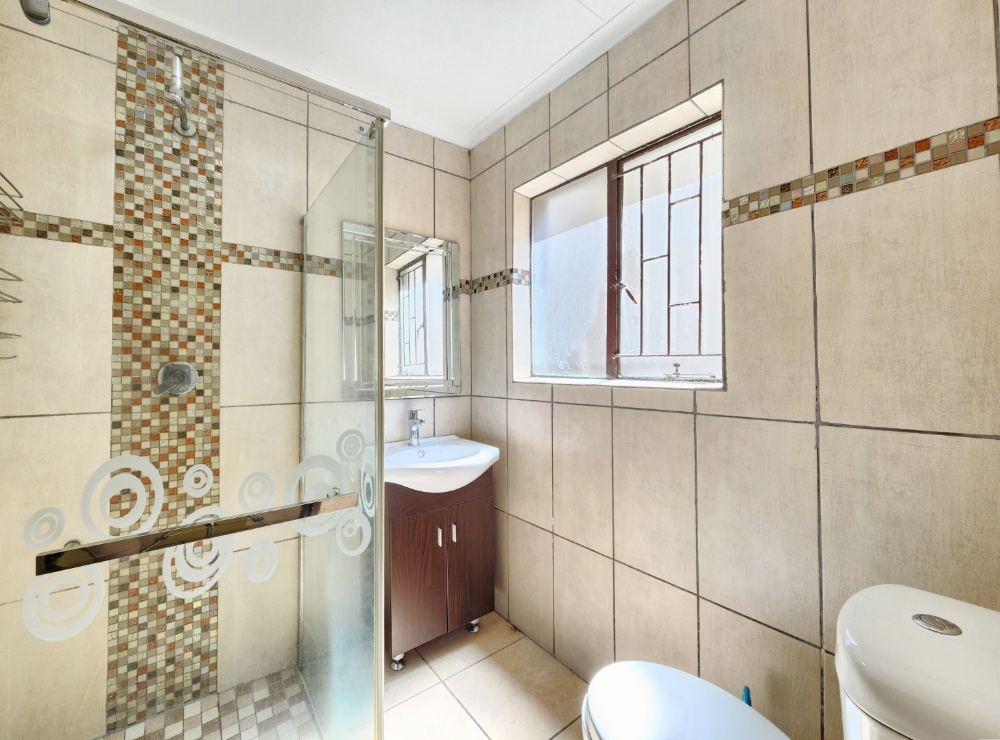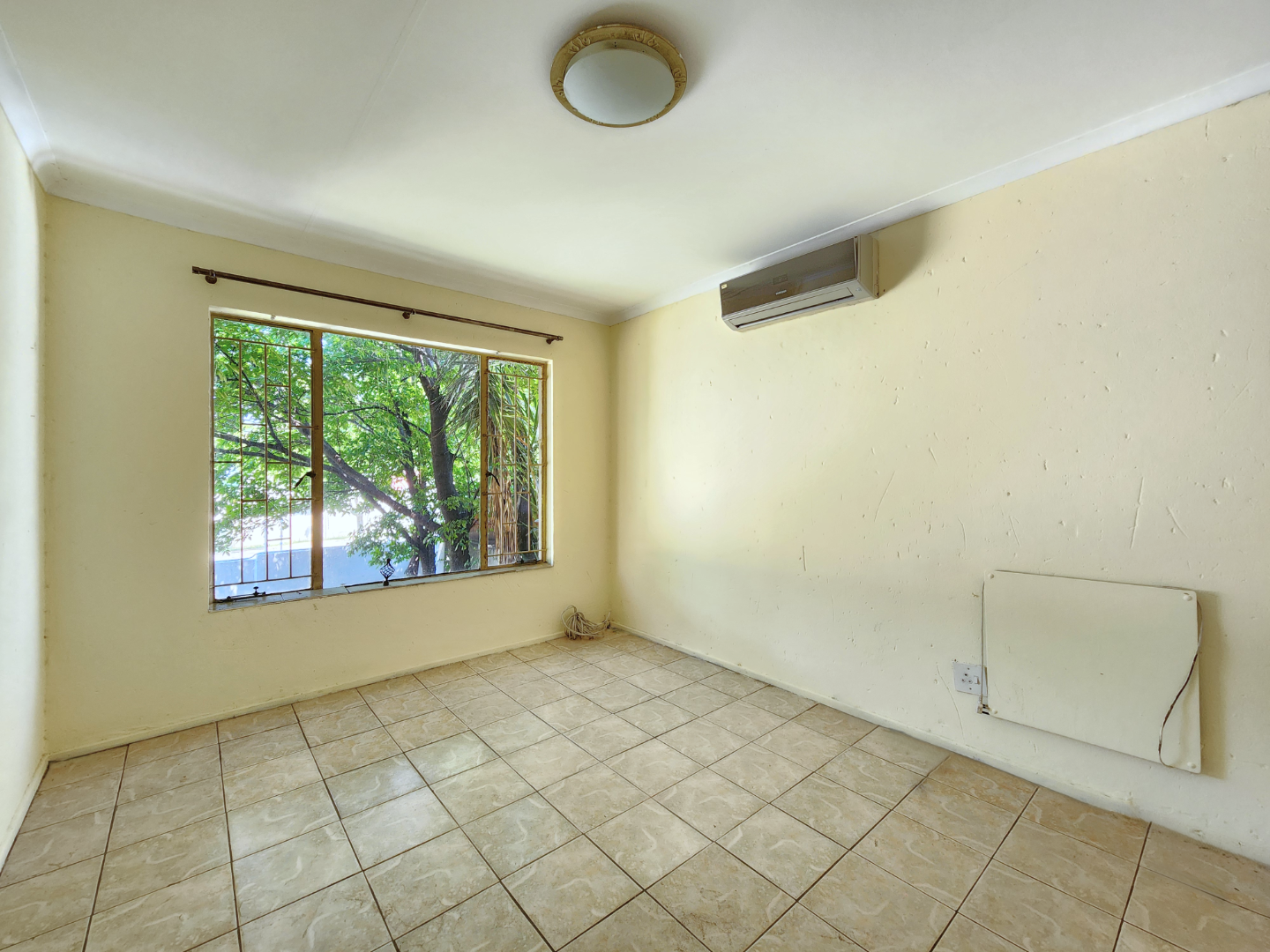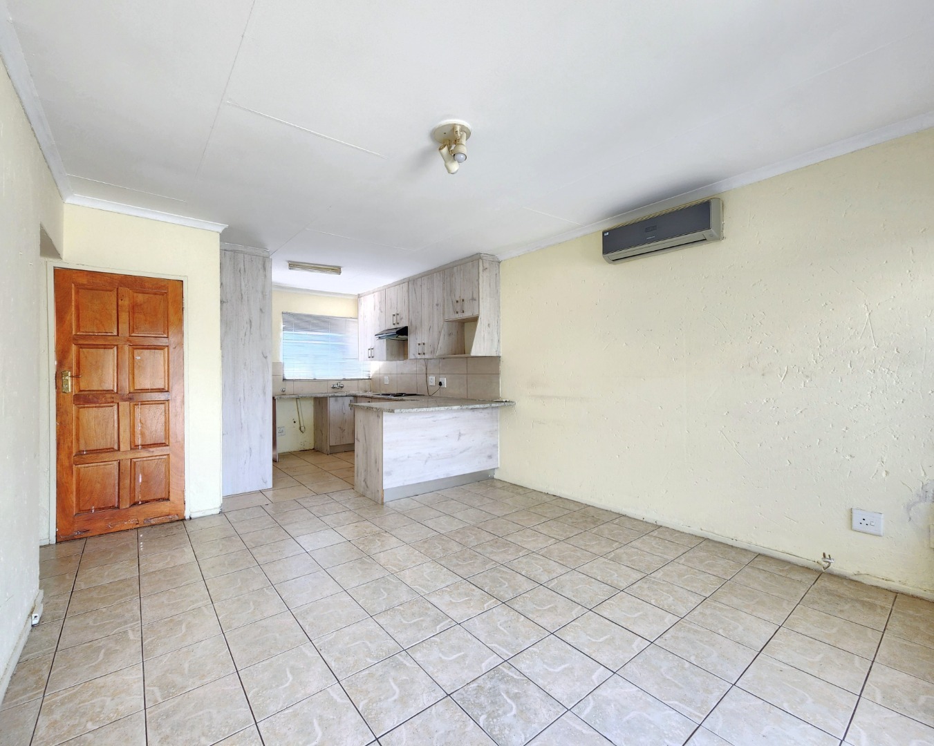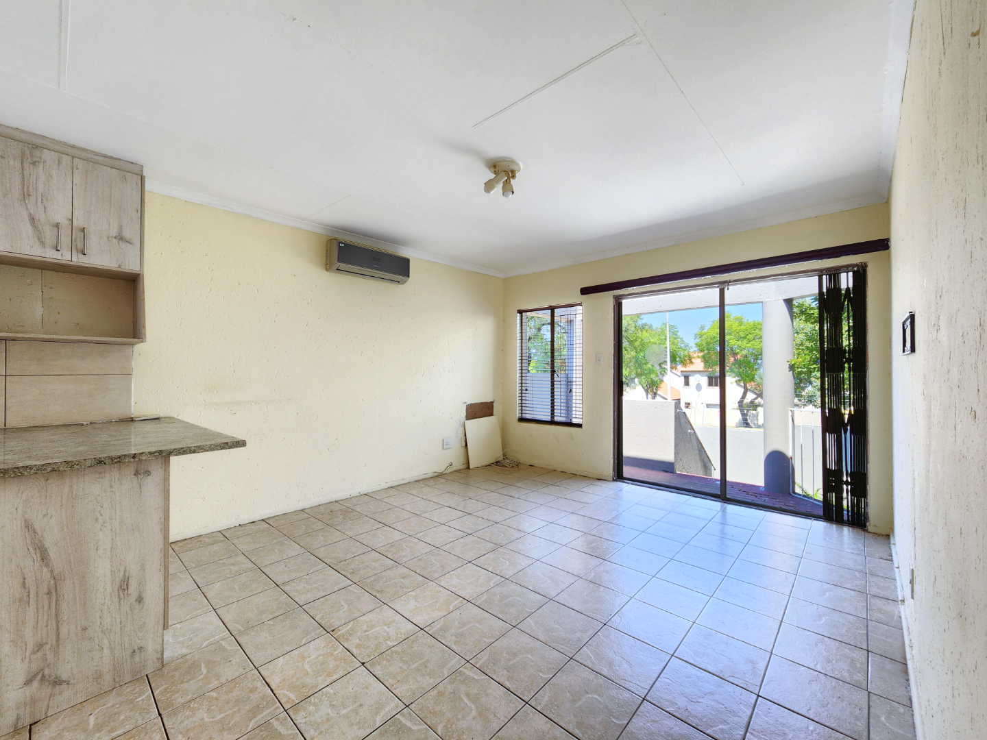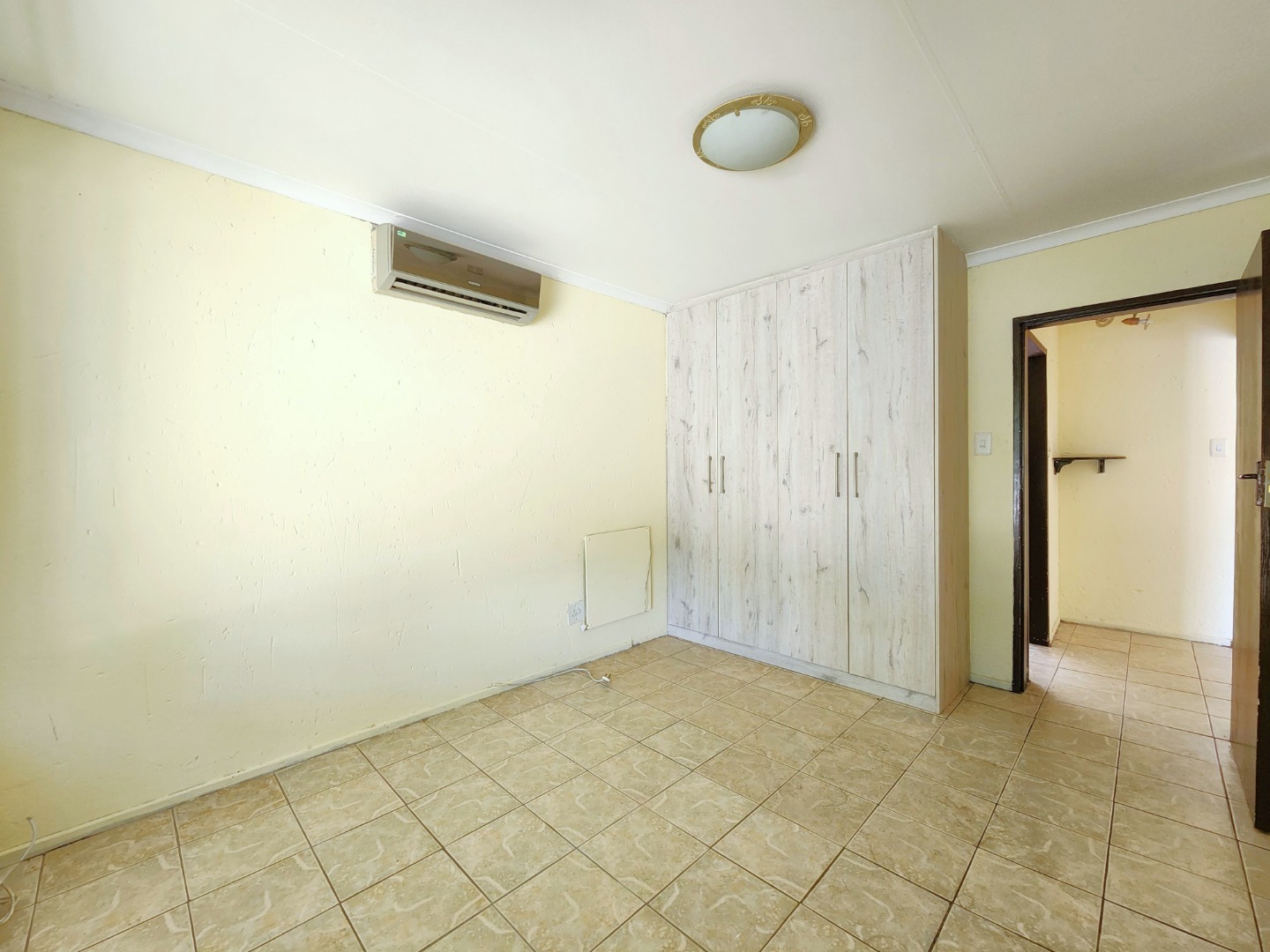 The spacious bedroom features generous built-in cupboards and its own air conditioner for year-round comfort. The bathroom is neat and modern, offering a shower, basin, and toilet.