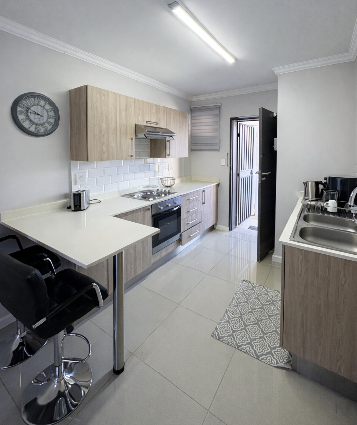 The kitchen is thoughtfully designed with light wood grain cabinetry, a built in stovetop and a functional breakfast counter, creating a practical yet stylish space for everyday living.