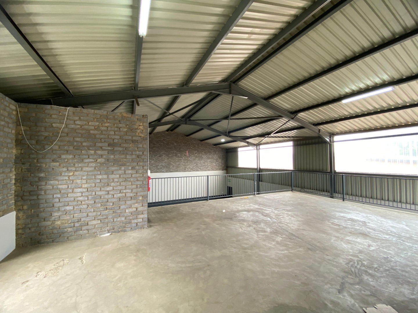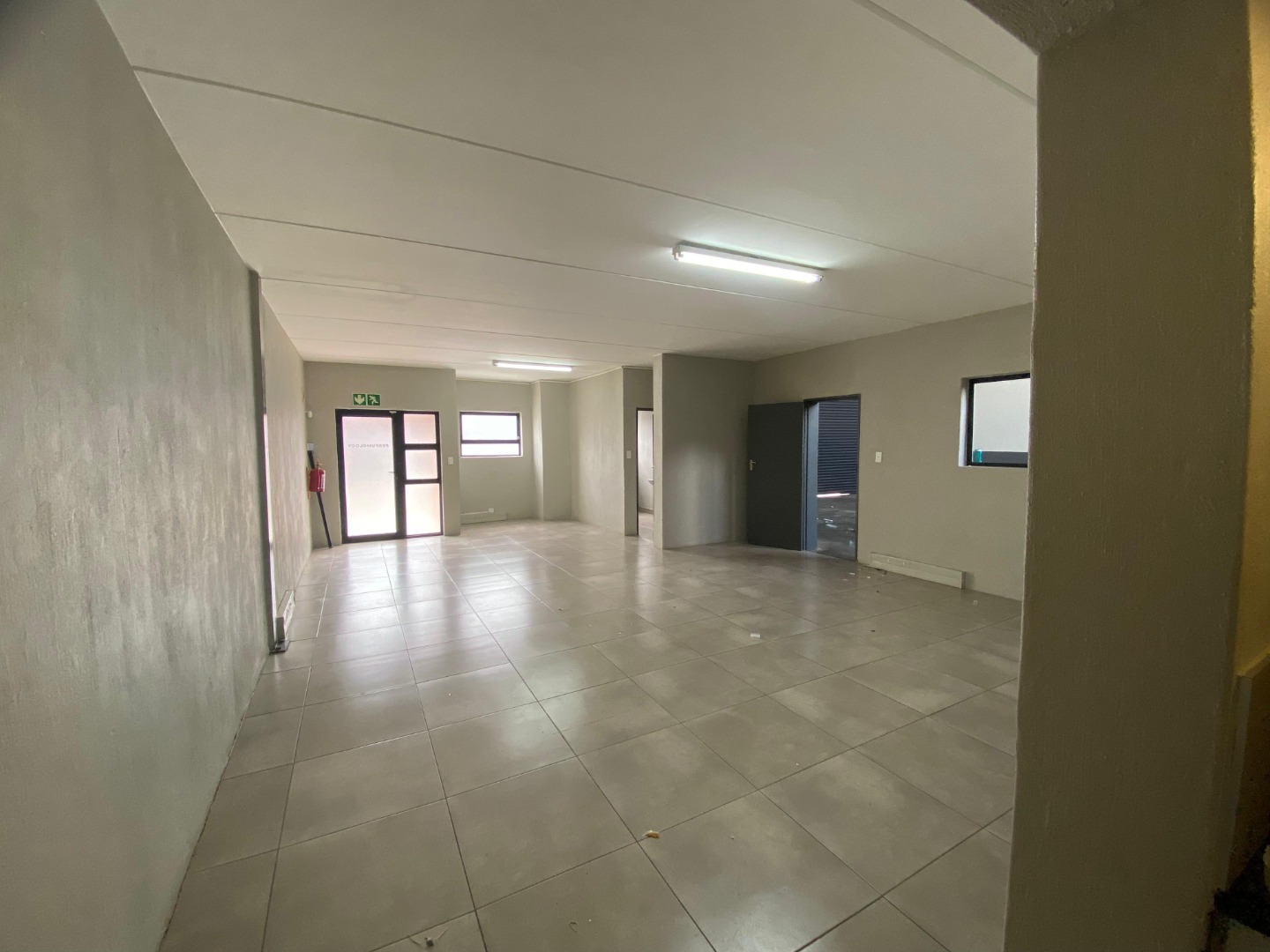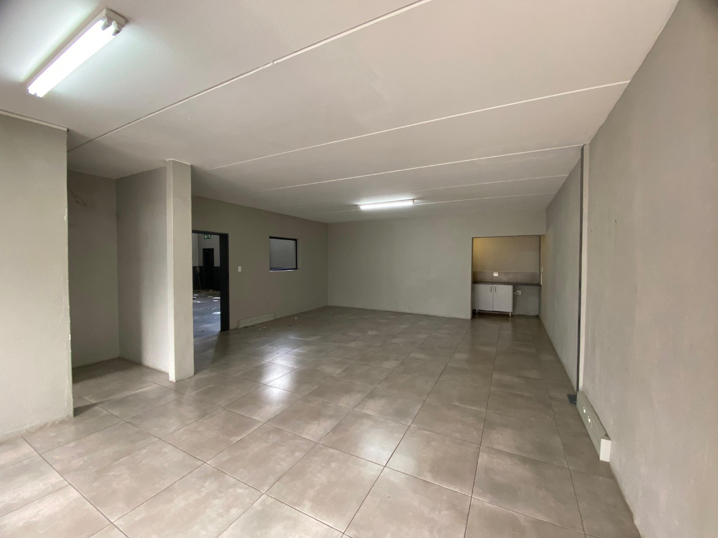 Inside, the spacious layout boasts high ceilings and an open-plan design, providing exceptional flexibility for various business operations, from office space to light industrial or storage. The interior is characterized by durable tiled flooring, neutral walls, and ample fluorescent lighting, complemented by natural light from multiple windows. An integrated kitchenette and two bathrooms enhance functionality.