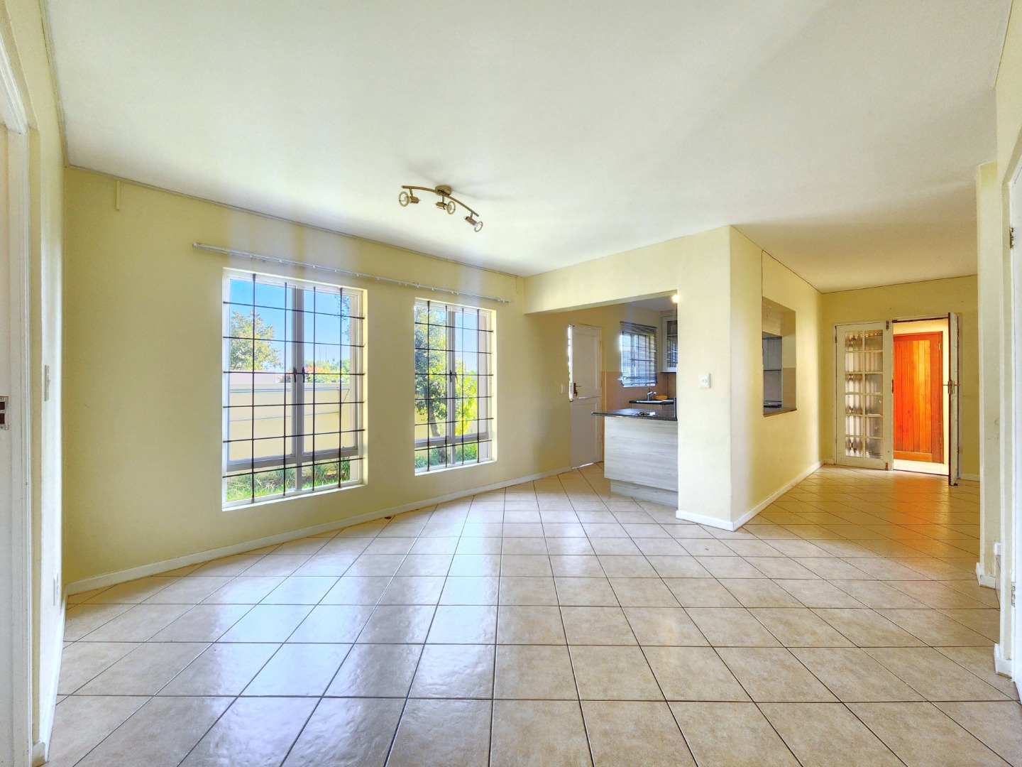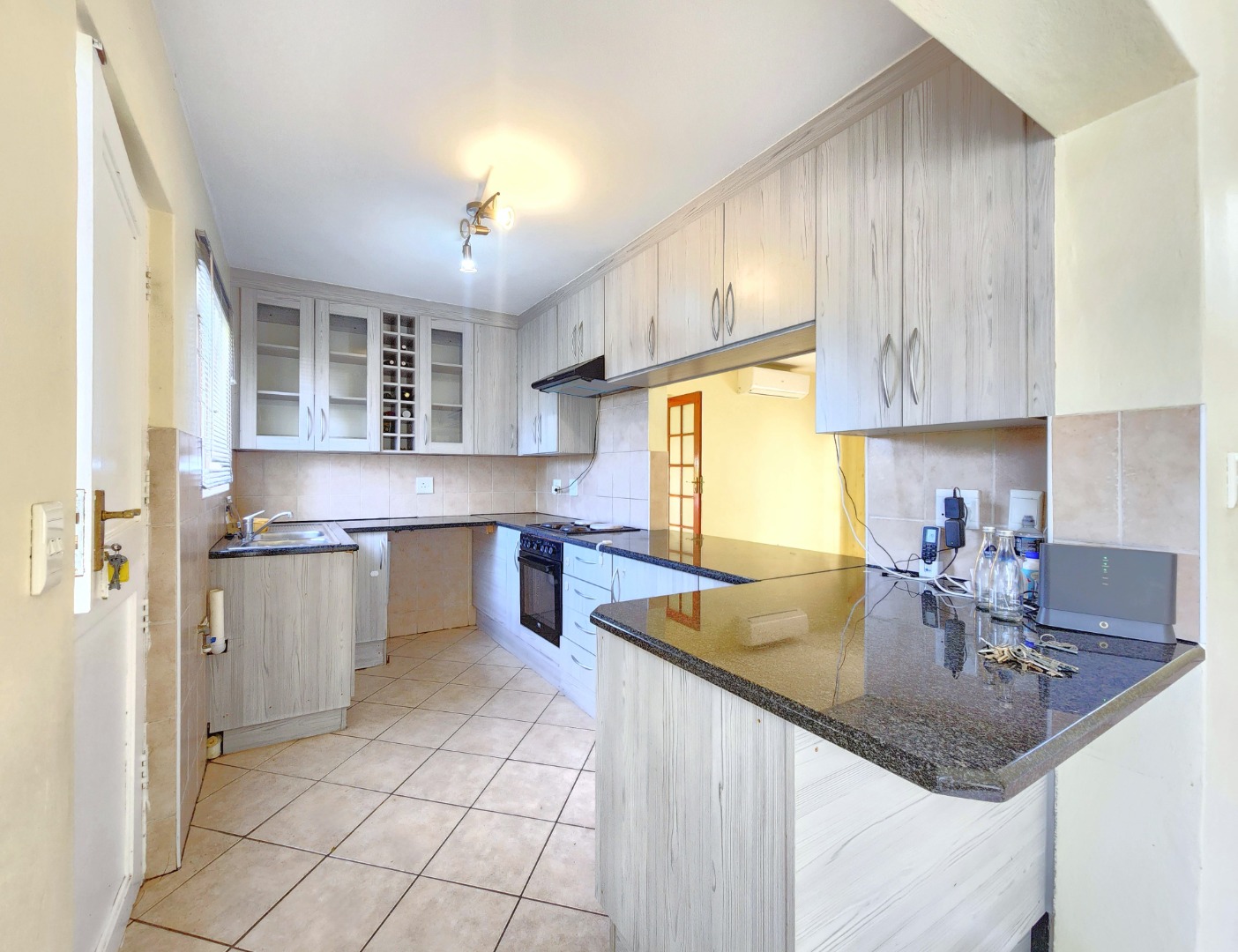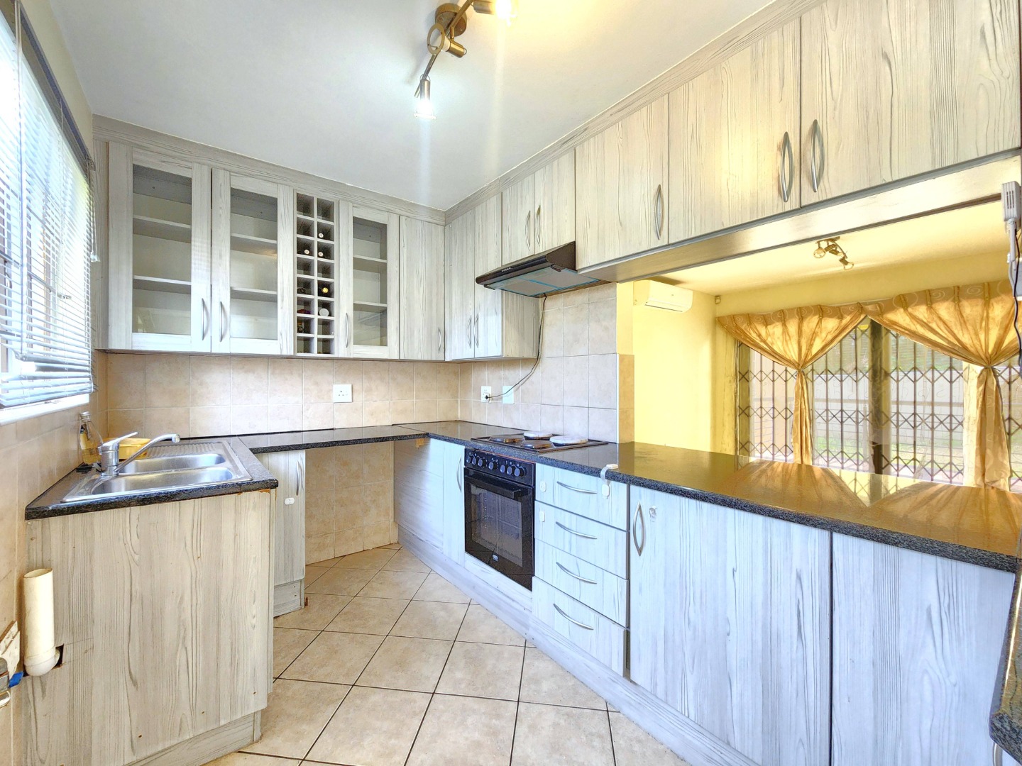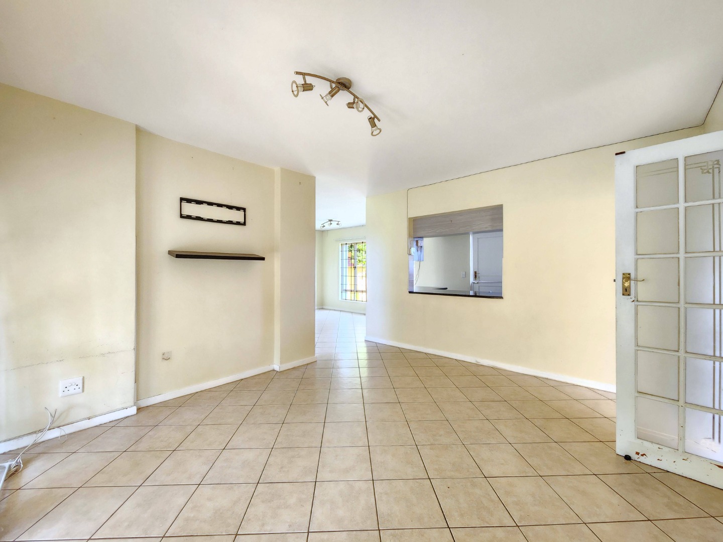 The home features a modern open-plan layout that seamlessly connects the kitchen, dining, and TV/family area, creating a warm and inviting space ideal for both everyday living and entertaining. The kitchen is fully fitted with built-in cupboards and ample countertop space, making it perfect for preparing meals with ease.