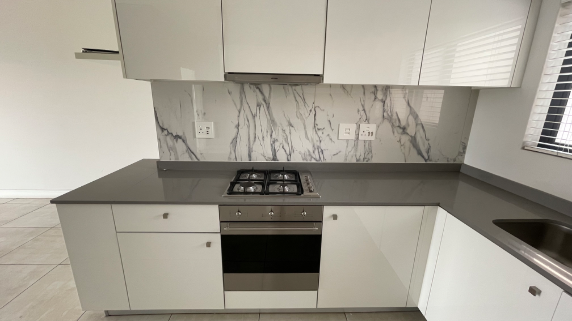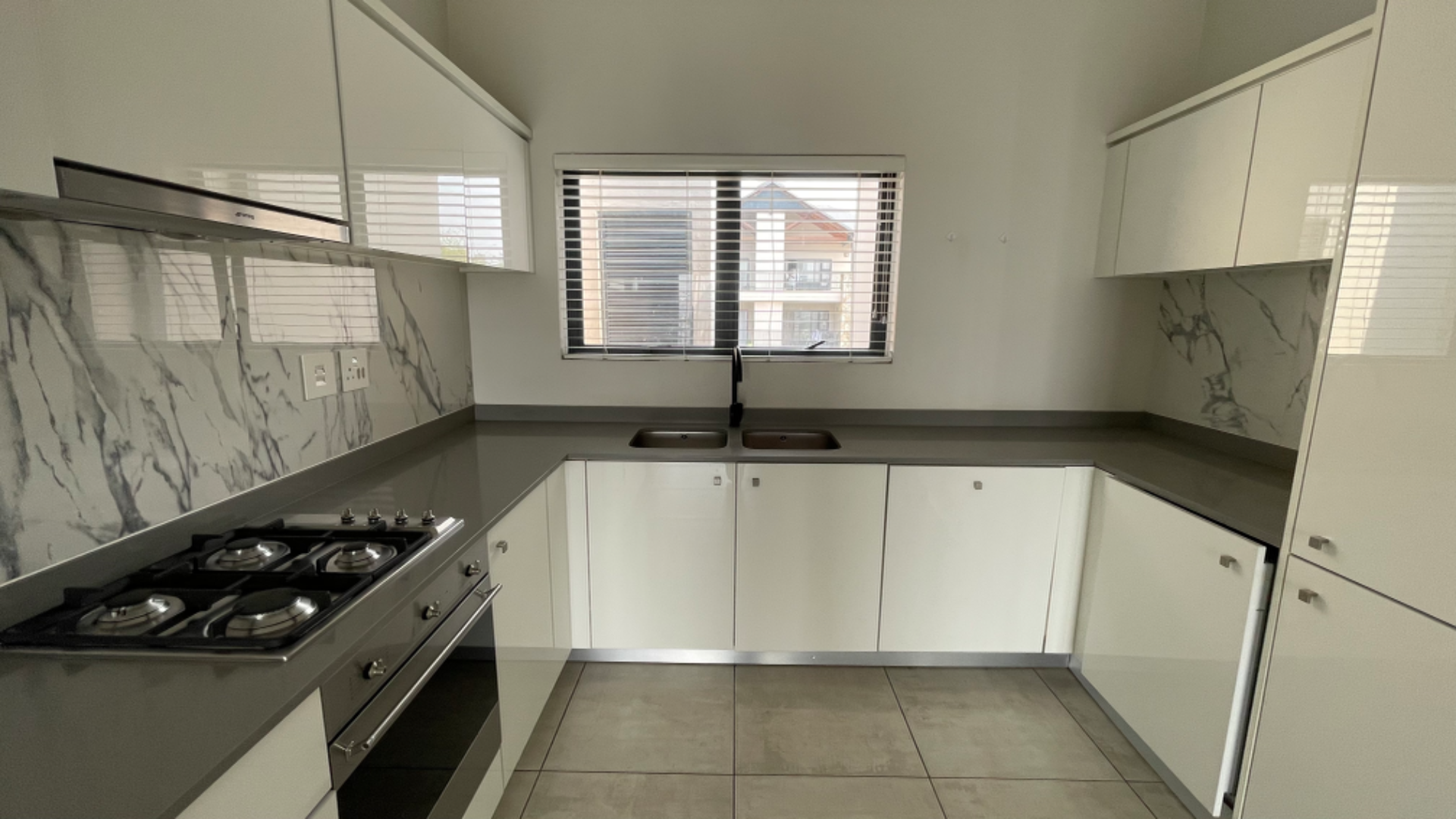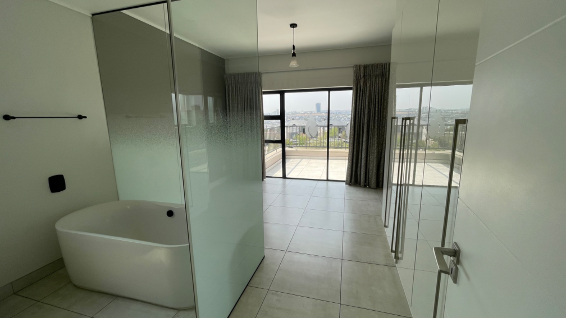 The apartment boasts a sleek, open-plan design with high-quality finishes. The modern kitchen features white gloss cabinetry, dark grey countertops, a marble-patterned backsplash, gas hob, integrated oven, and a Smeg extractor fan. The spacious lounge and dining area, with tiled flooring, flow seamlessly to an expansive, tiled balcony offering scenic city views. Both bedrooms include glossy built-in cupboards and direct balcony access. The two bathrooms, including one en-suite, present modern aesthetics with clean lines, featuring a freestanding bathtub and a glass-enclosed shower.