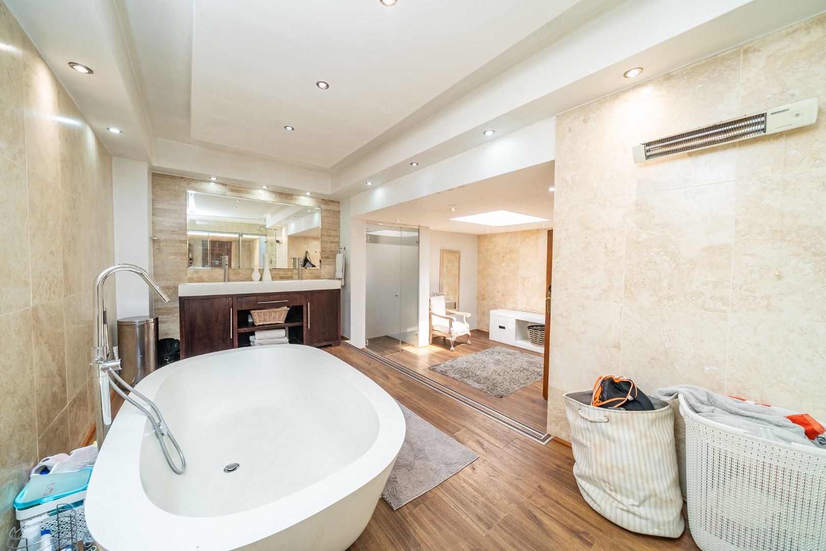 The homes three bedrooms offer space and privacy, each a sanctuary of comfort. Two of the bedrooms open directly to the gardens blending the line between indoor luxury and natural beauty. The main en-suite is a true retreat, featuring a walk-in closet and dressing room that lead to an indulgent bathroom. Here, you can unwind in the refreshing bathtub, enjoy the shower, or relax in the sauna, with the convenience of a double basin adding to the space's functionality.