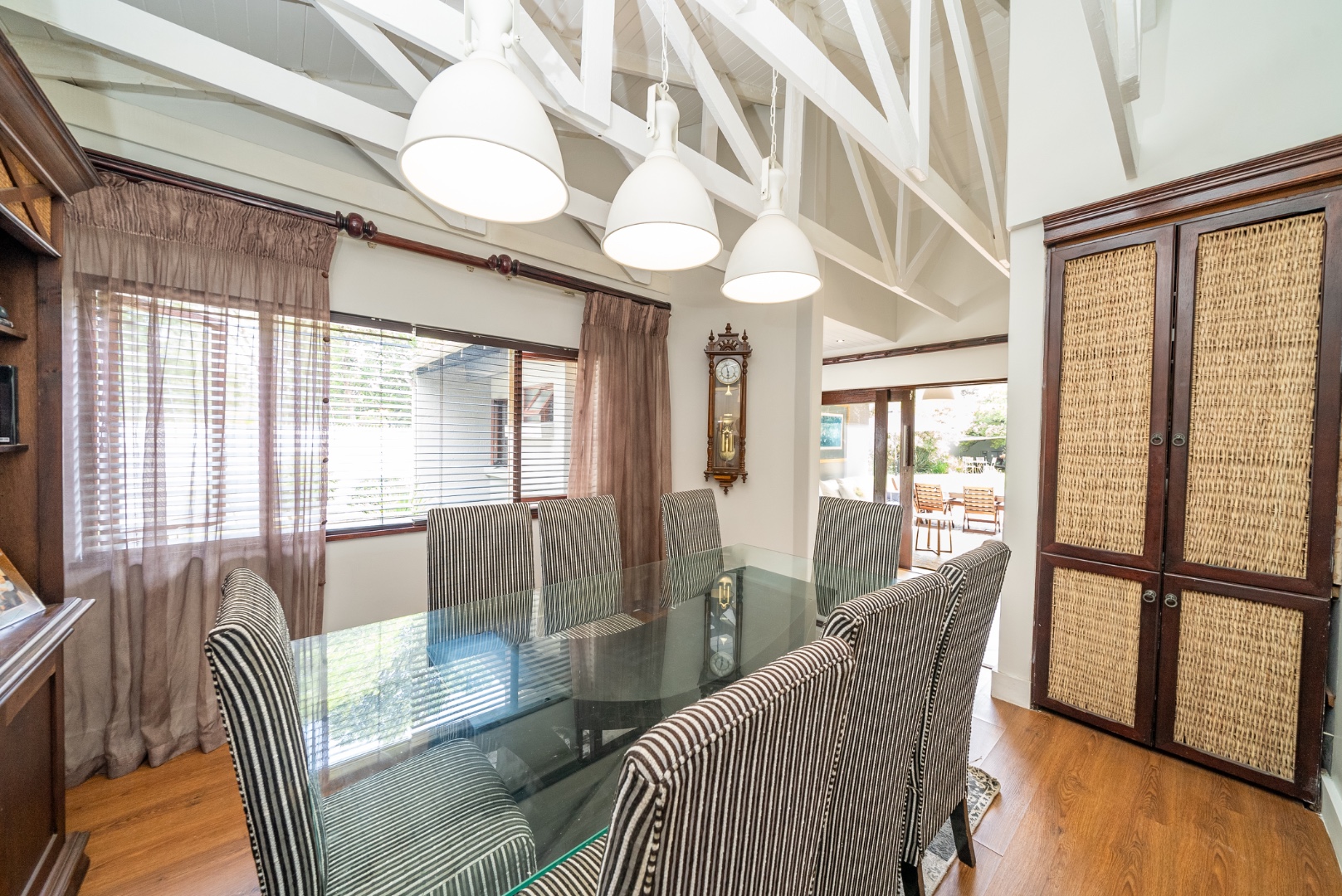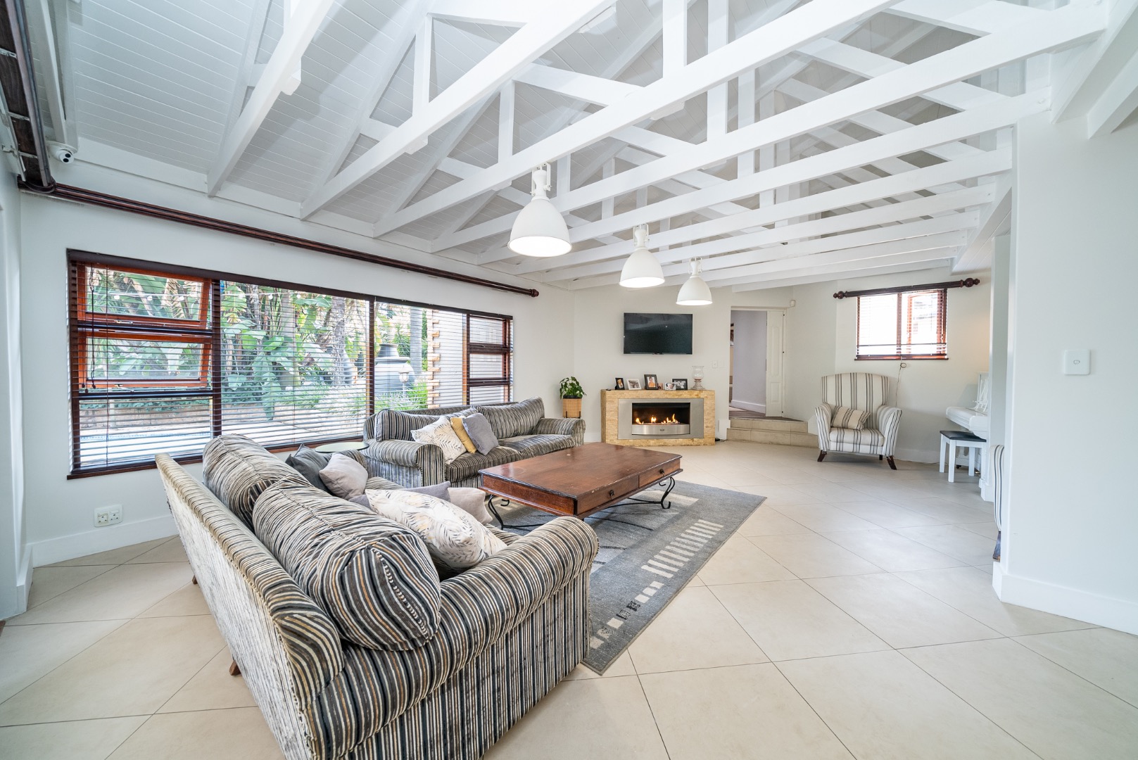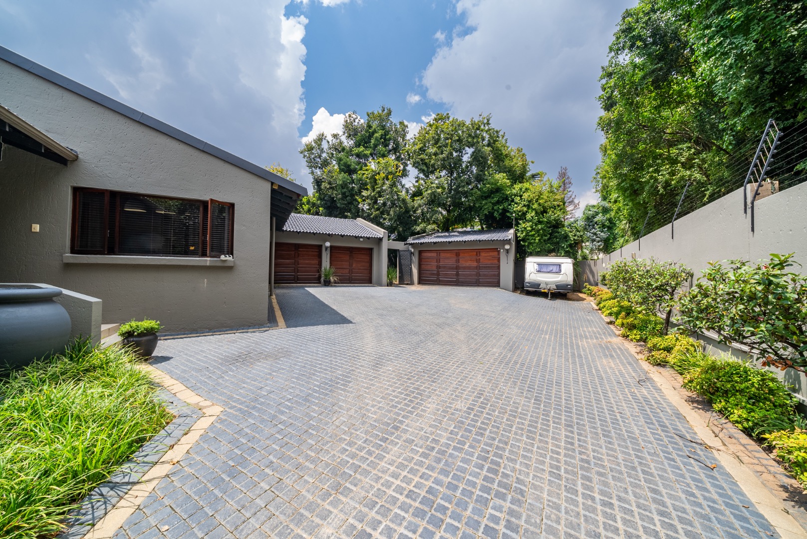 Beyond the central living areas, this property is replete with thoughtful amenities: a tranquil koi pond, robust security with CCTV cameras, and the convenience of a borehole. Parking is plentiful with two double garages, and extra spaces like a storeroom, a versatile room adaptable as a playroom or office, an outdoor toilet and a courtyard off the kitchen enhance its practicality,