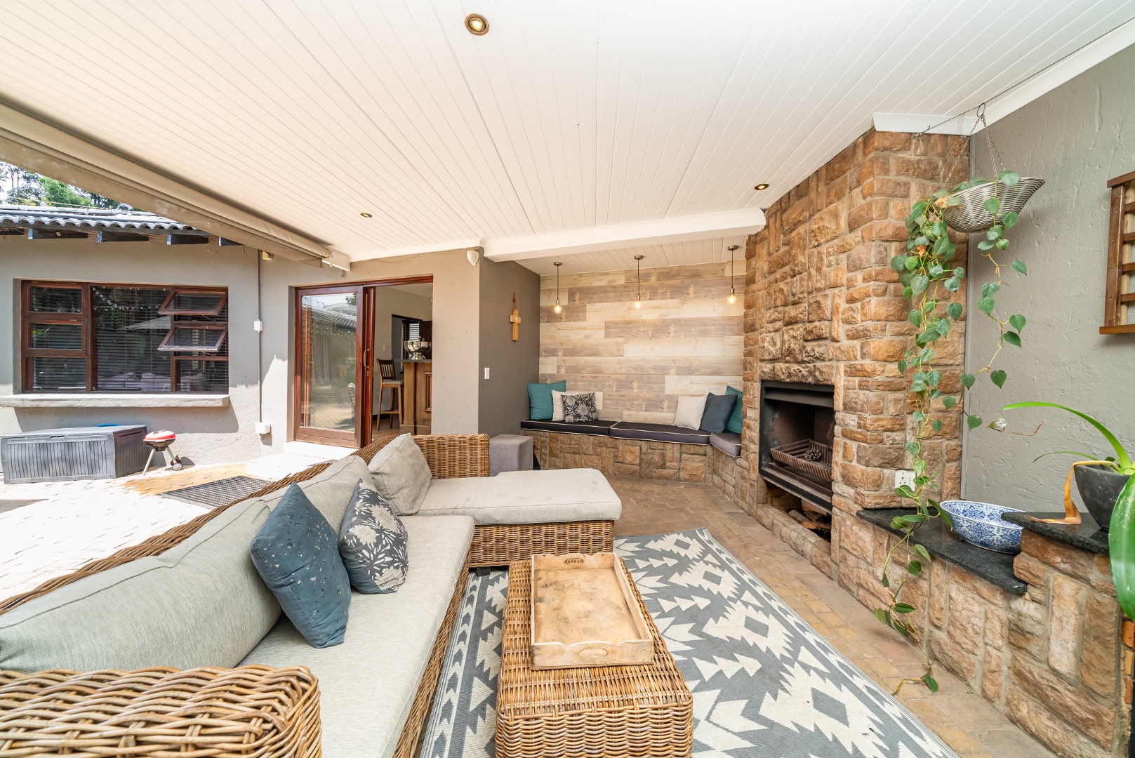 The private lounge, an oasis of tranquillity connects to a tastefully designed bar with elegant marble counter tops. From here, the doors reveal yet another covered patio, equipped with a wood burning fireplace for enchanting outdoor dining experiences amidst the verdant gardens.