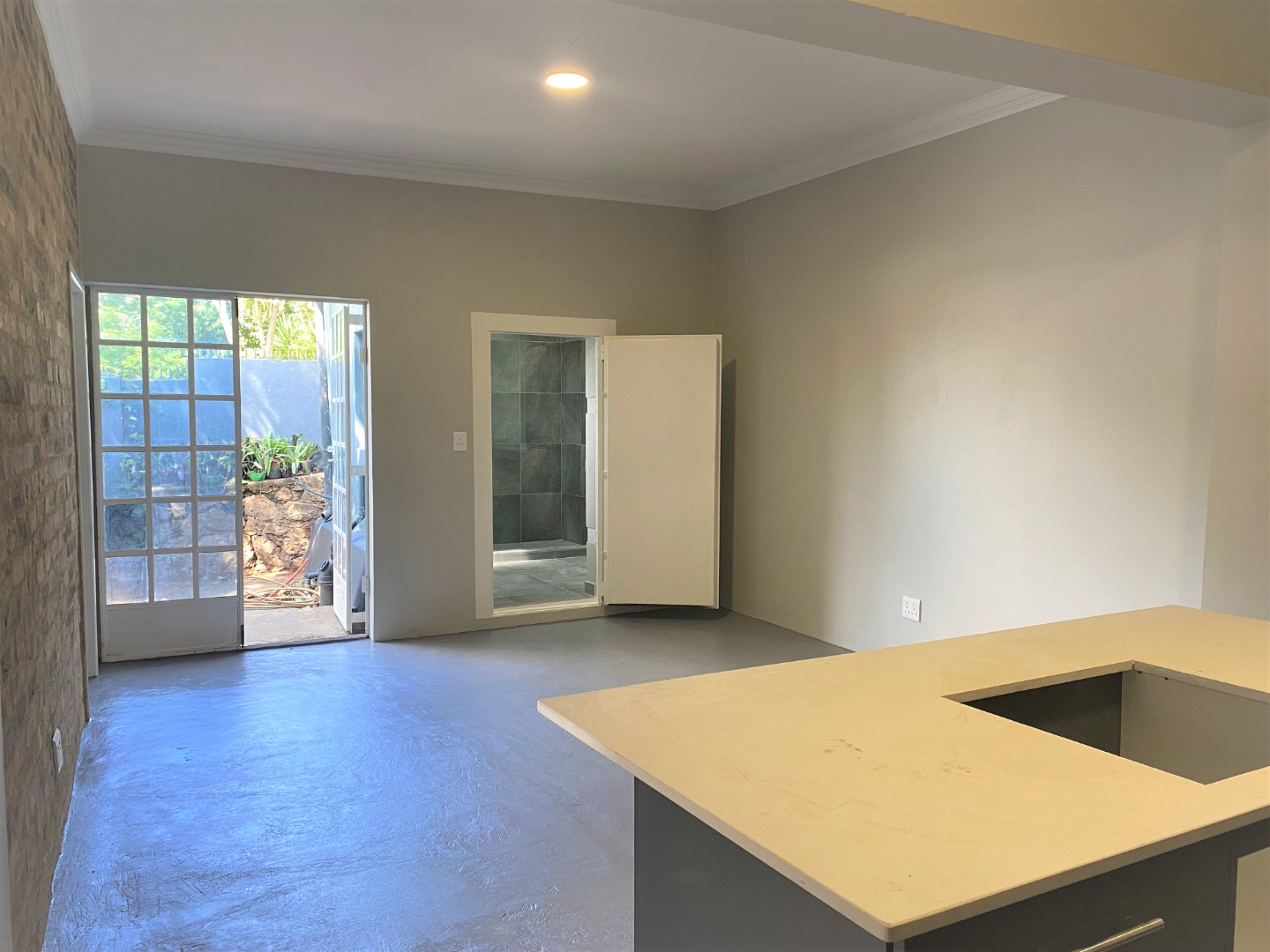 The kitchen area is designed with a sleek, modern island, perfect for cooking up a storm or just hanging out. While it's ready for your final touches, it offers ample counter space and a contemporary feel. From the living area, you can step right out through glass doors to an outdoor space – great for a bit of fresh air or a small garden. The bathroom is also newly renovated with modern dark tiling, giving it a clean and stylish look.