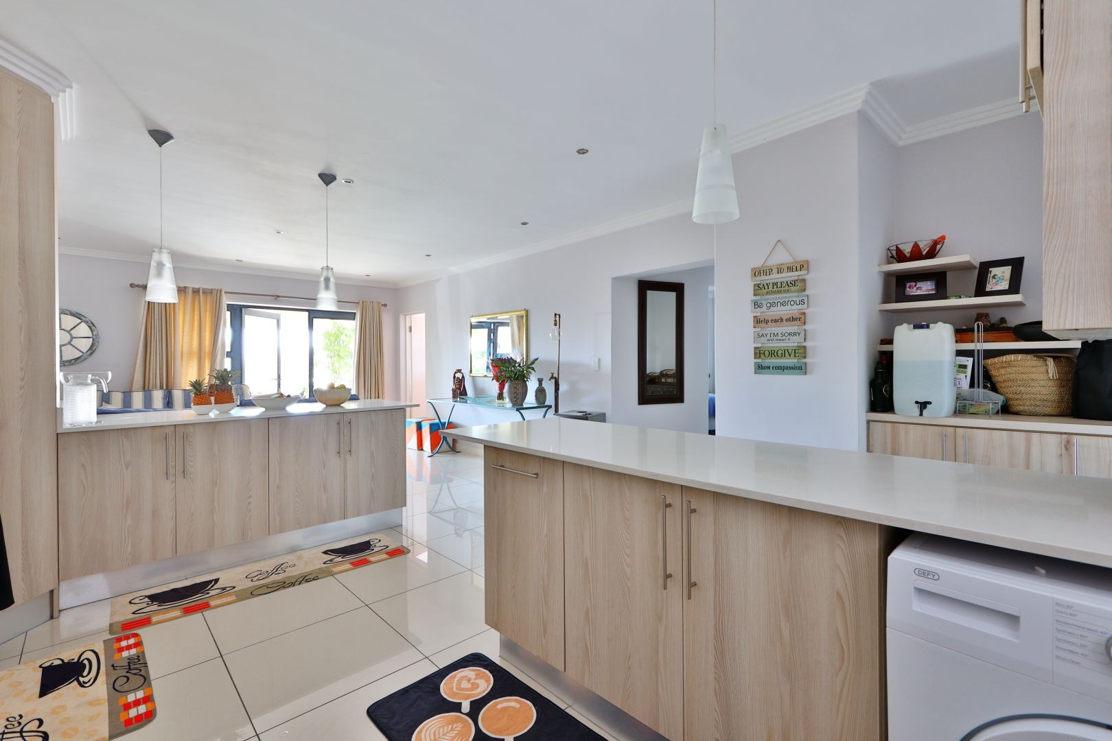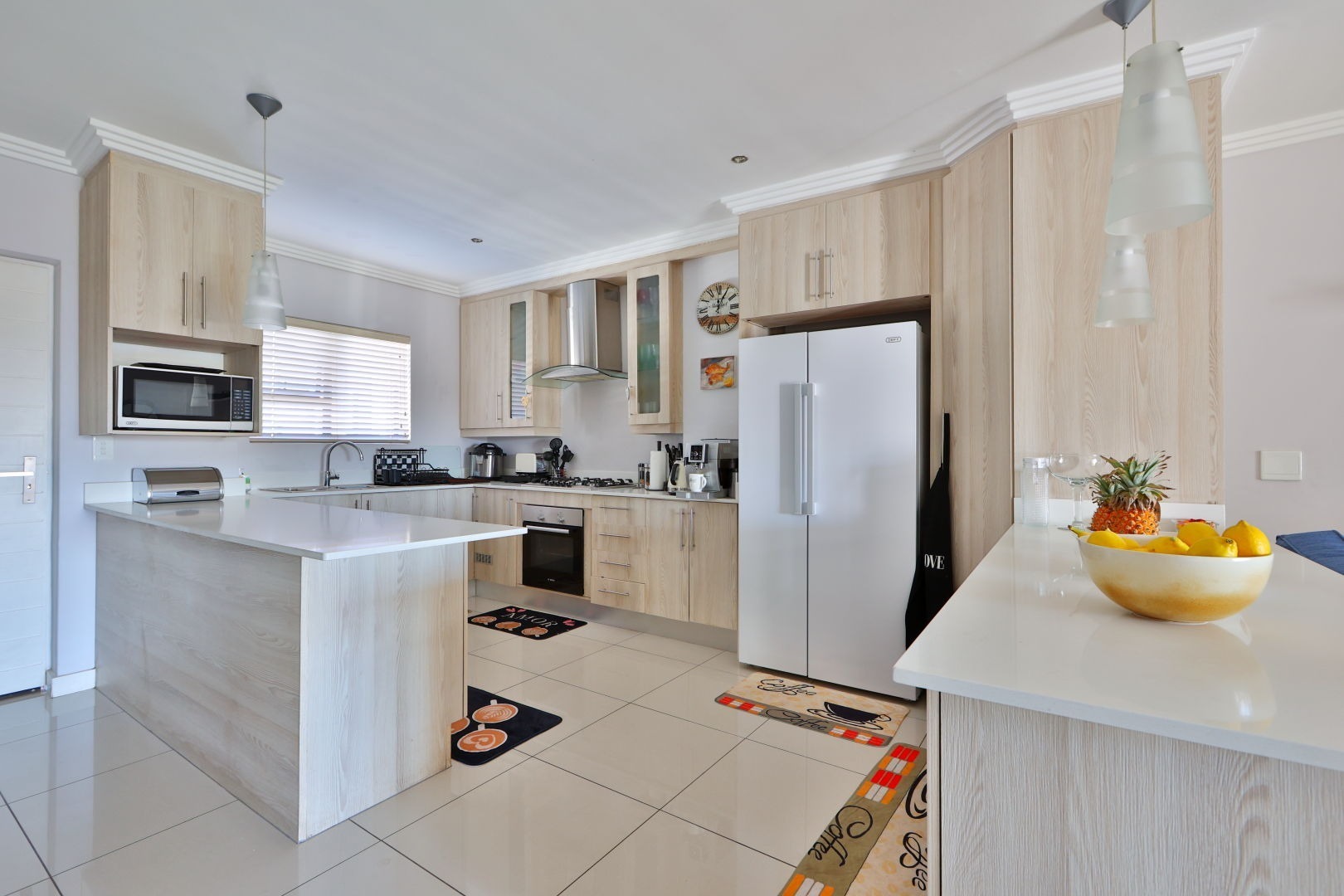 Kitchen has light wood cabinets and Caesarstone tops with a gas hob and space for a double-door fridge and washing machine (separate laundry cupboard for the dryer).