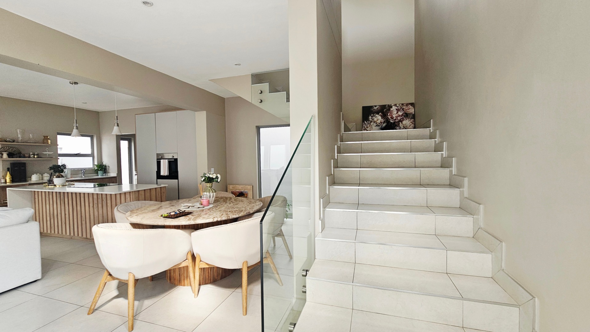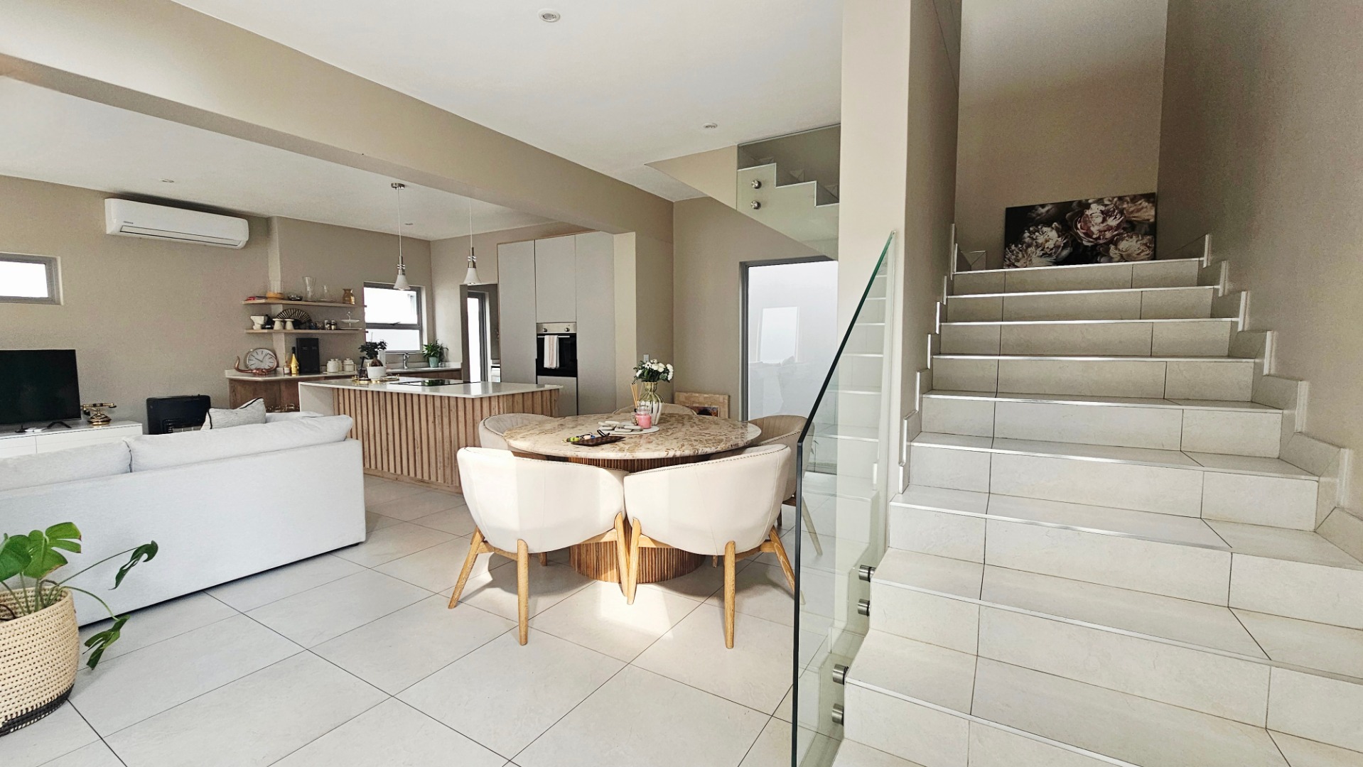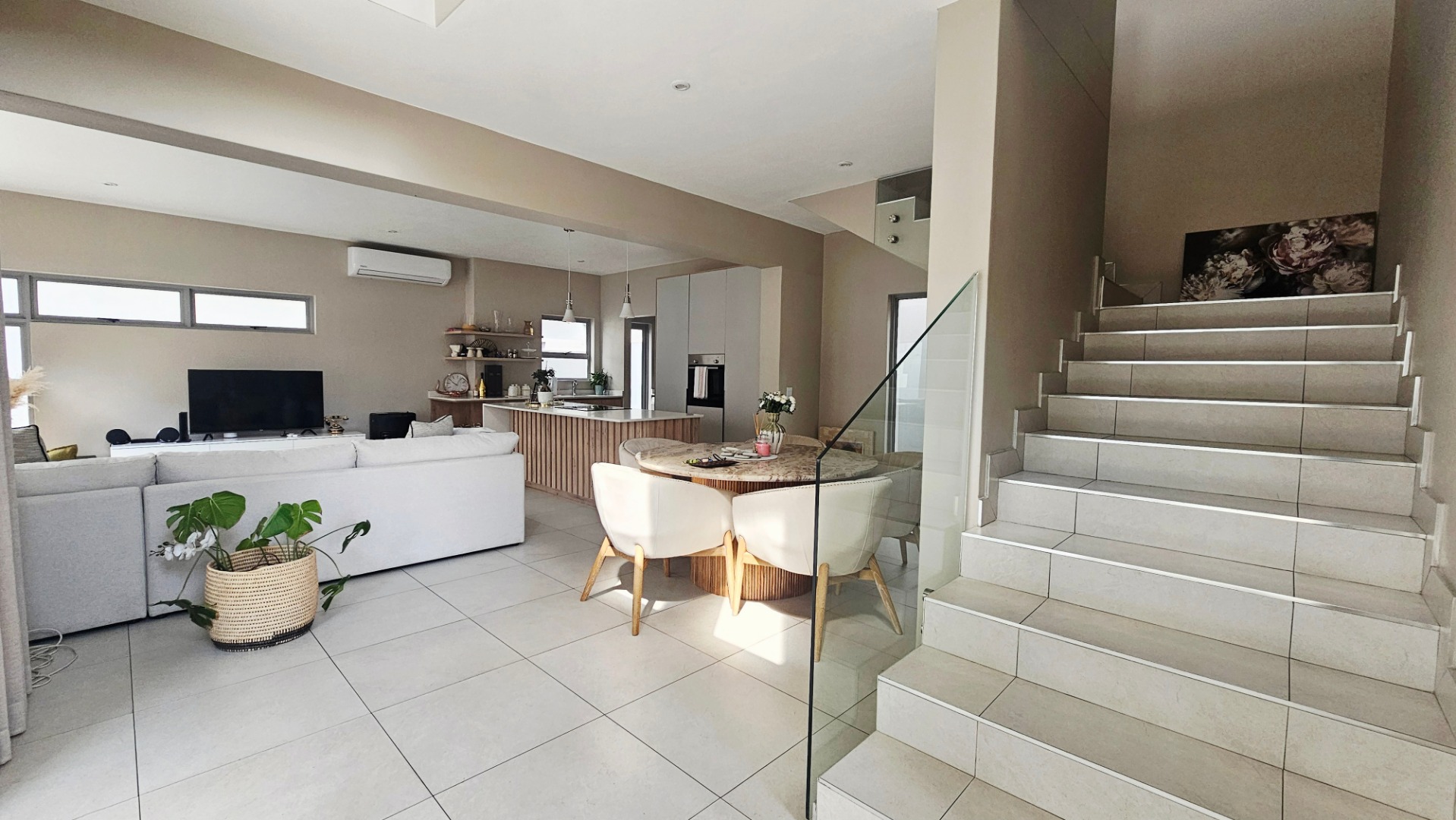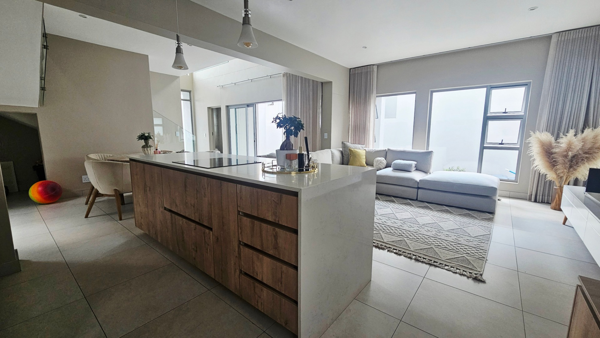 The heart of this home is its sleek, contemporary kitchen, equipped with a large island, integrated hob, ample storage, and a dedicated scullery, designed for both culinary artistry and effortless entertaining. High ceilings, a neutral colour palette, and stylish tiled flooring flow seamlessly throughout, enhanced by special lighting and a striking glass-paneled staircase. Air conditioning ensures year-round comfort, while the seamless transition to a private patio and sparkling pool offers an idyllic setting for relaxation and outdoor enjoyment. Practical amenities include staff quarters and a double garage.