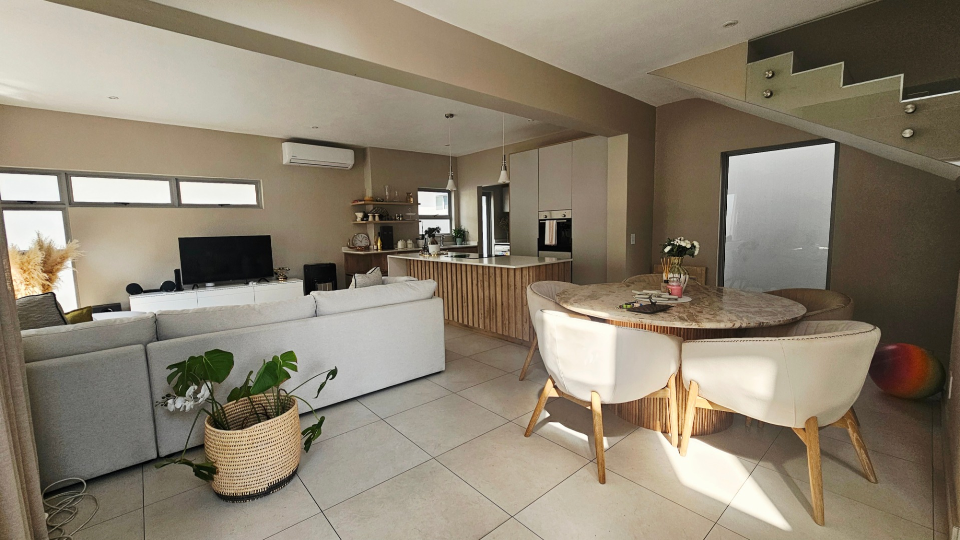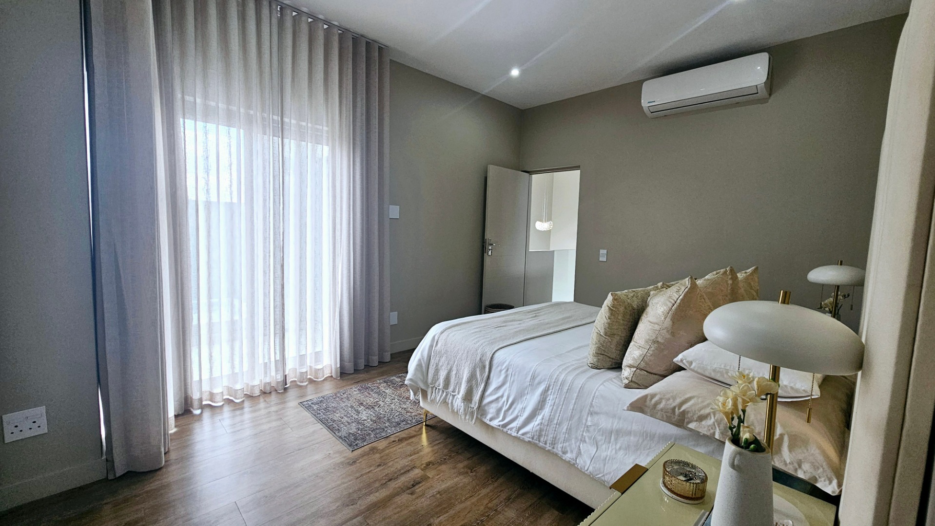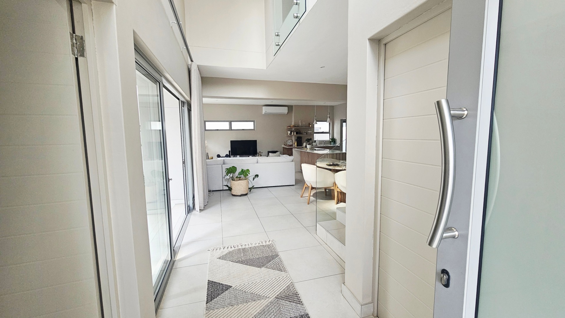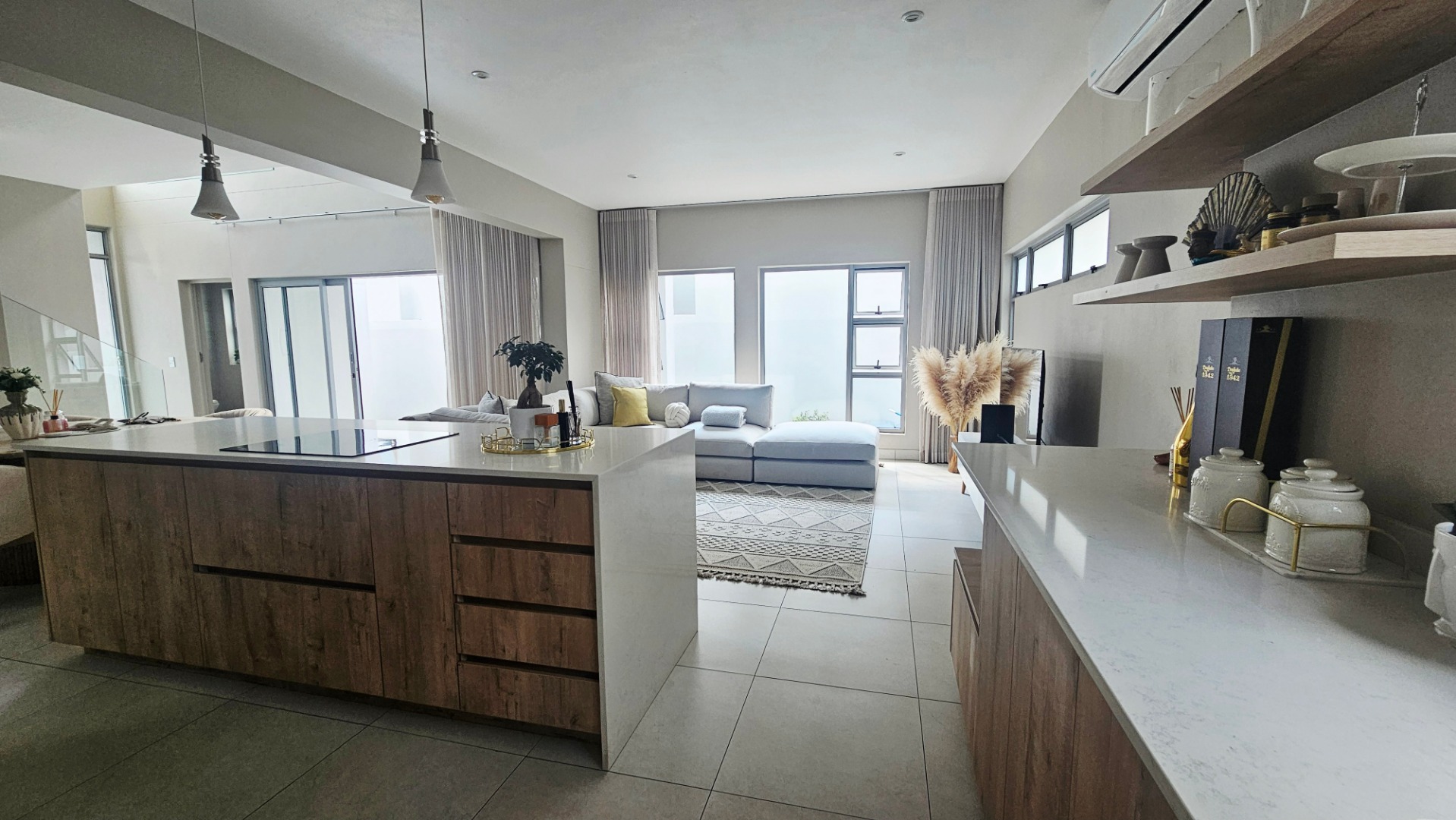 The heart of this home is its sleek, contemporary kitchen, equipped with a large island, integrated hob, ample storage, and a dedicated scullery, designed for both culinary artistry and effortless entertaining. High ceilings, a neutral colour palette, and stylish tiled flooring flow seamlessly throughout, enhanced by special lighting and a striking glass-paneled staircase. Air conditioning ensures year-round comfort, while the seamless transition to a private patio and sparkling pool offers an idyllic setting for relaxation and outdoor enjoyment. Practical amenities include staff quarters and a double garage.