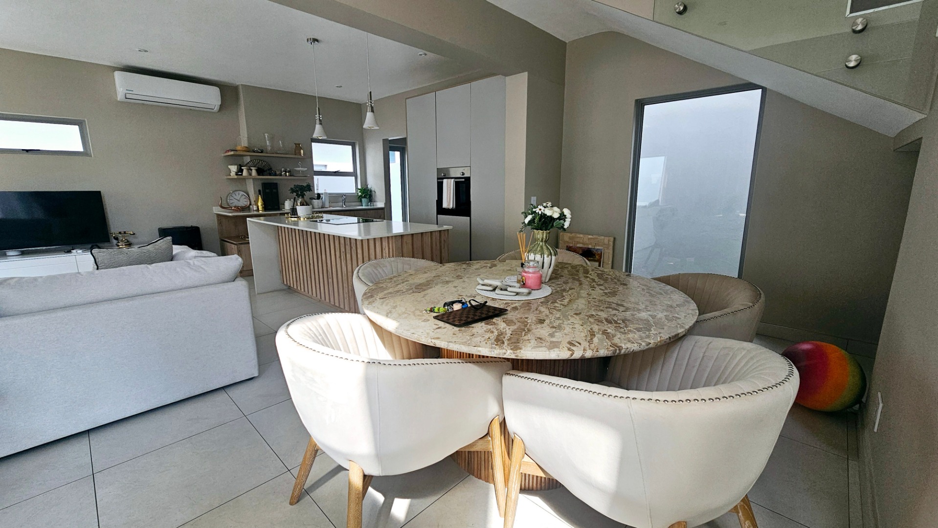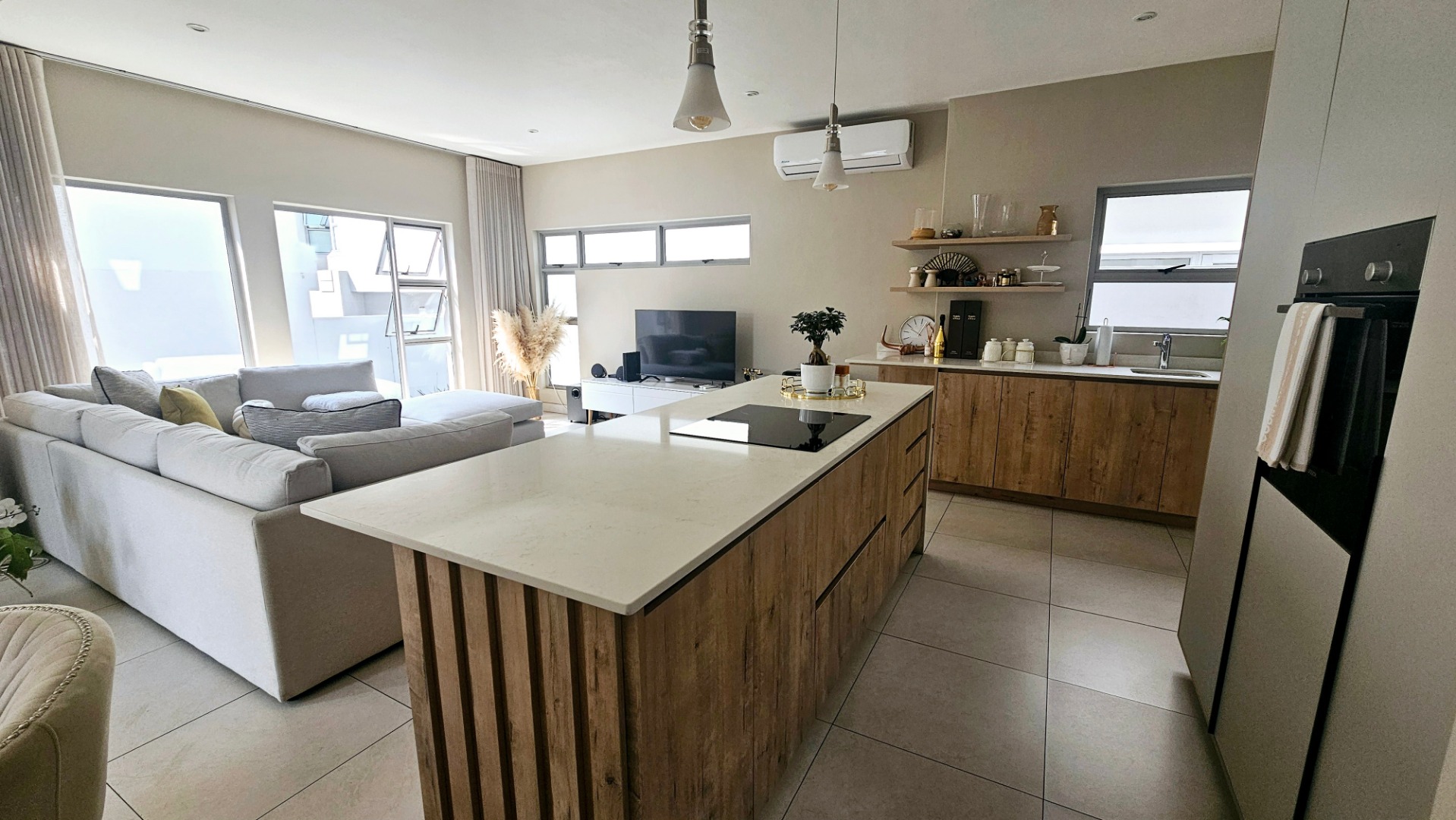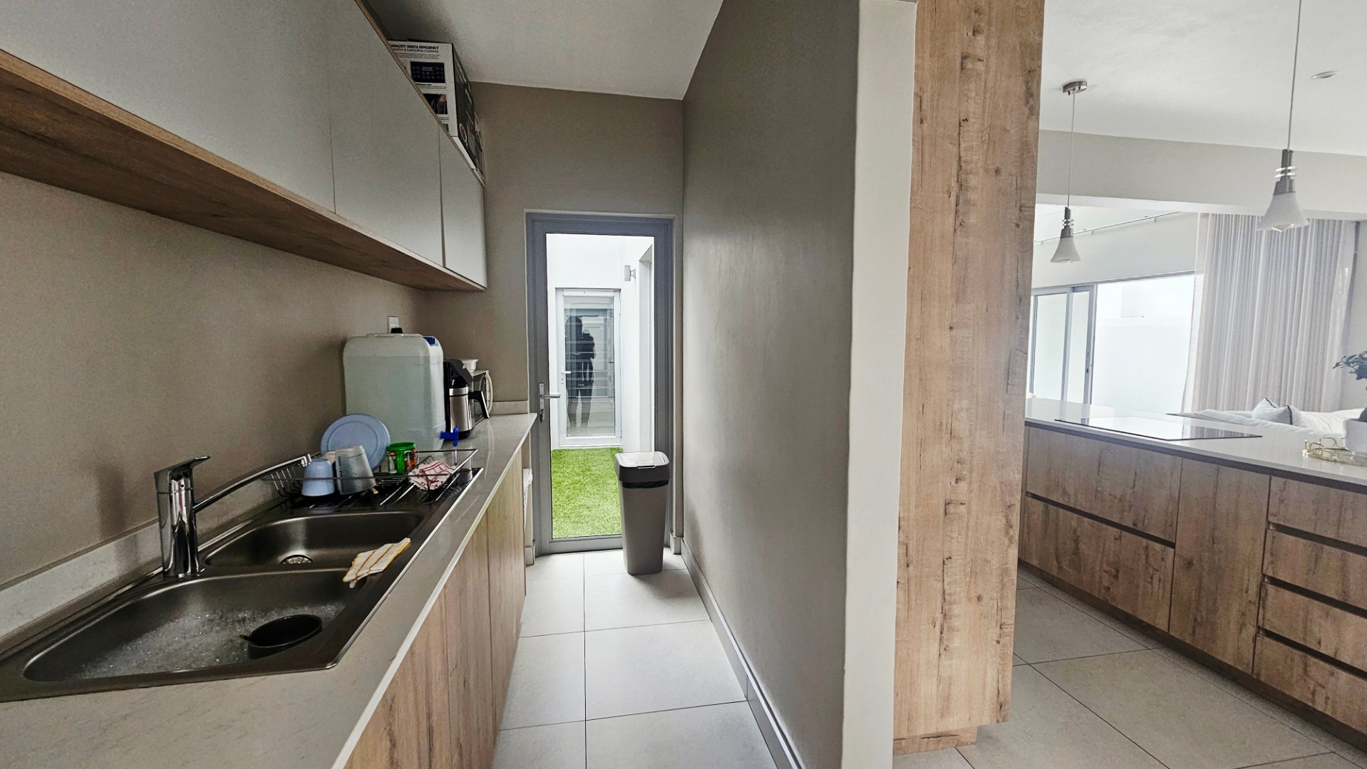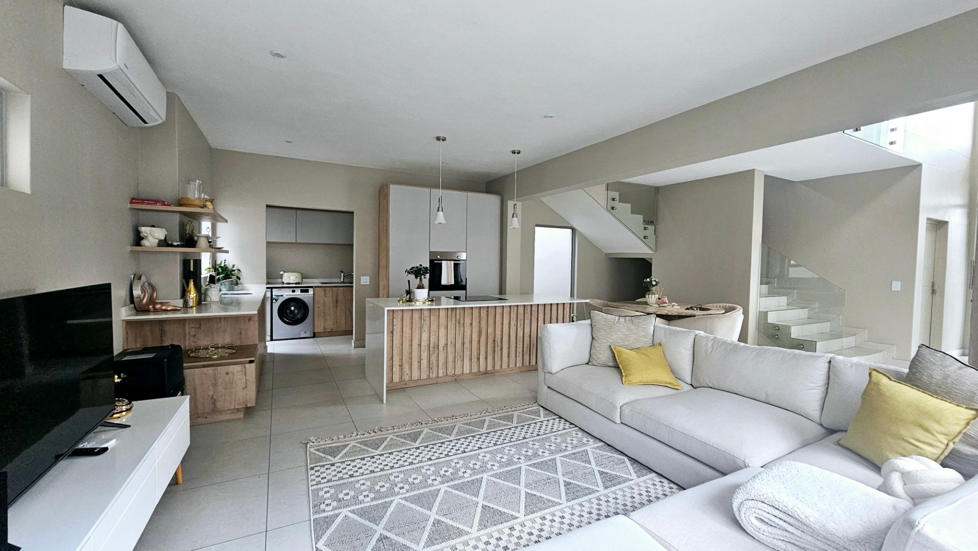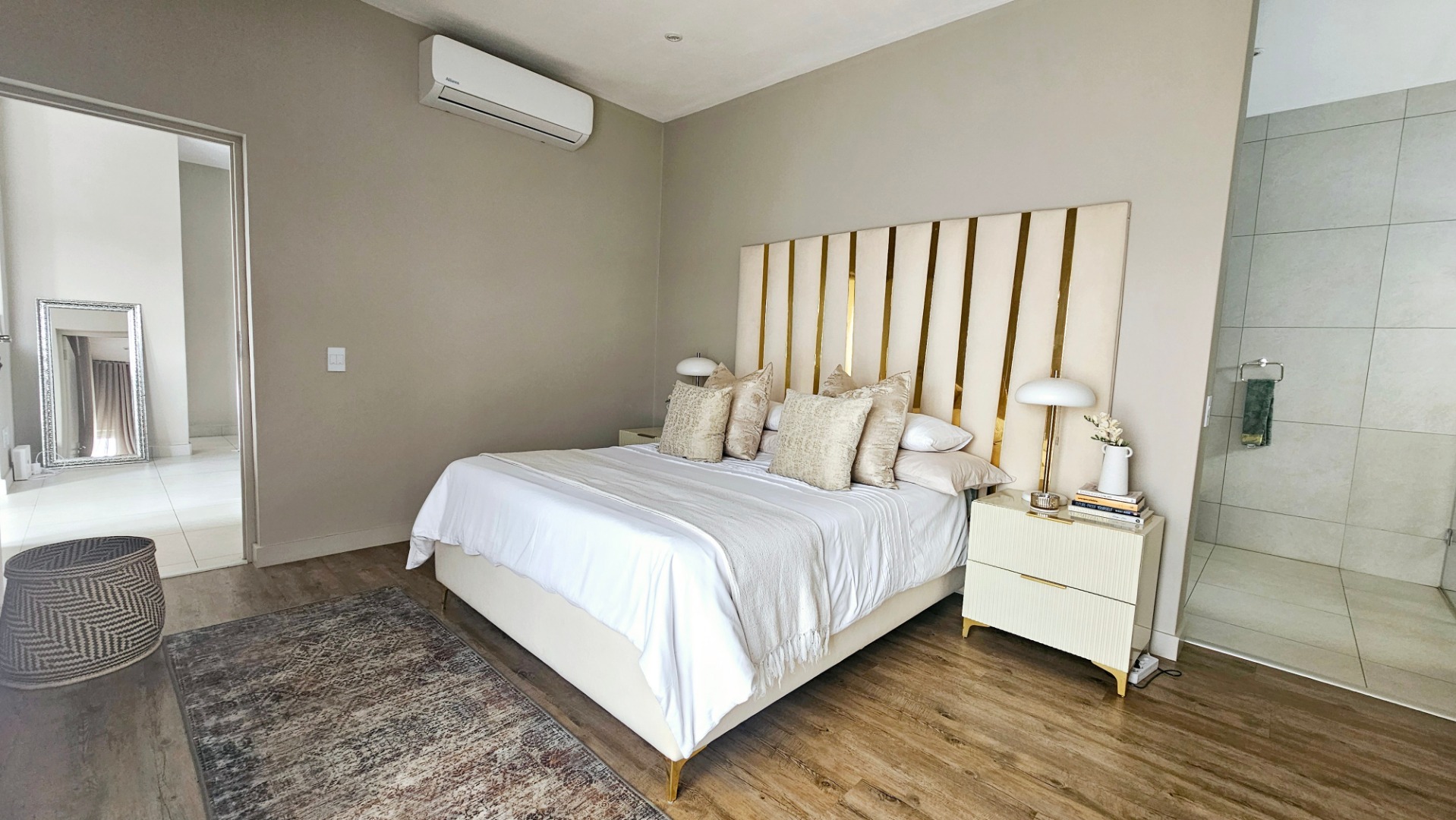 The heart of this home is its sleek, contemporary kitchen, equipped with a large island, integrated hob, ample storage, and a dedicated scullery, designed for both culinary artistry and effortless entertaining. High ceilings, a neutral colour palette, and stylish tiled flooring flow seamlessly throughout, enhanced by special lighting and a striking glass-paneled staircase. Air conditioning ensures year-round comfort, while the seamless transition to a private patio and sparkling pool offers an idyllic setting for relaxation and outdoor enjoyment. Practical amenities include staff quarters and a double garage.