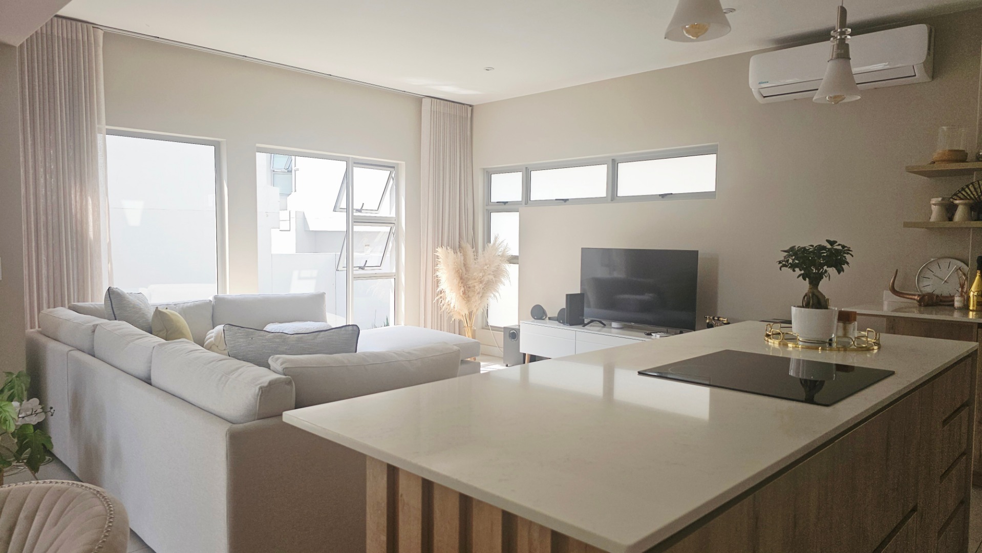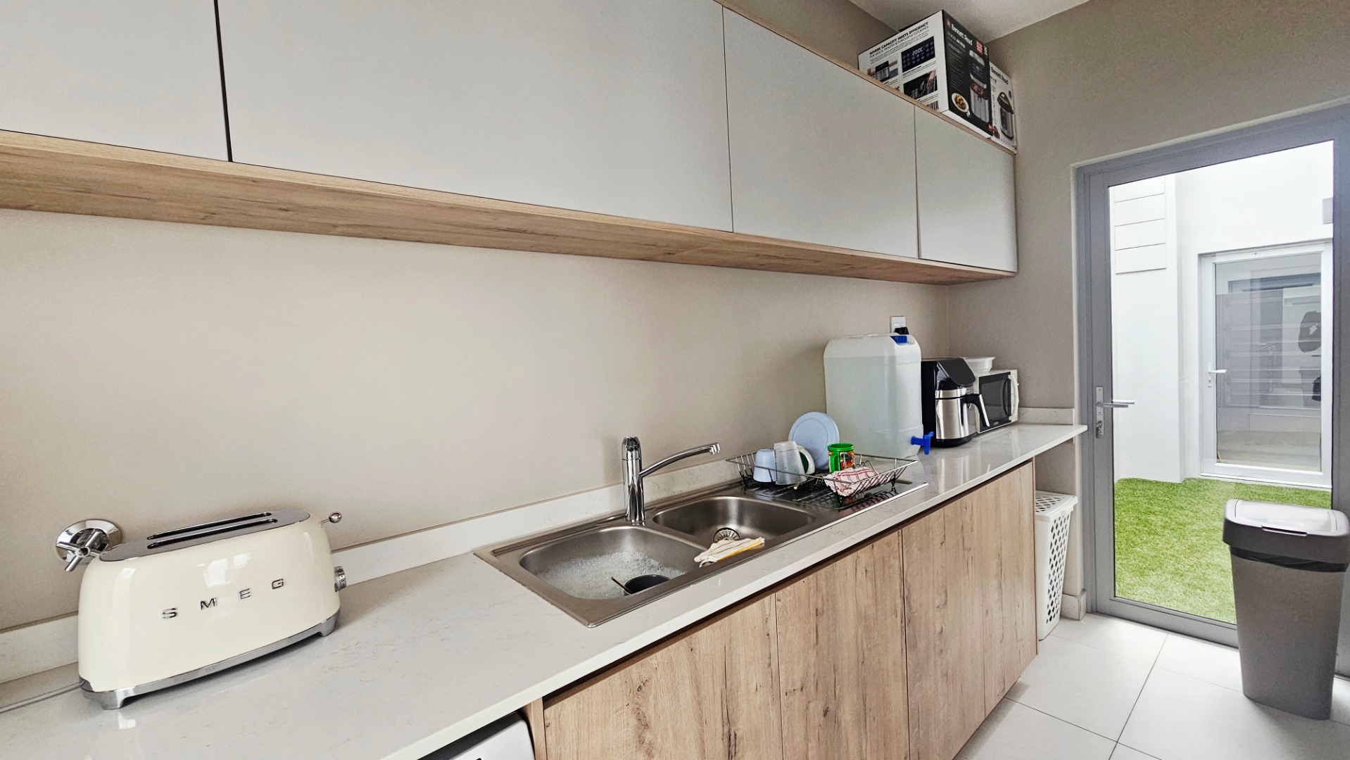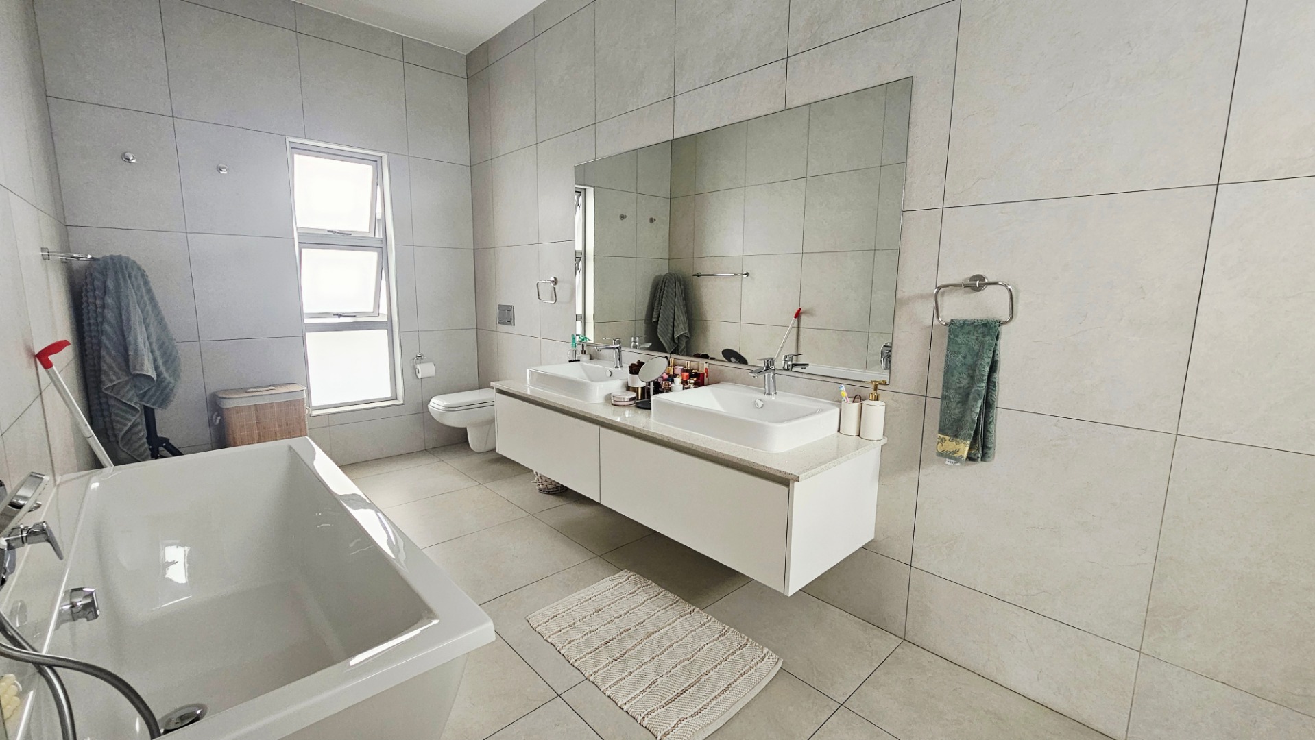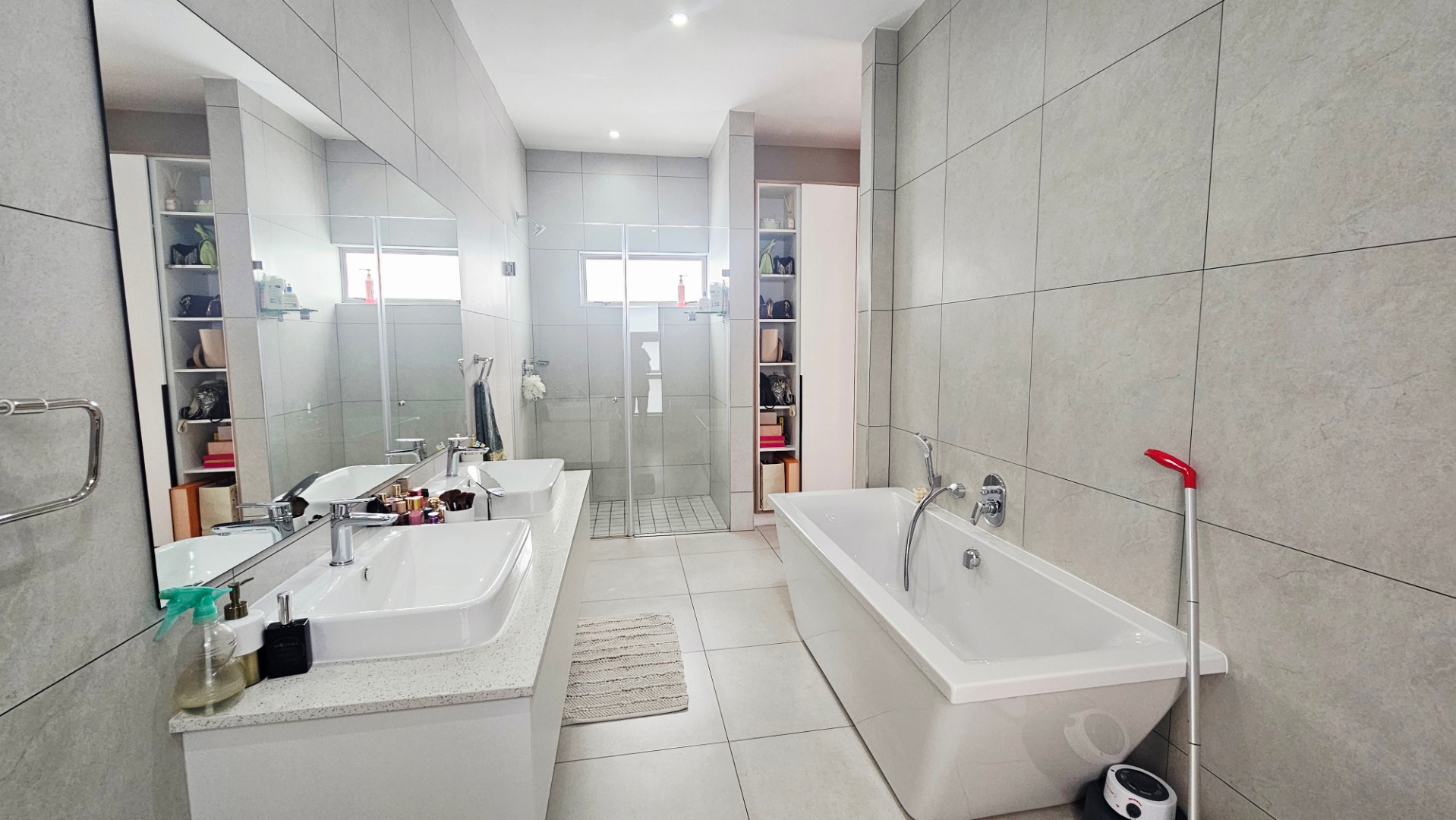 The heart of this home is its sleek, contemporary kitchen, equipped with a large island, integrated hob, ample storage, and a dedicated scullery, designed for both culinary artistry and effortless entertaining. High ceilings, a neutral colour palette, and stylish tiled flooring flow seamlessly throughout, enhanced by special lighting and a striking glass-paneled staircase. Air conditioning ensures year-round comfort, while the seamless transition to a private patio and sparkling pool offers an idyllic setting for relaxation and outdoor enjoyment. Practical amenities include staff quarters and a double garage.
