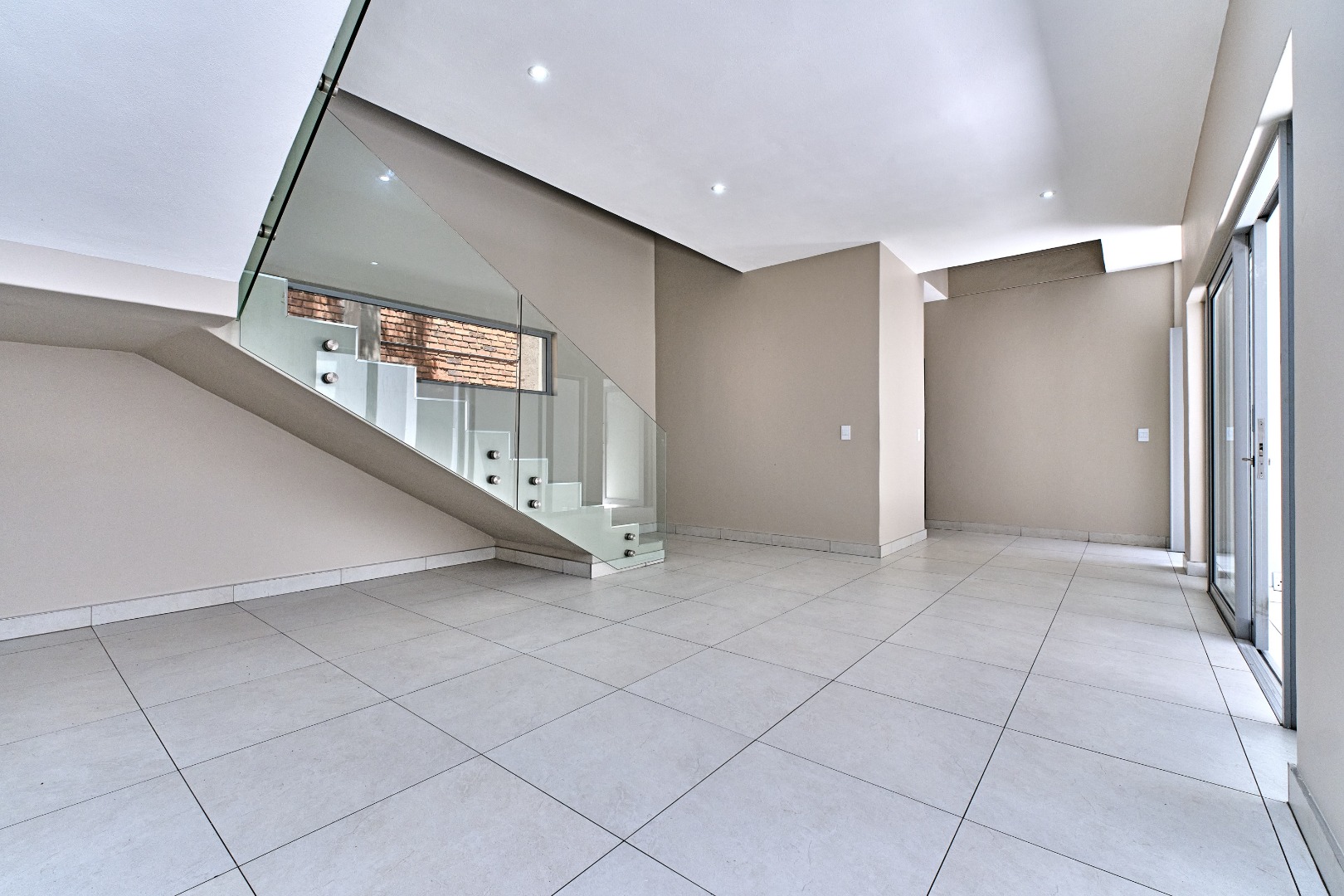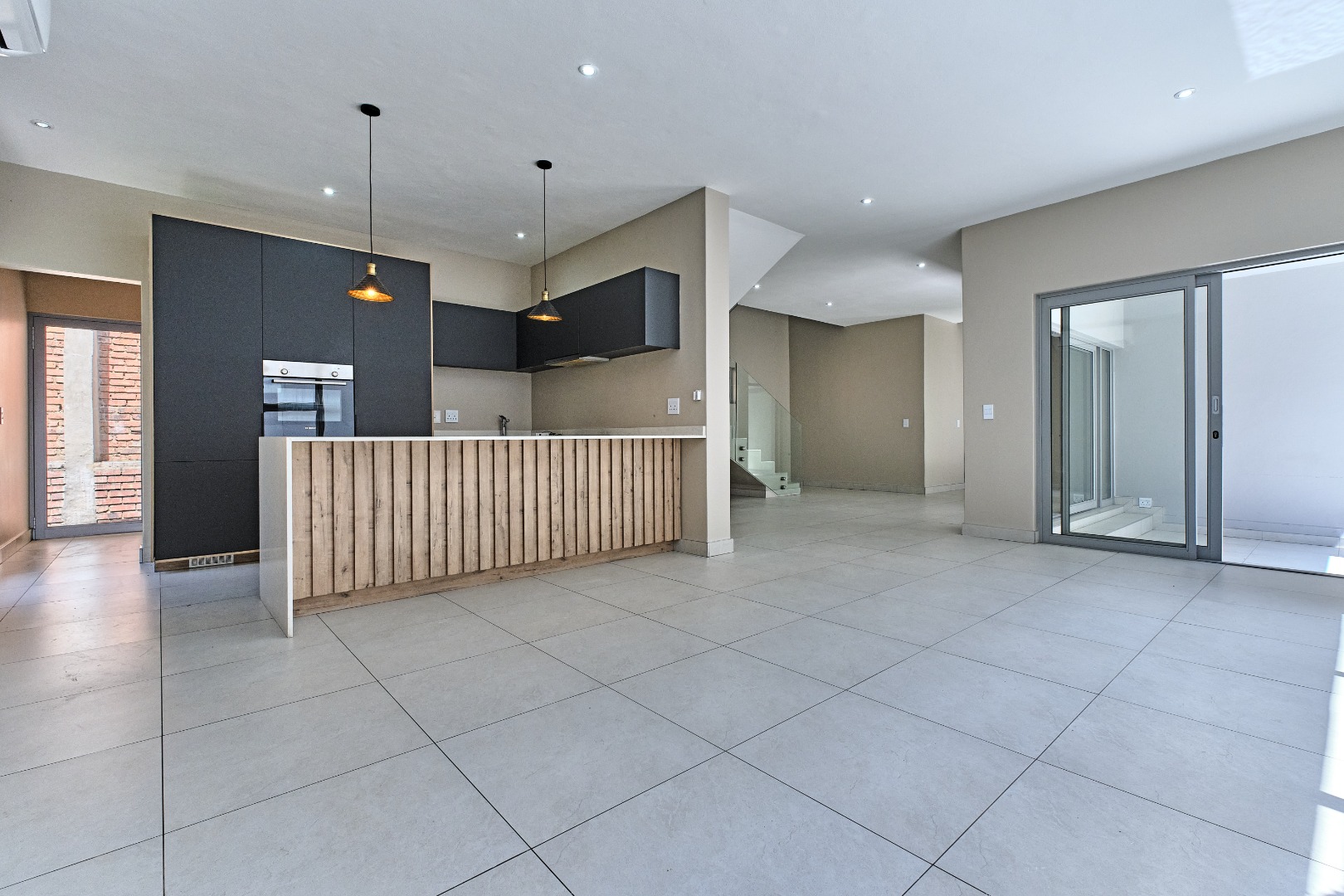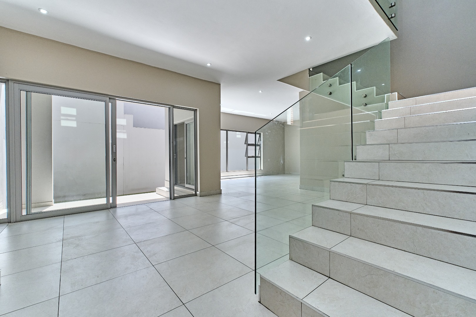 This contemporary unfurnished residence in Bryanston, Sandton, offers a sophisticated living experience within a secure estate. Spanning 258 sqm, the home features an open-plan layout designed for modern comfort. The sleek kitchen boasts wood finish cabinetry, a distinctive wood-slat island, and an integrated oven, seamlessly flowing into the dining area and spacious lounge. Throughout the property, light-toned tiled flooring, recessed lighting, and large sliding glass doors create an airy and bright ambiance, complemented by air conditioning for optimal climate control. A striking glass-railed staircase adds a touch of elegance to the interior design.