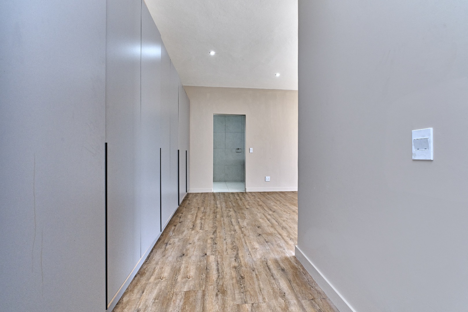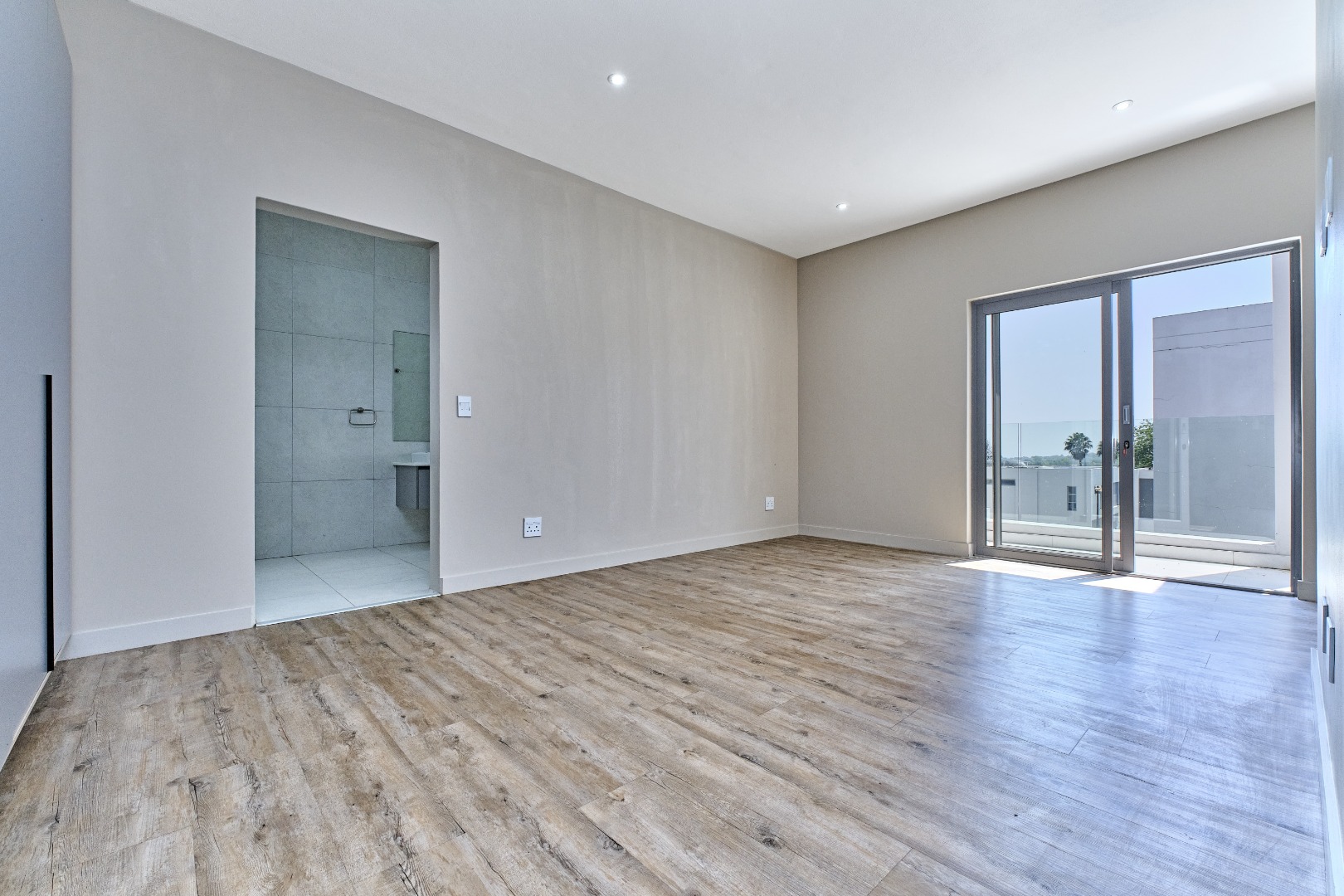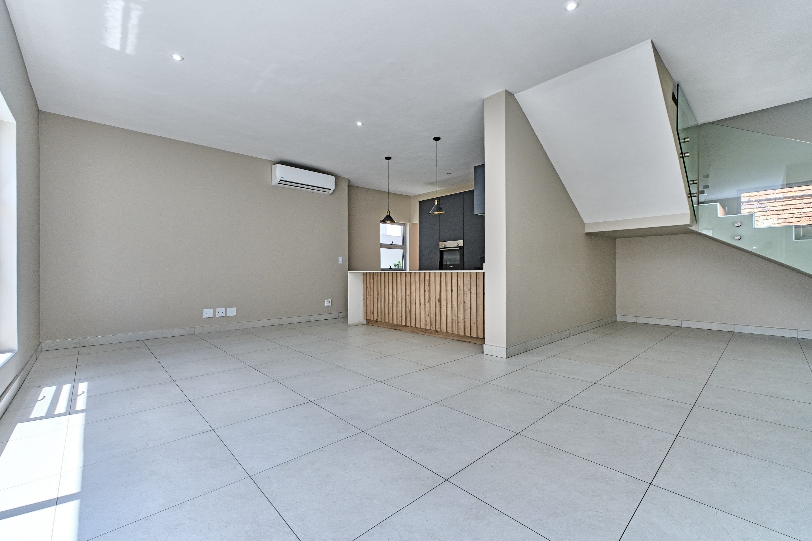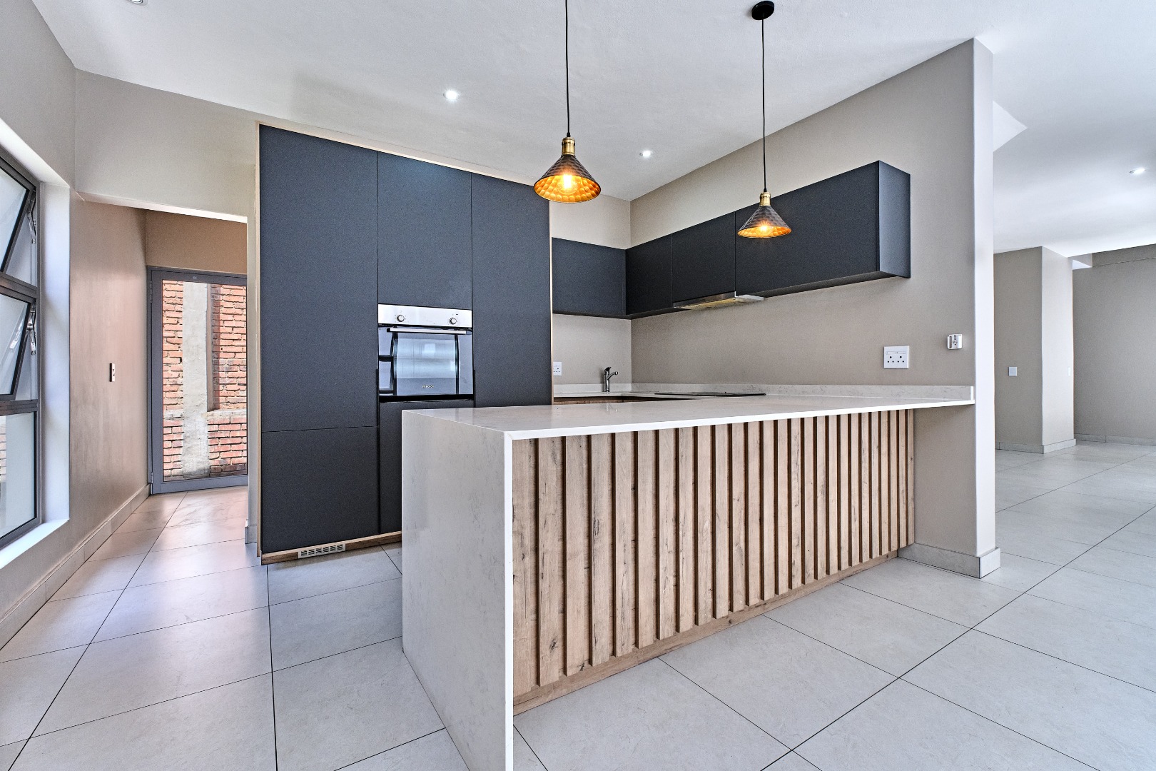 This contemporary unfurnished residence in Bryanston, Sandton, offers a sophisticated living experience within a secure estate. Spanning 258 sqm, the home features an open-plan layout designed for modern comfort. The sleek kitchen boasts wood finish cabinetry, a distinctive wood-slat island, and an integrated oven, seamlessly flowing into the dining area and spacious lounge. Throughout the property, light-toned tiled flooring, recessed lighting, and large sliding glass doors create an airy and bright ambiance, complemented by air conditioning for optimal climate control. A striking glass-railed staircase adds a touch of elegance to the interior design.