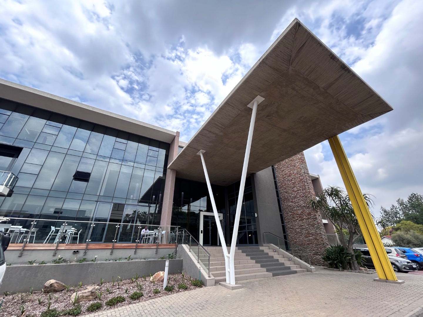 Ideal for a range of professional enterprises, this adaptable space is designed to accommodate diverse business requirements. The exterior is meticulously maintained, featuring attractive landscaping and well-lit paved parking areas. A distinctive cantilevered entrance canopy adds to the building's impressive curb appeal, while excellent exterior lighting enhances safety and ambiance. This commercial offering provides a prime location within Bryanston's vibrant business hub.