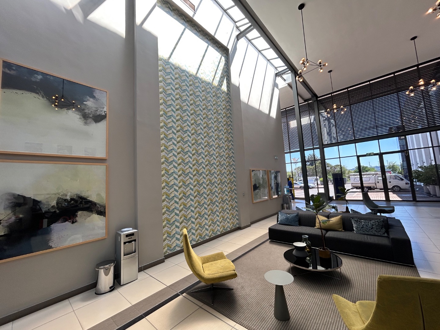 These versatile office suites are ideal for a variety of enterprises, from startups to established corporations, seeking a prestigious address in a prime business district. The building's modern aesthetic and adaptable layouts support diverse operational requirements, promoting productivity and a professional image. The striking multi-story facade, characterized by a clean white exterior and large dark windows, creates a professional first impression. Well-lit reception with signage for office tenants, featuring high ceilings, contemporary design, and stylish furnishings, and a manned desk, ensuring a welcoming and secure environment.