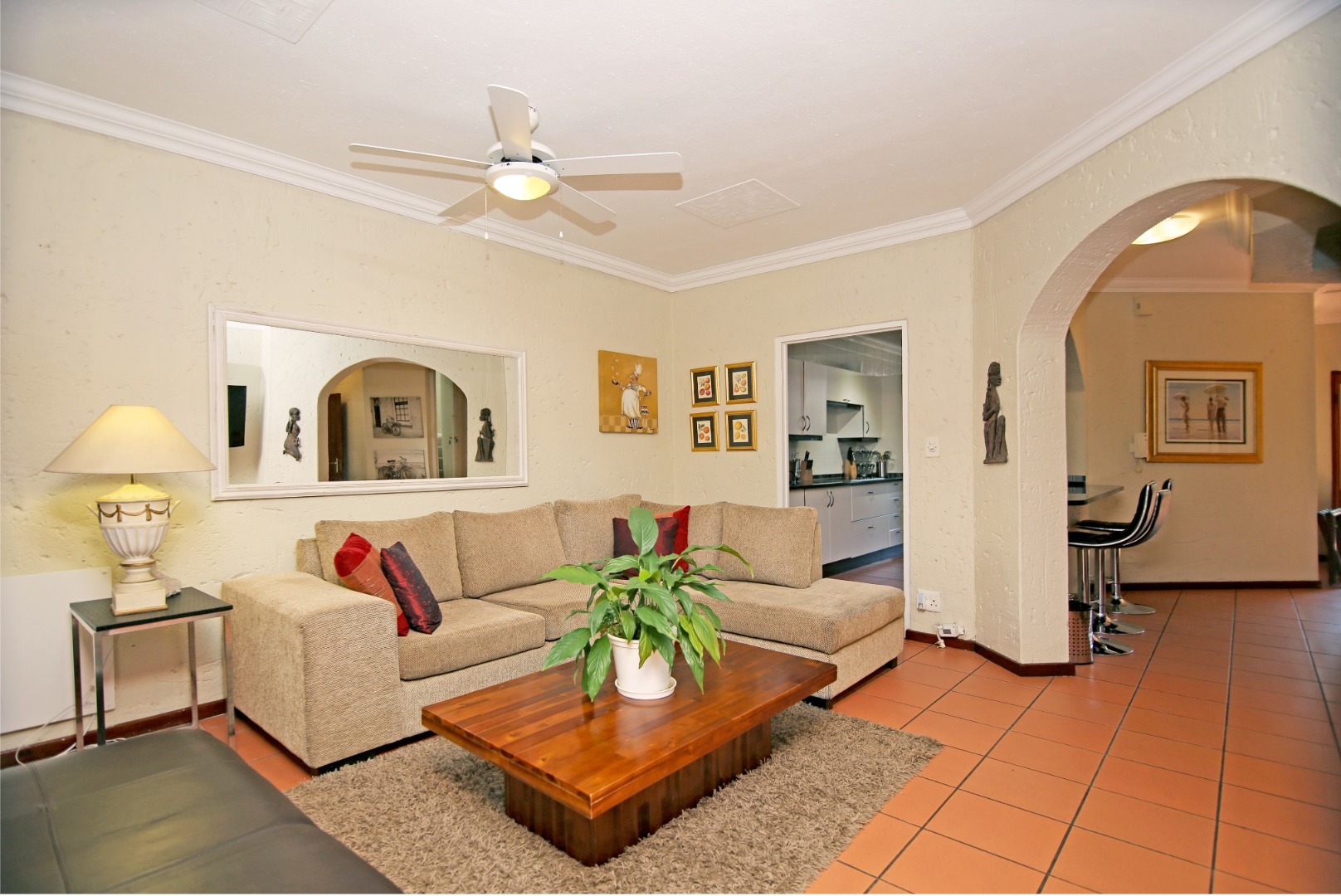 Open-plan kitchen with breakfast bar and separate lounge.