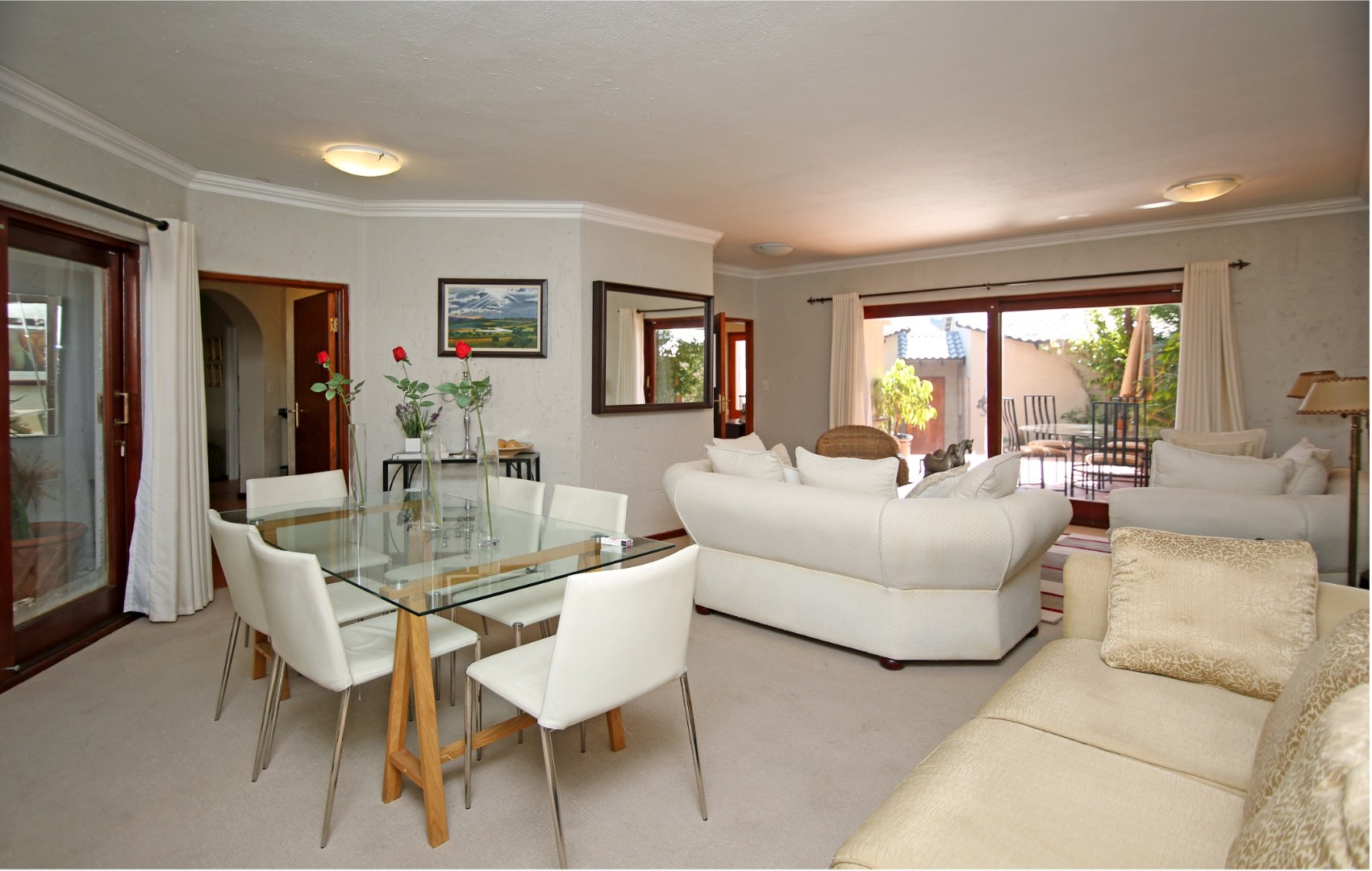 Stylish elegance, bright sun-splashed and stunningly decorated lounge and dining room opening to pretty and private year-round patio.