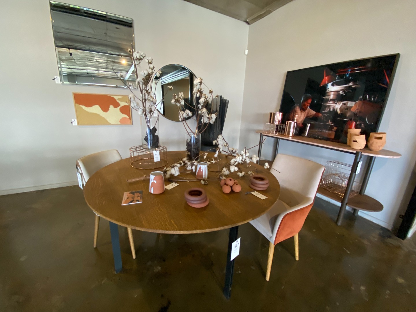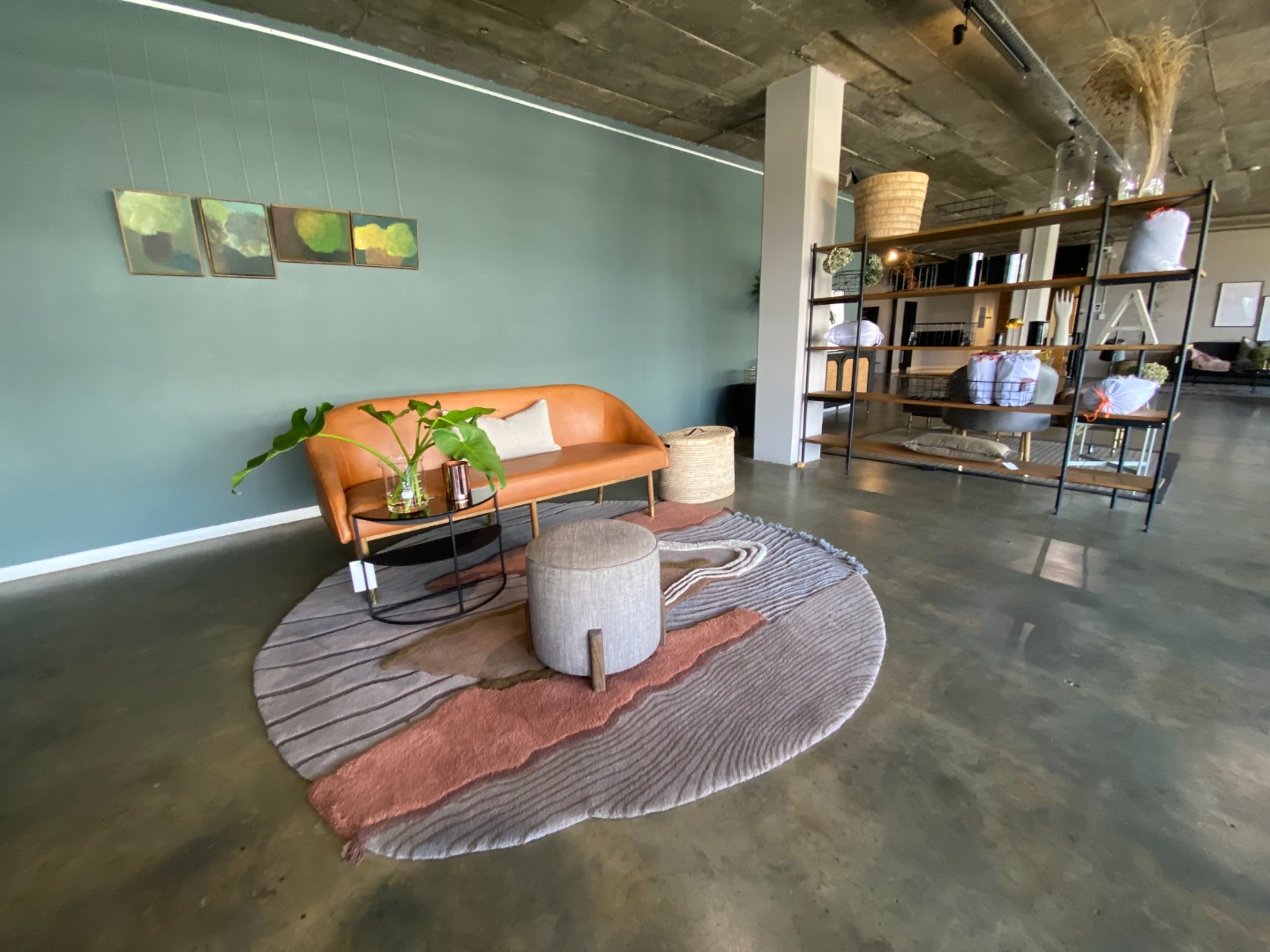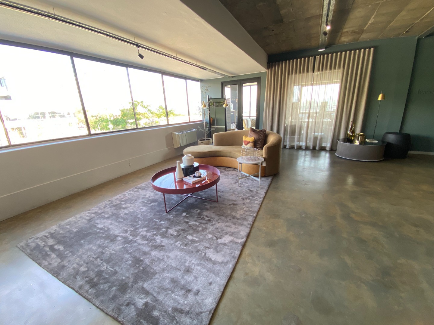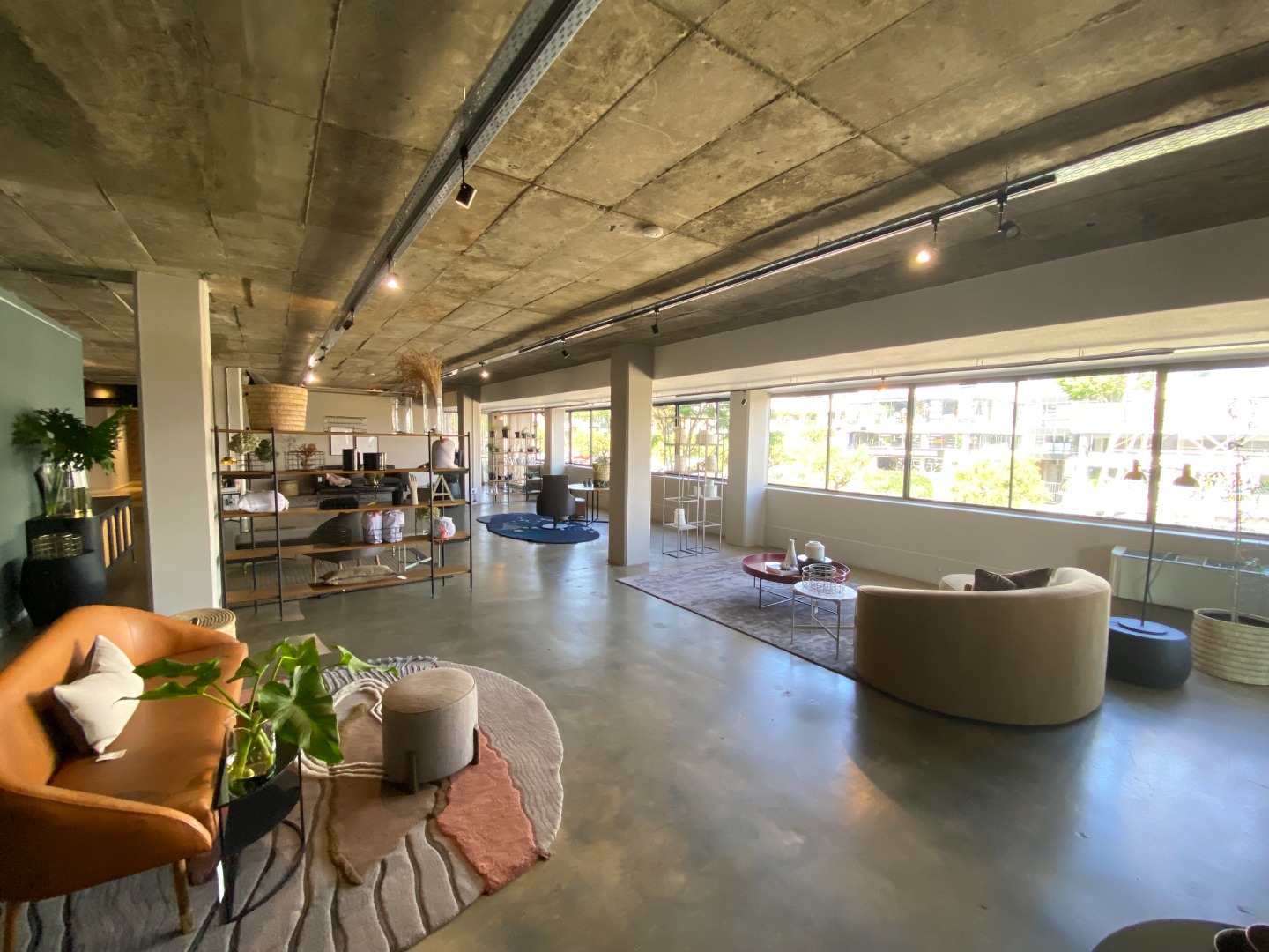 EXISTING LAYOUT - Open plan upmarket showroom polished screed concrete floors, exposed concrete ceilings with feature lighting, private executive office / viewing room,.
