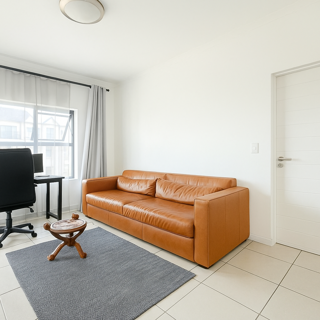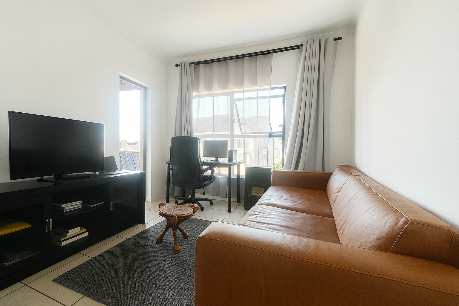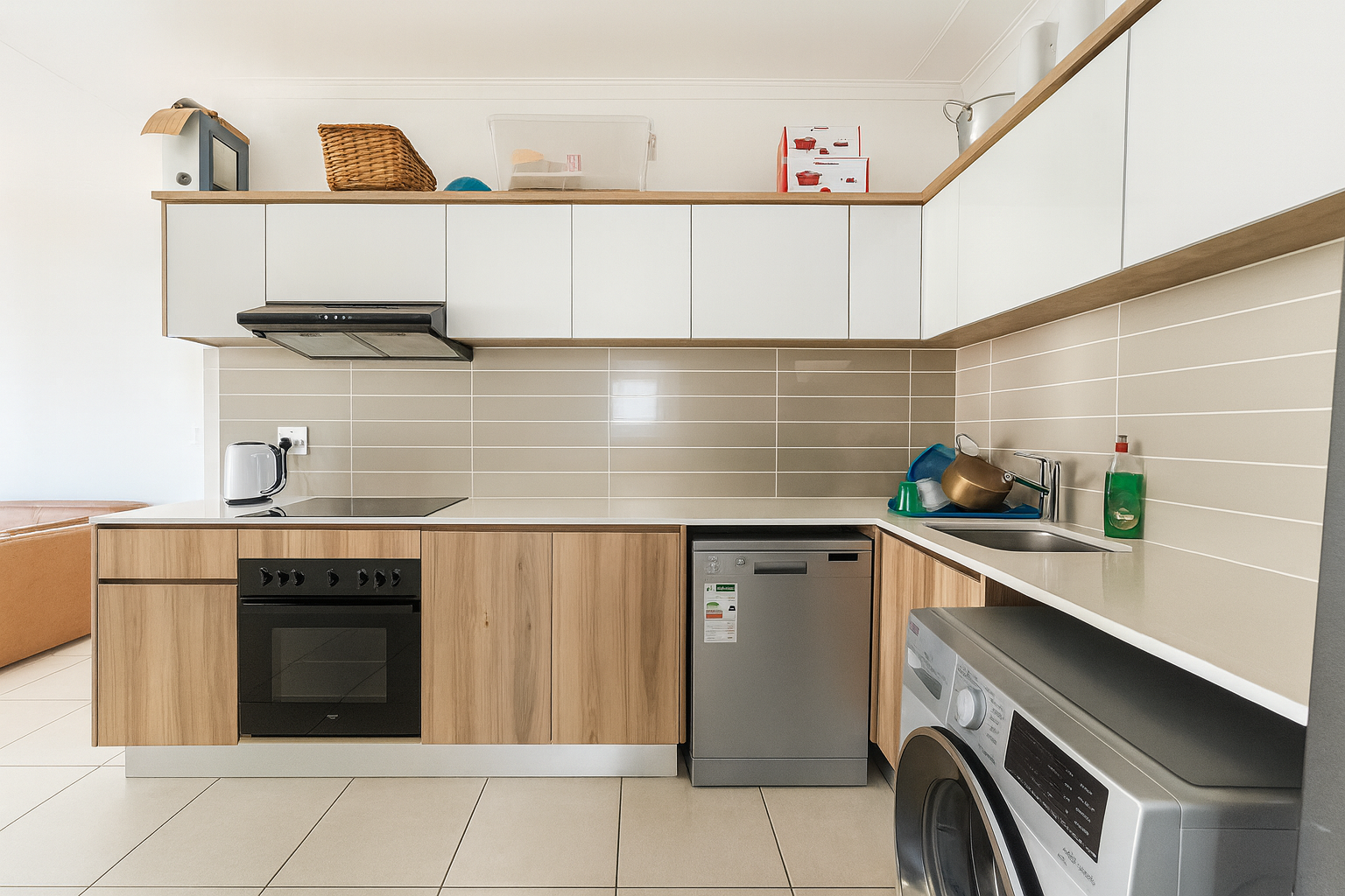 Discover modern living in this stylish 1-bedroom, 1-bathroom apartment located within a secure lifestyle estate in Linbro Park, Sandton. Spanning 48 square metres, this contemporary unit features an open-plan layout that seamlessly integrates the living area with a sleek kitchen. The kitchen is well-appointed with modern two-tone cabinetry, light tiled flooring, and includes essential integrated appliances such as an oven, hob, dishwasher, and a washing machine, ensuring convenience and a clean aesthetic. The bright living space extends to a private balcony through sliding doors, offering an ideal spot for relaxation.