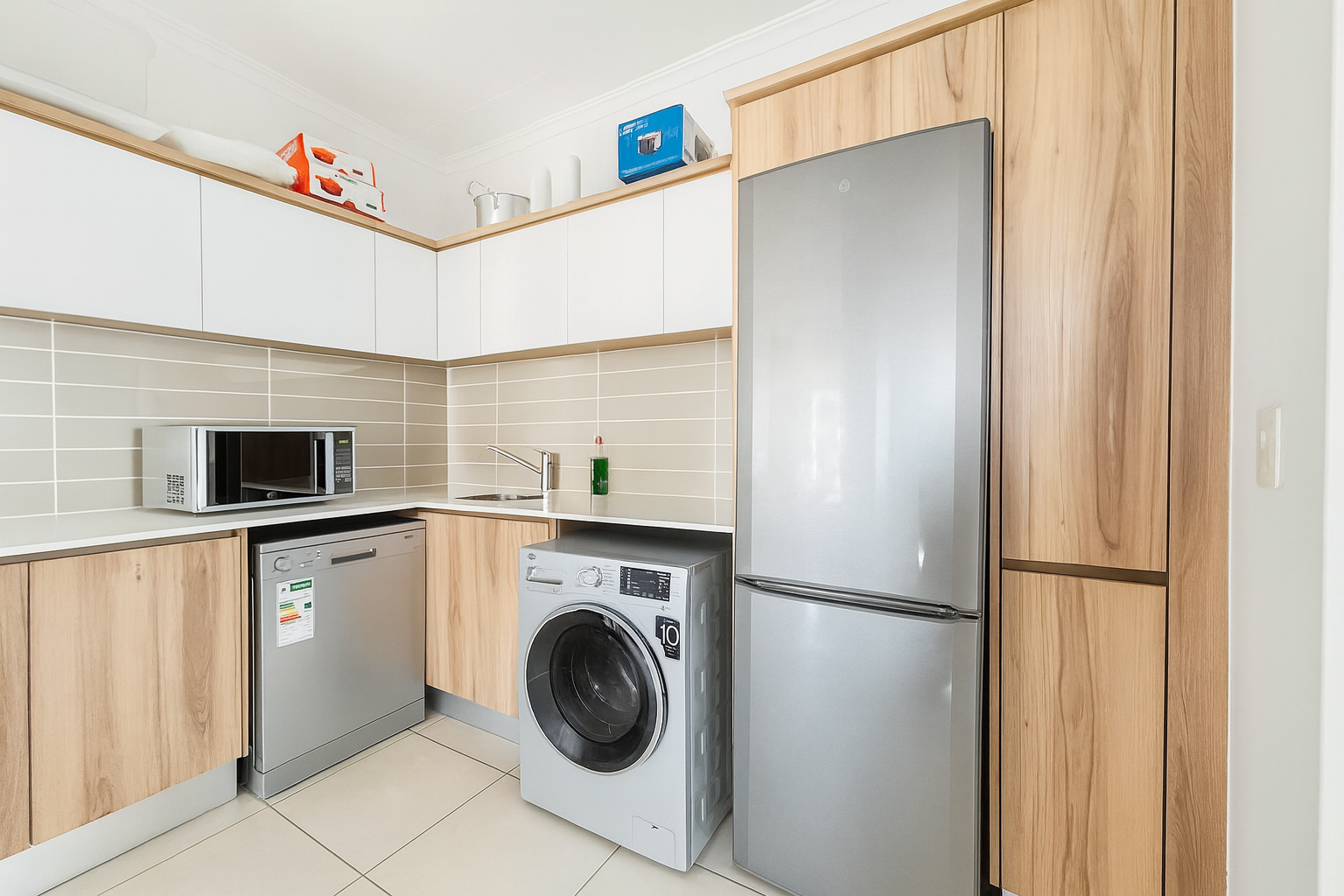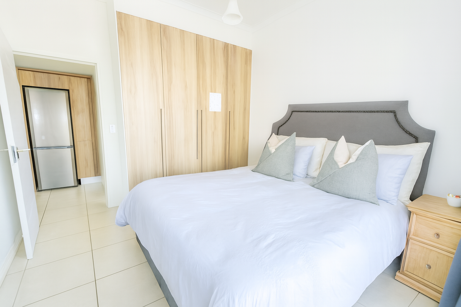 The bedroom is designed for comfort, boasting light wood built-in wardrobes that provide ample storage, complemented by a neutral colour palette and tiled flooring. This apartment is perfectly suited for professionals or individuals seeking a lock-up-and-go lifestyle within a vibrant community. Residents benefit from a dedicated parking bay and access to an array of world-class amenities at The Reid Lifestyle Centre, including a swimming pool, fully equipped gym, clubhouse, and squash court, alongside practical services like a wash zone and dry cleaning.