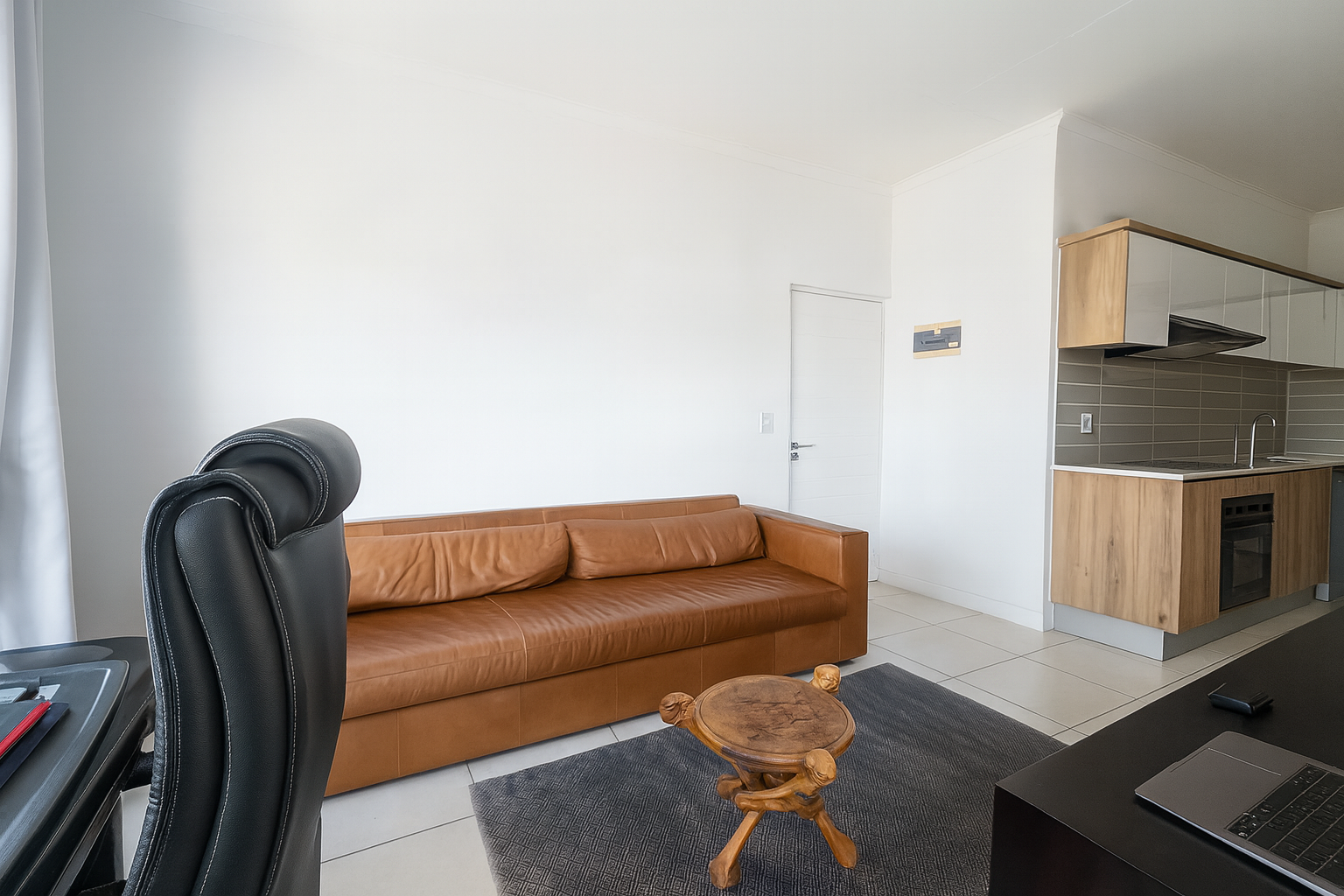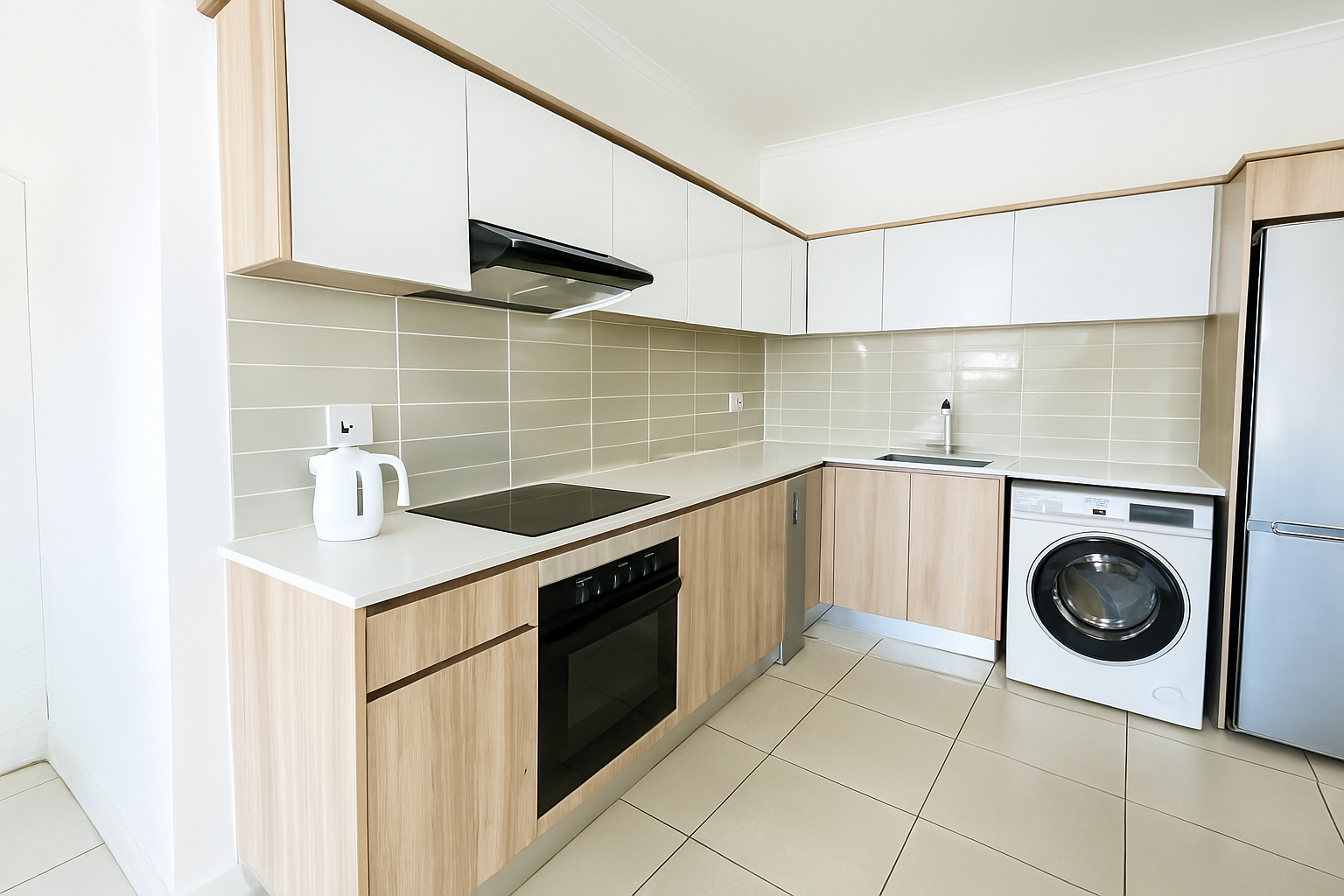 Discover modern living in this stylish 1-bedroom, 1-bathroom apartment located within a secure lifestyle estate in Linbro Park, Sandton. Spanning 48 square metres, this contemporary unit features an open-plan layout that seamlessly integrates the living area with a sleek kitchen. The kitchen is well-appointed with modern two-tone cabinetry, light tiled flooring, and includes essential integrated appliances such as an oven, hob, dishwasher, and a washing machine, ensuring convenience and a clean aesthetic. The bright living space extends to a private balcony through sliding doors, offering an ideal spot for relaxation.