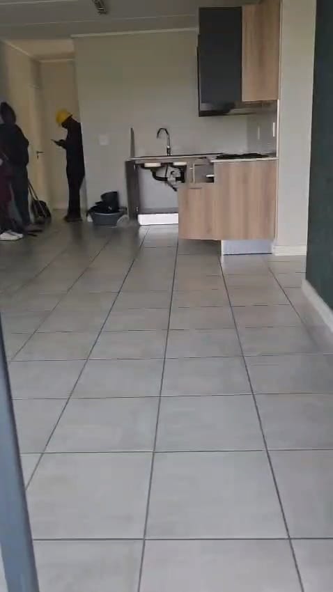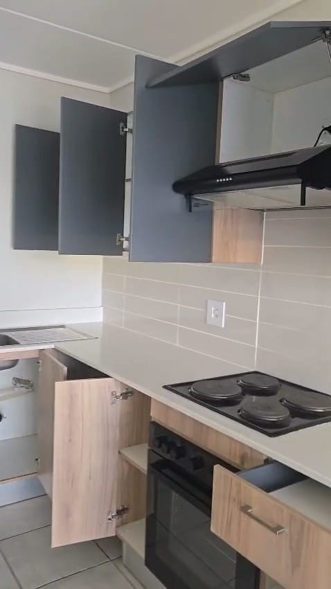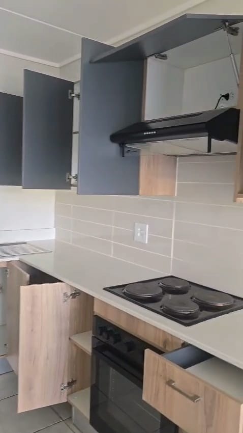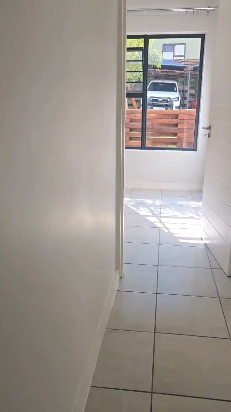 The home features a contemporary kitchen with two-tone cabinetry, integrated hob, oven and extractor, flowing into a bright, tiled lounge area filled with natural light. Sliding doors open onto a private patio and well-maintained garden — perfect for relaxing or entertaining.