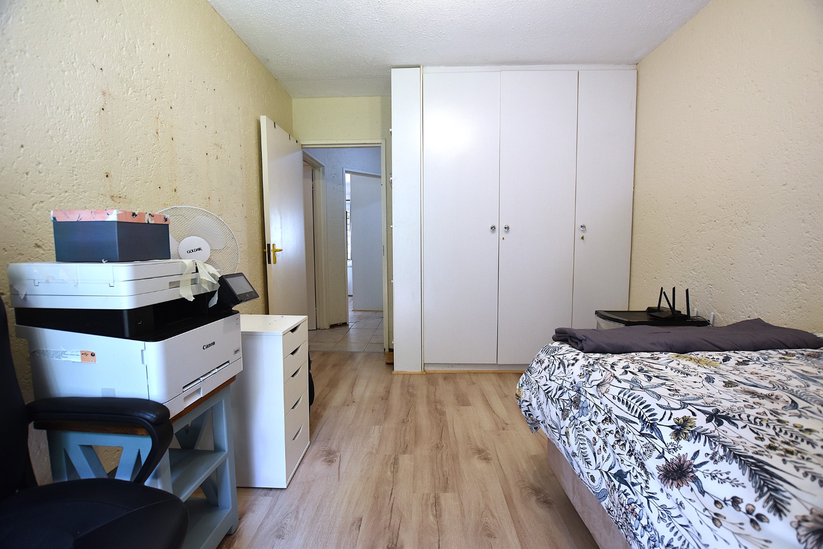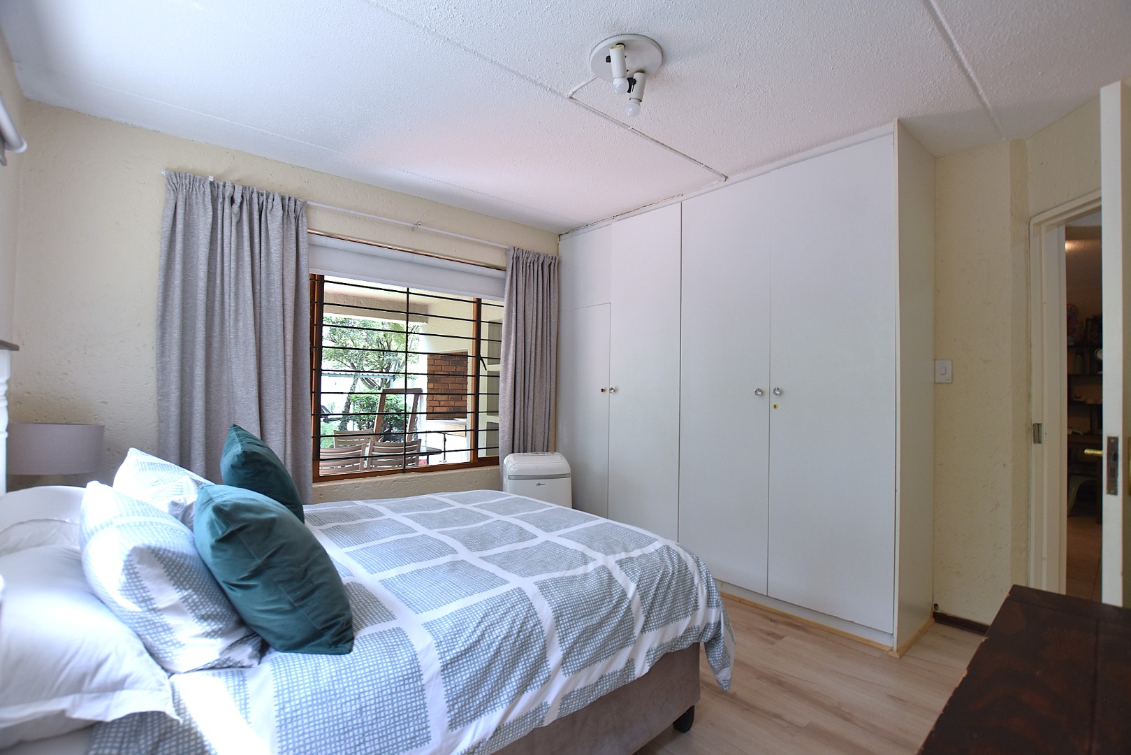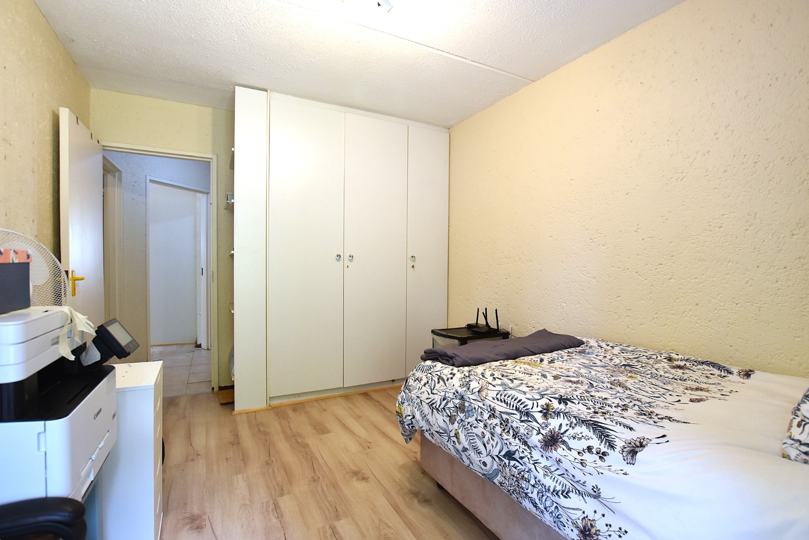 The apartment comprises two spacious bedrooms, each fitted with laminated flooring and built-in white wardrobes, providing generous storage.