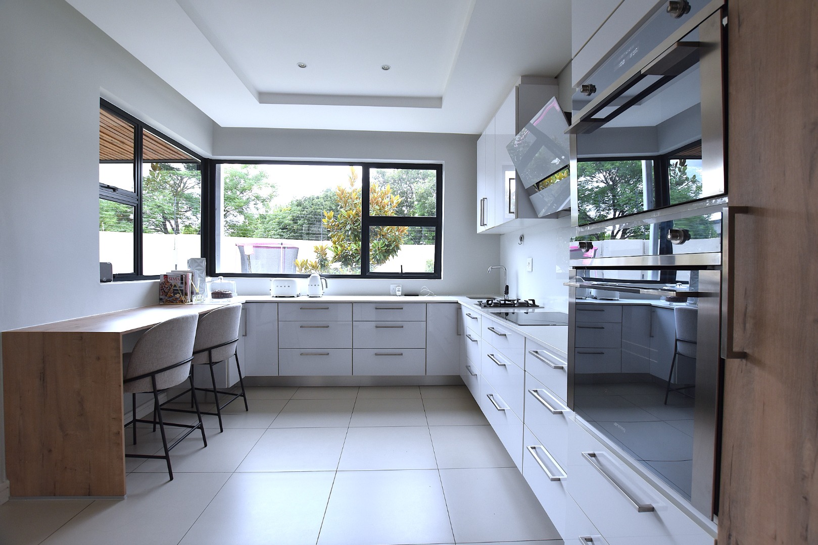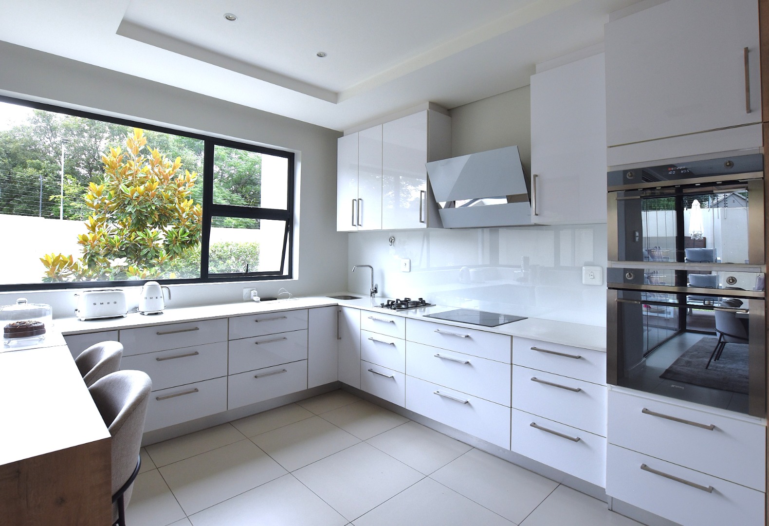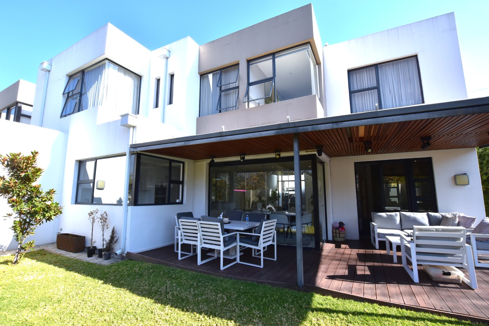 This contemporary 4-bedroom, 5-bathroom residence offers an exceptional rental opportunity in a sought-after Sandton location. Modern, open-plan design that seamlessly integrates living, dining, and kitchen spaces. The sleek kitchen is a highlight, featuring white cabinetry, integrated double ovens, a gas hob, a convenient pantry, and a stylish breakfast bar, all bathed in natural light. Two spacious lounges provide ample room for relaxation and entertainment, complemented by an integrated fireplace and air conditioning.