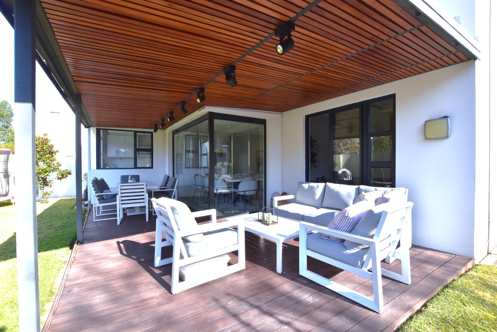 The property extends its appeal outdoors with excellent indoor-outdoor flow. Large sliding glass doors lead to a generous wooden deck and covered patio, perfect for dining and entertaining. A private swimming pool and a dedicated braai room enhance the lifestyle offerings, all set within a well-maintained garden. Practical amenities include a double garage and staff quarters, providing additional convenience.